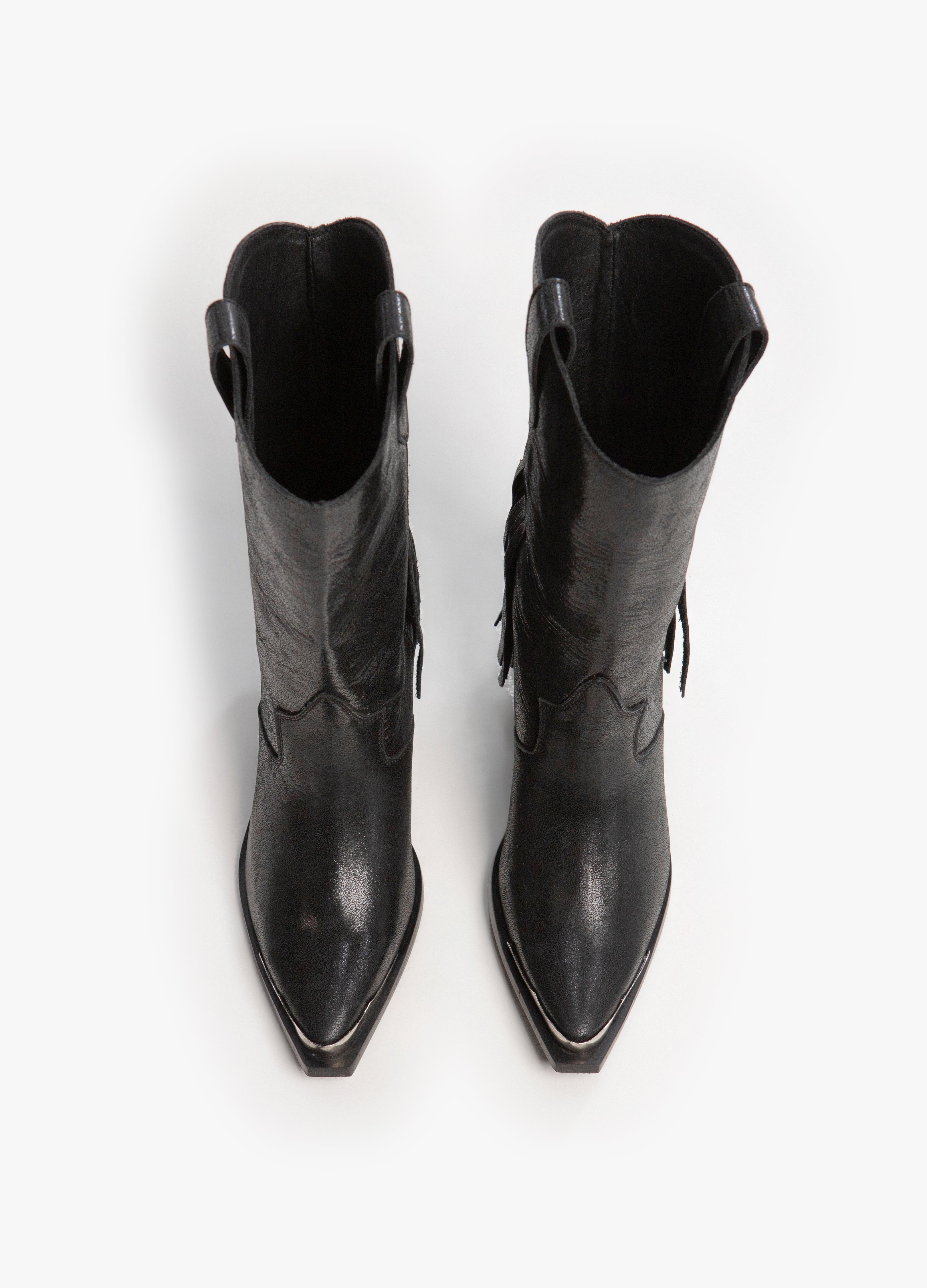 Cowboy boot (high tube) made of cowhide with a black glazed finish, Cuban heel, metal toe and characteristic barbs on the back.