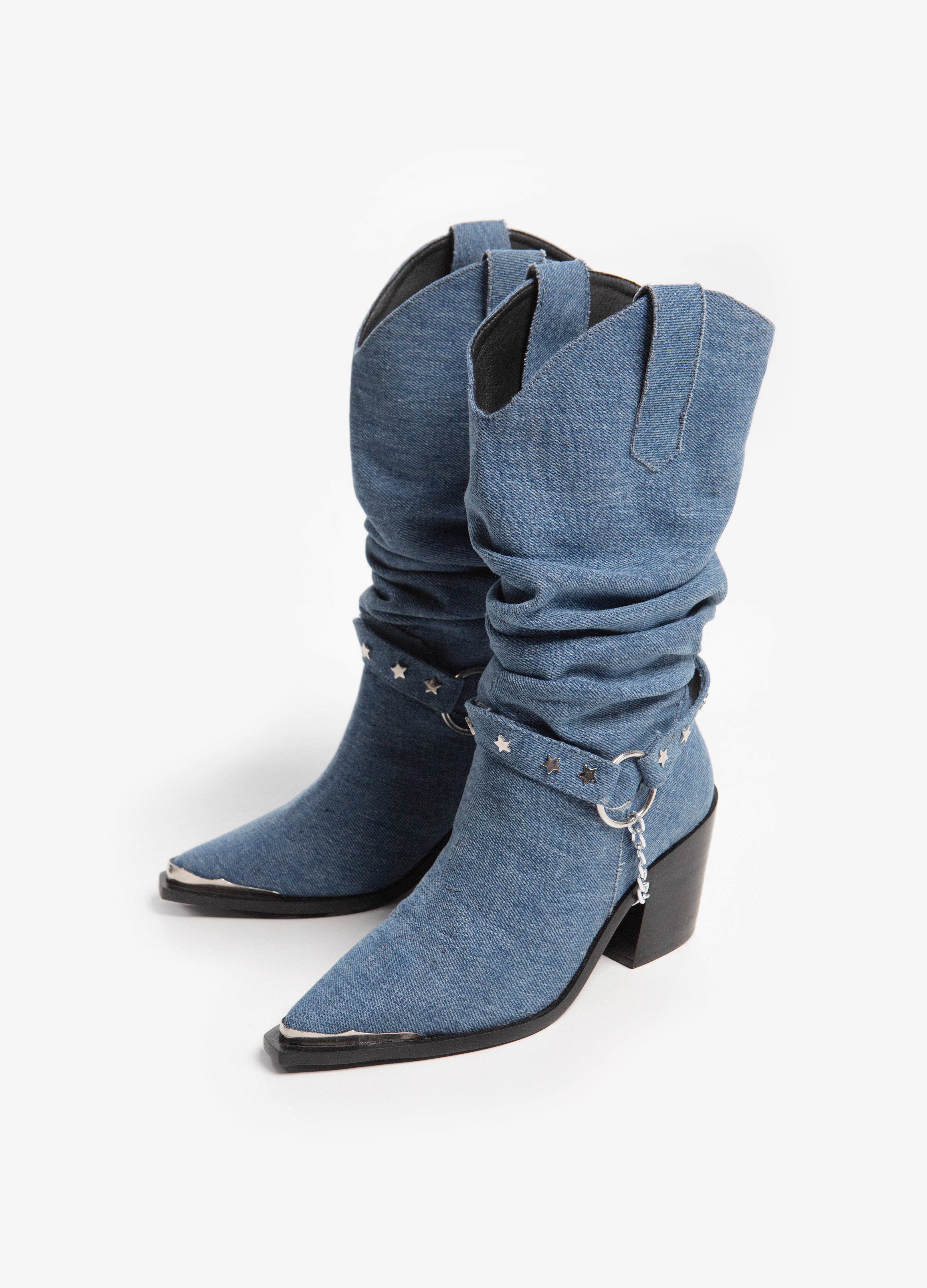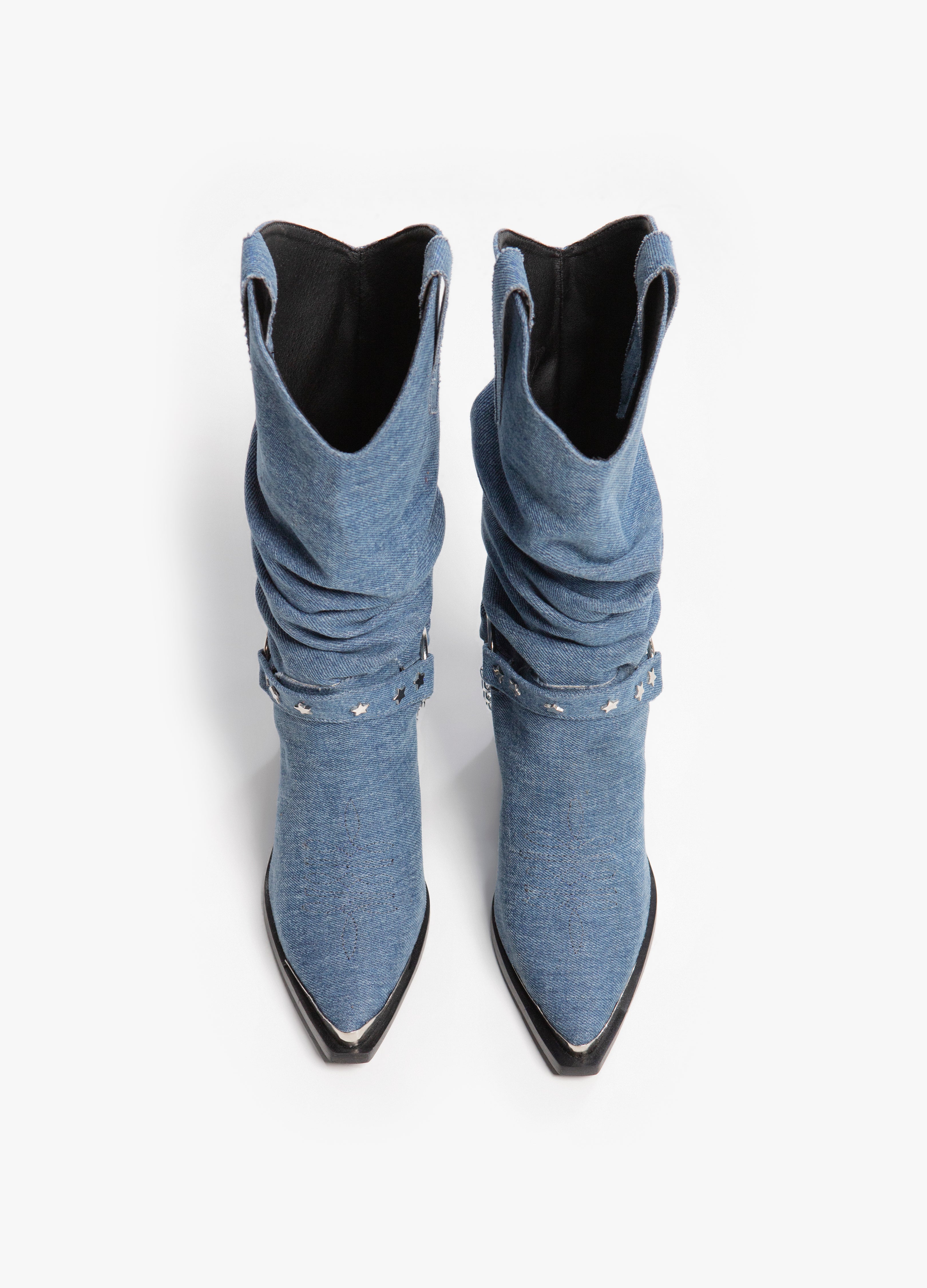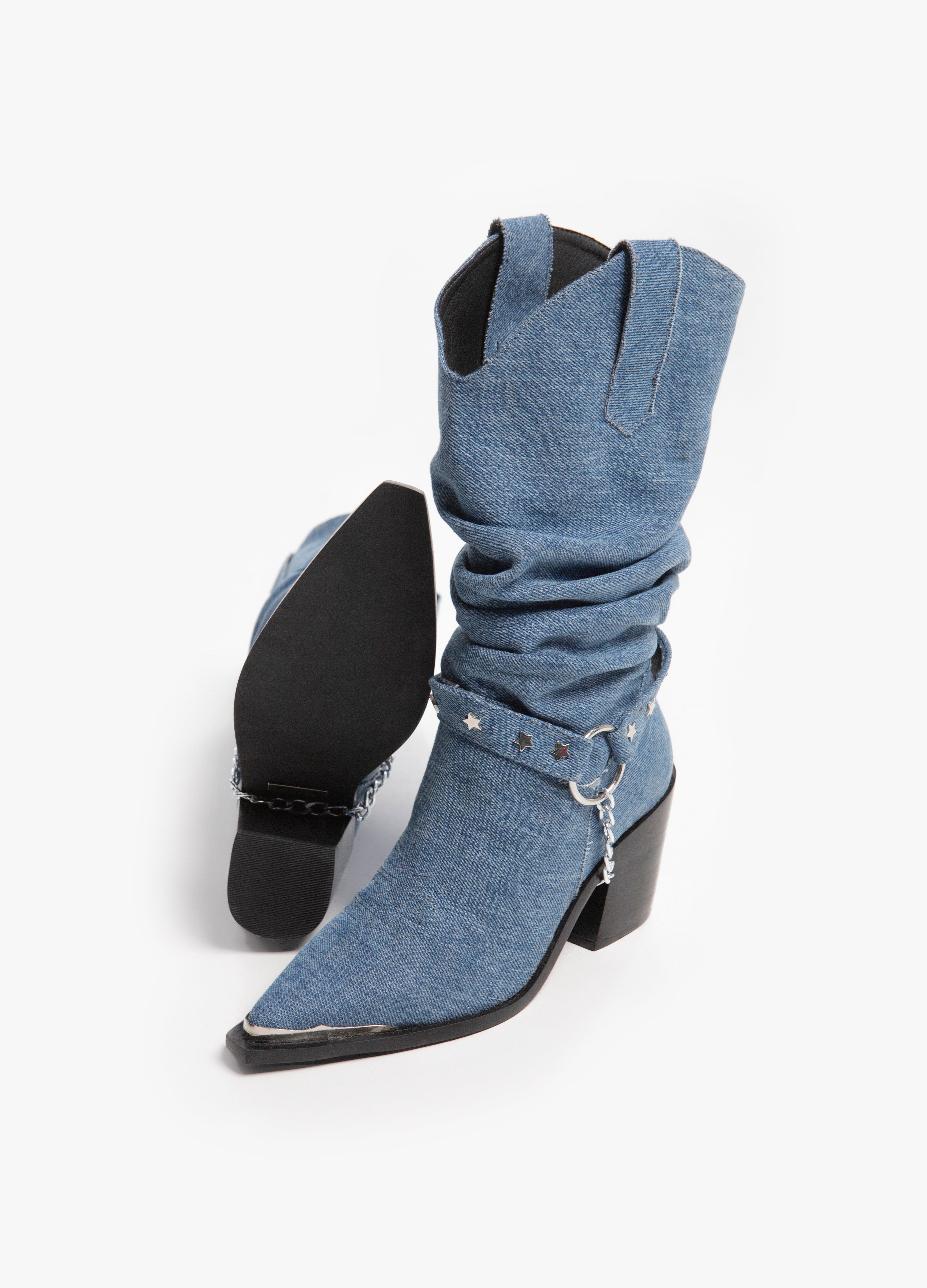 Cowboy boot with a wrinkled tube made of classic blue denim, Cuban heel, metallic toe and a harness with a removable chain.