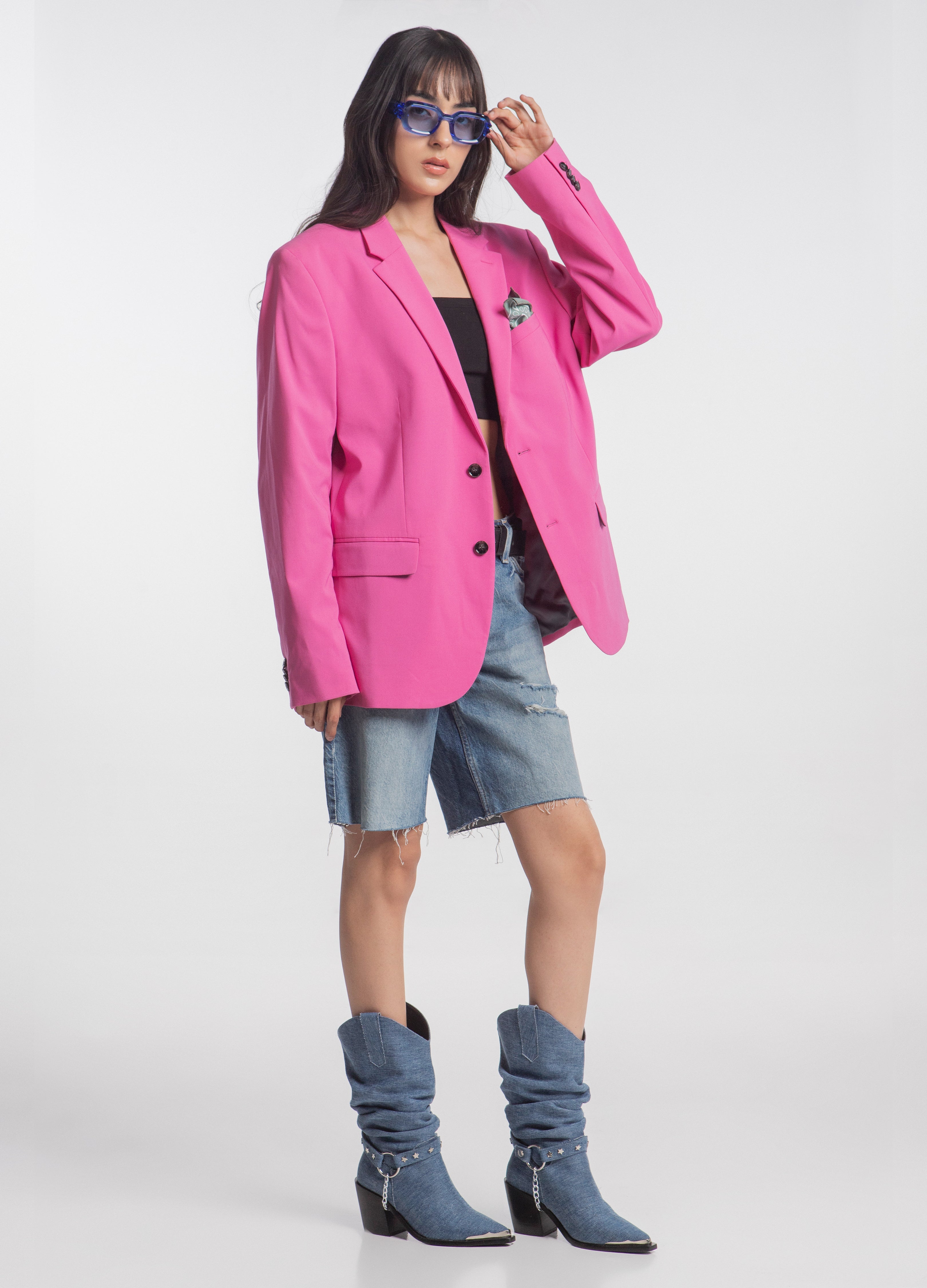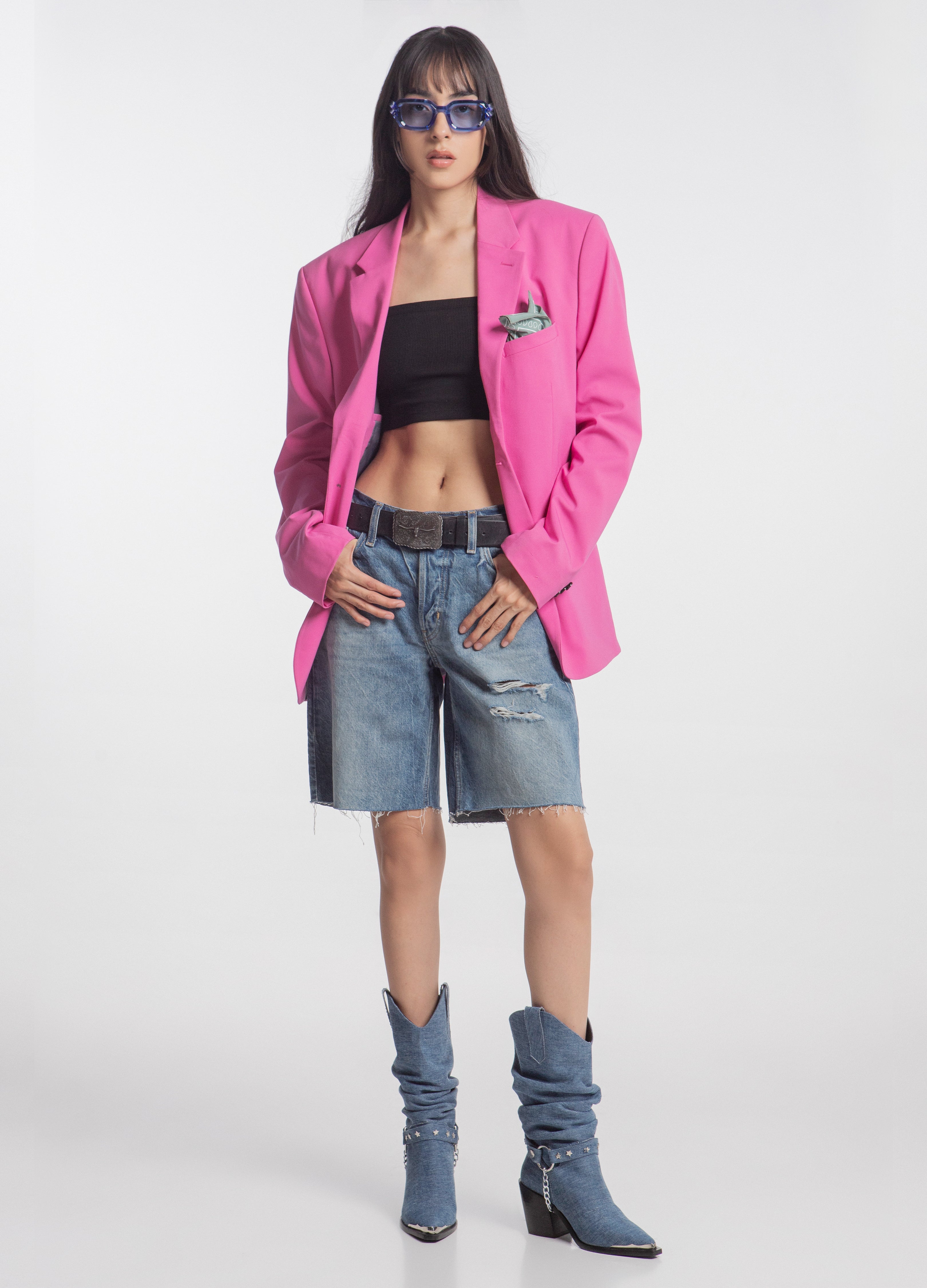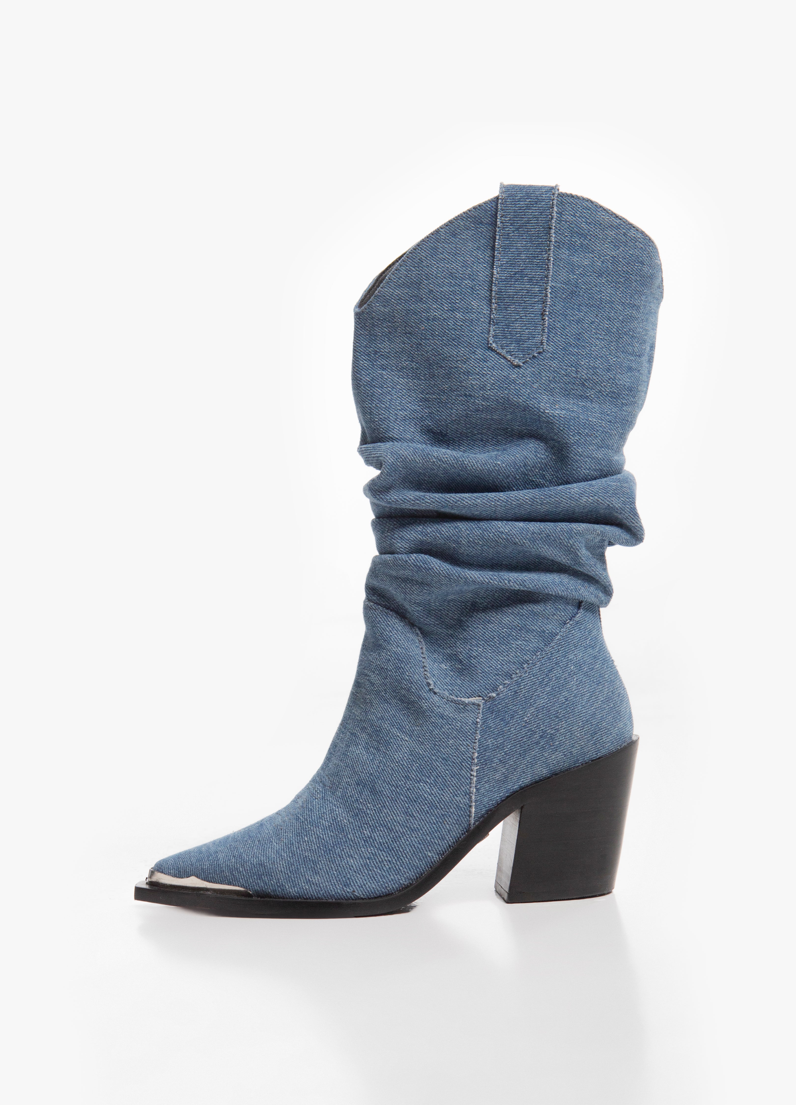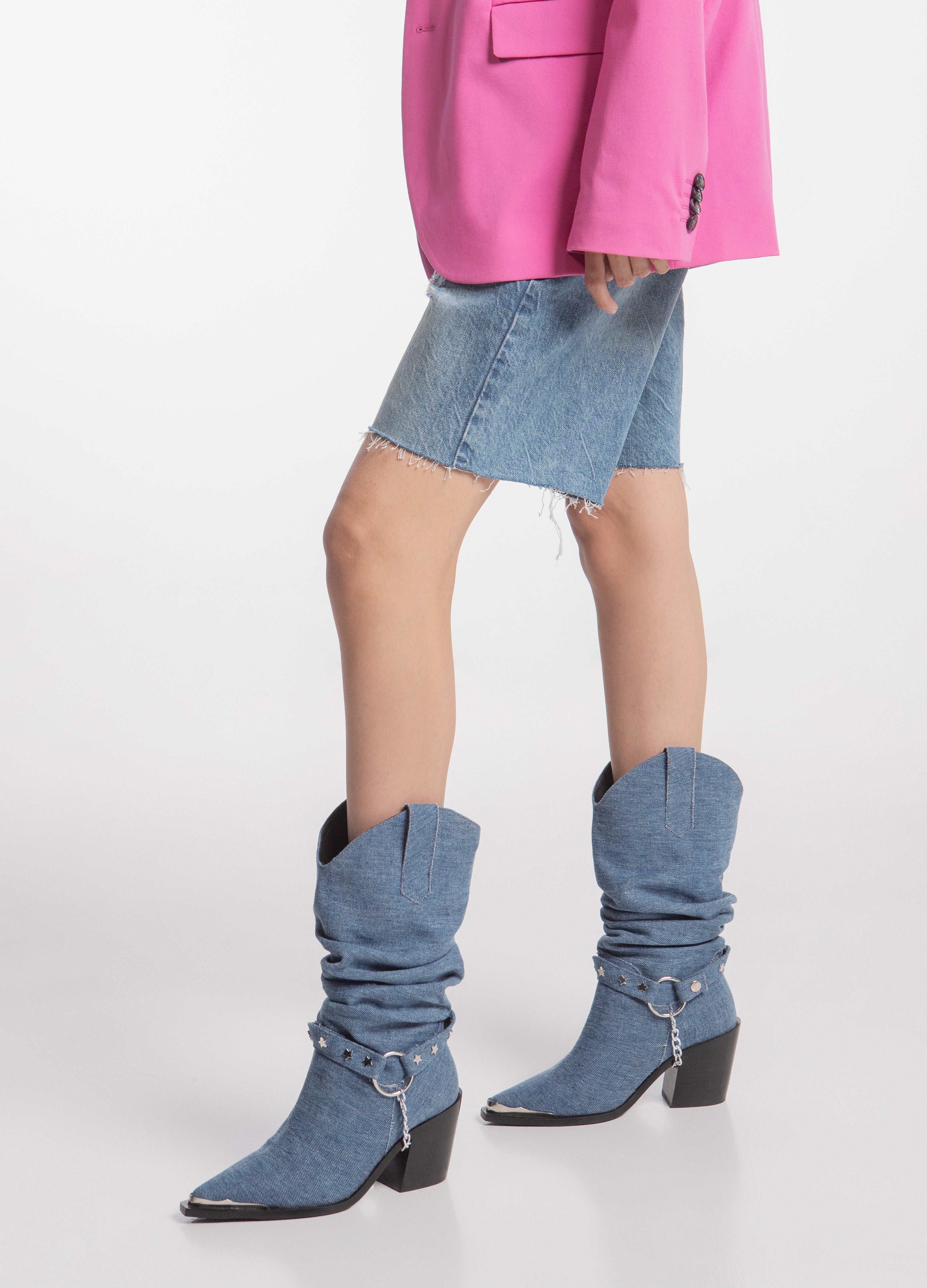 Cowboy boot with a wrinkled tube made of classic blue denim, Cuban heel, metallic toe and a harness with a removable chain.