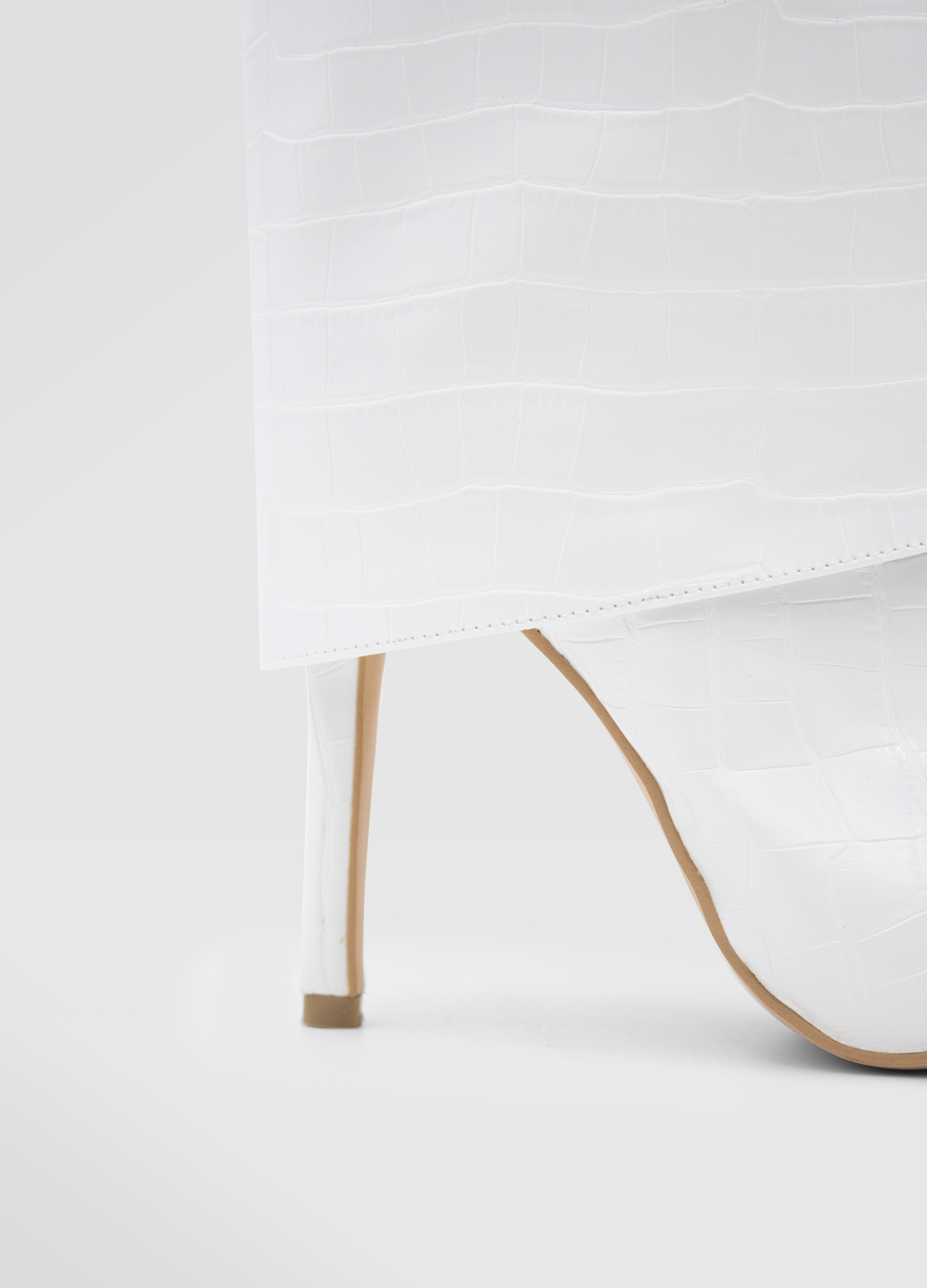 The croco boot is a combination of a high heel with a high straight tube that simulates a tall boot.