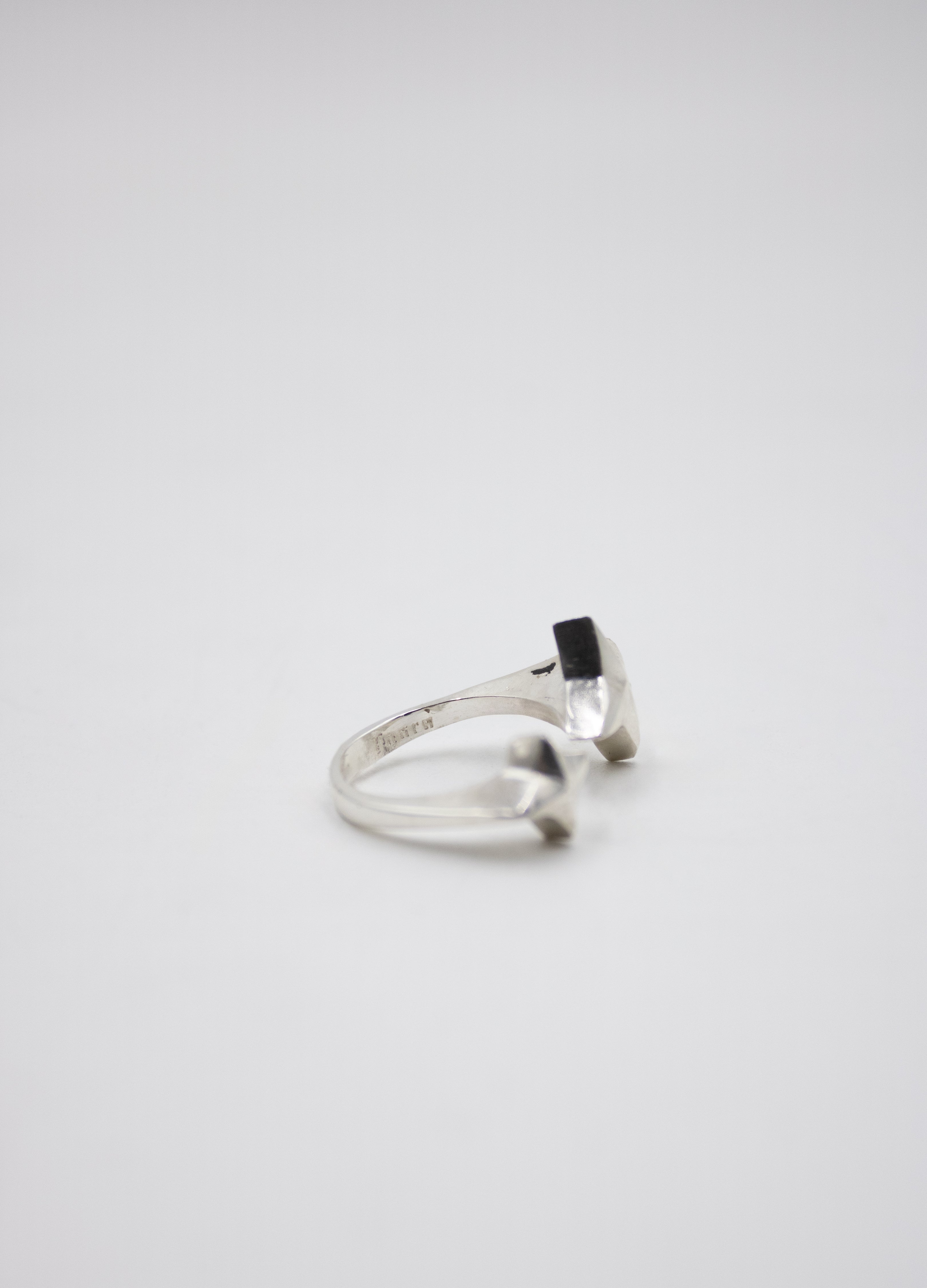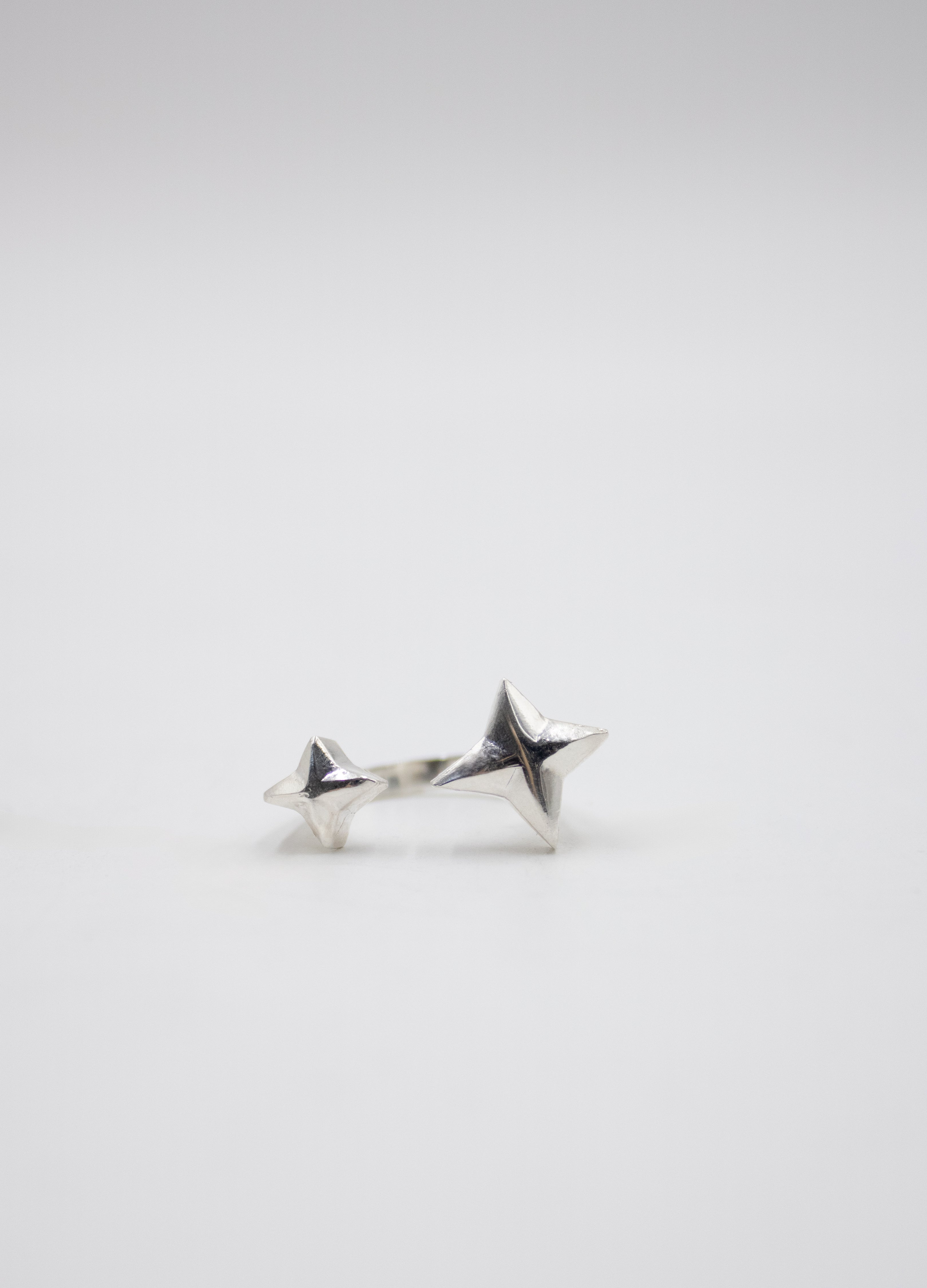 Este anillo abierto está elaborado en plata esterlina .925, diseñada para resistir el paso del tiempo sin perder su brillo natural. Presenta dos estrellas tridimensionales en corte geométrico, que emergen desde los extremos del aro con un acabado pulido tipo espejo. Su diseño asimétrico genera una estética celestial y moderna.