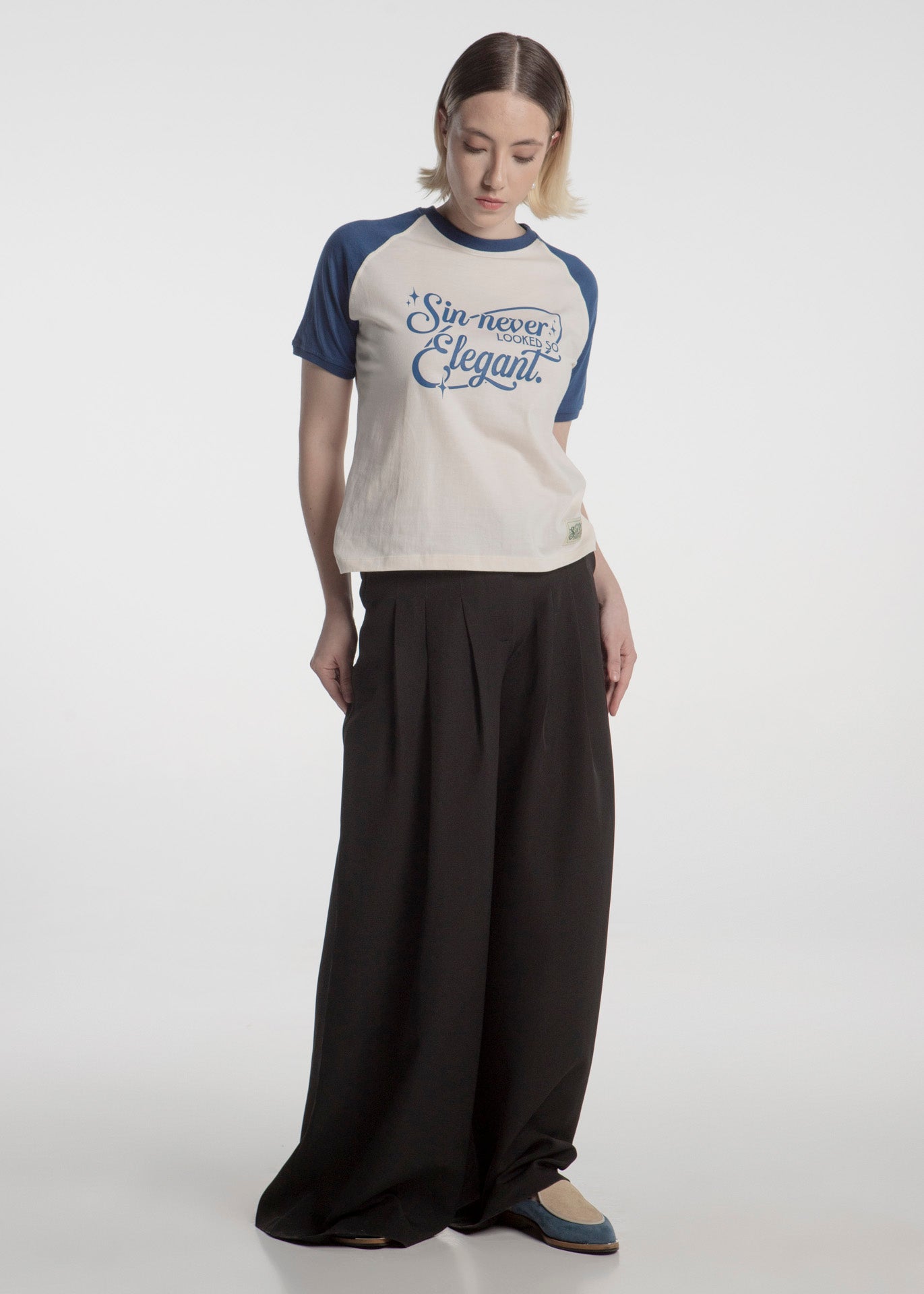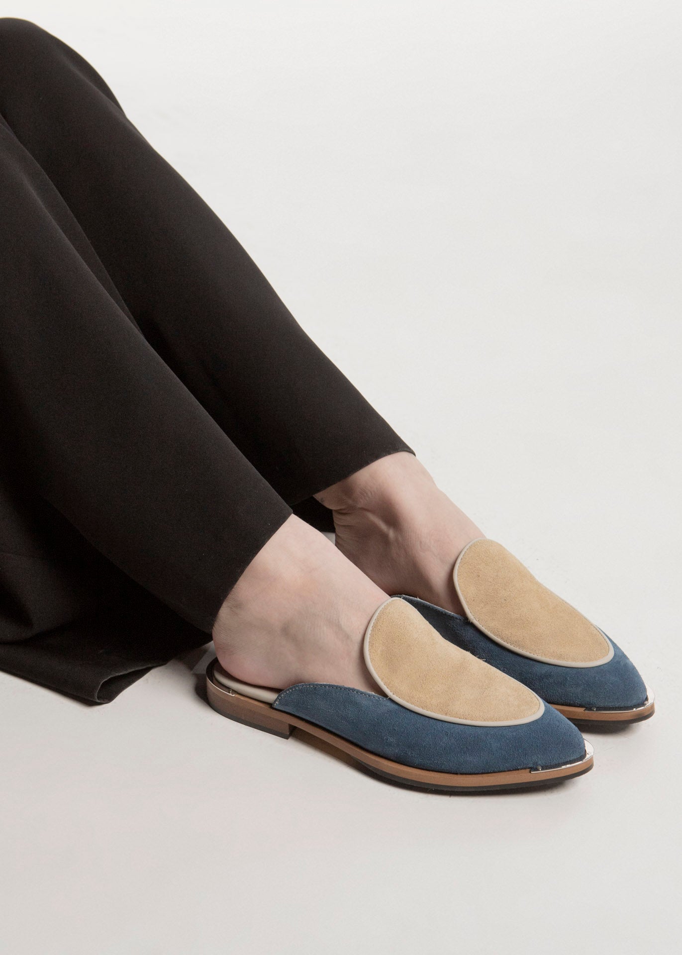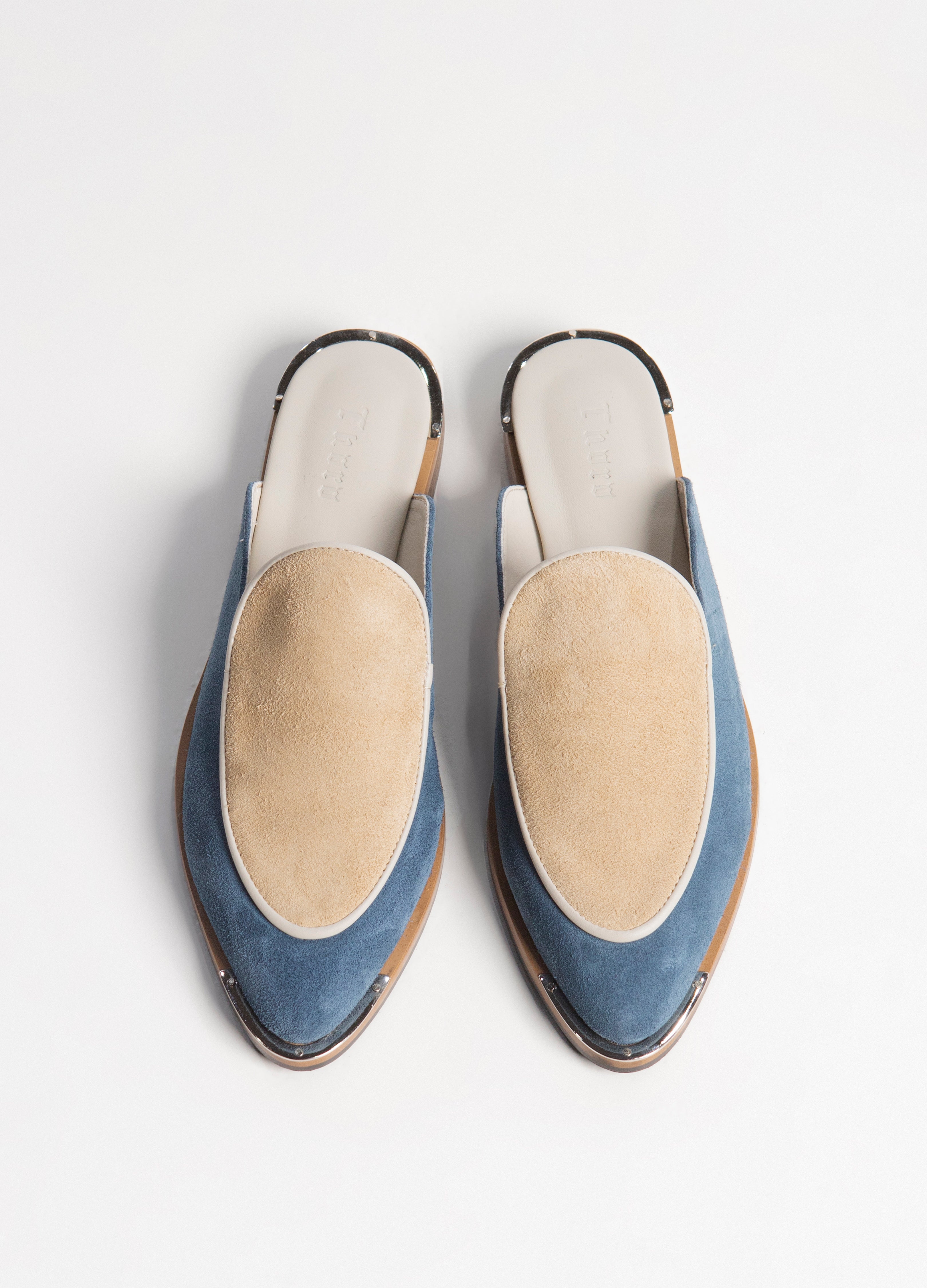 Mule flat bicolor fabricado en piel gamuza en color azul y hueso con suela antiderrapante.