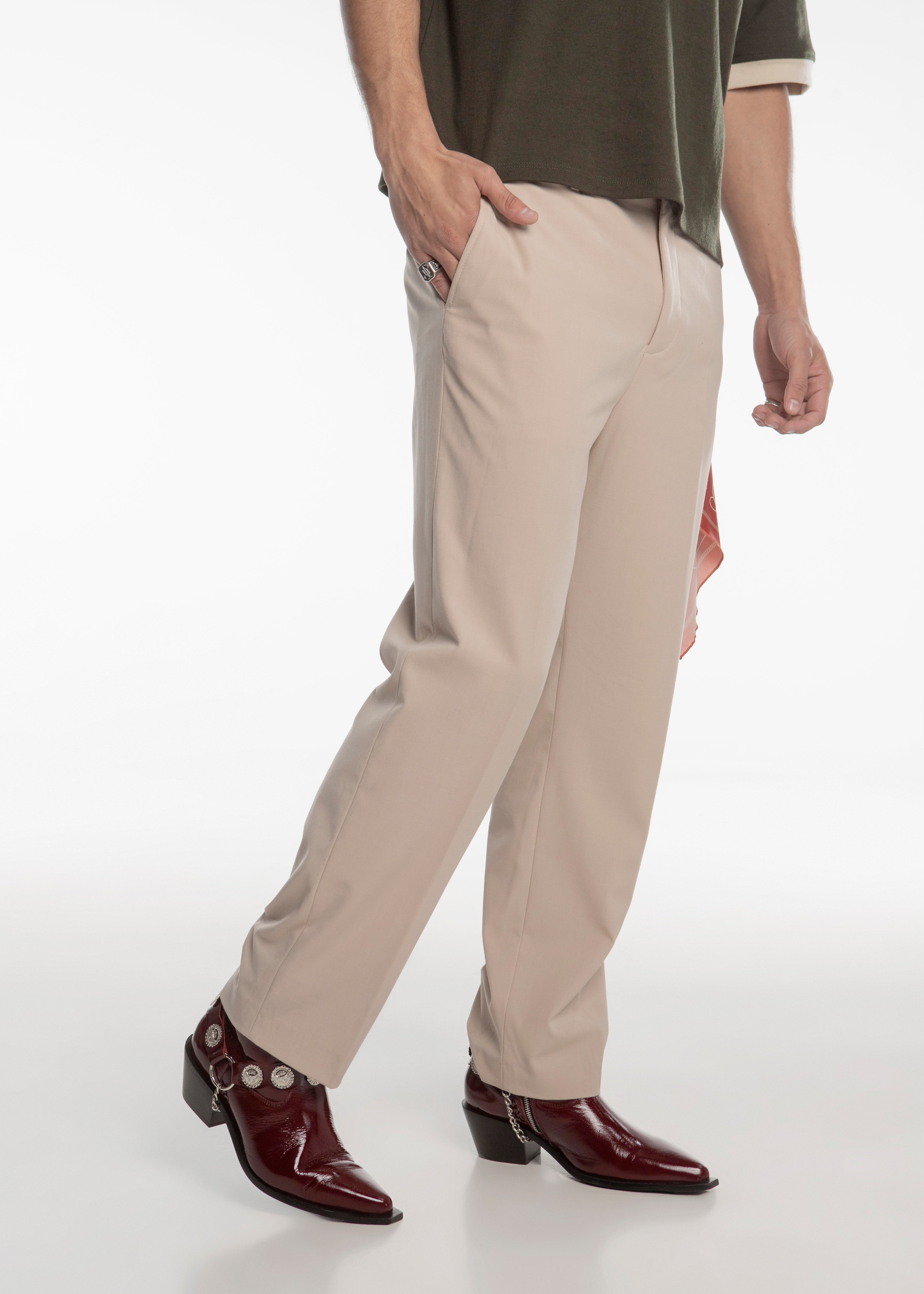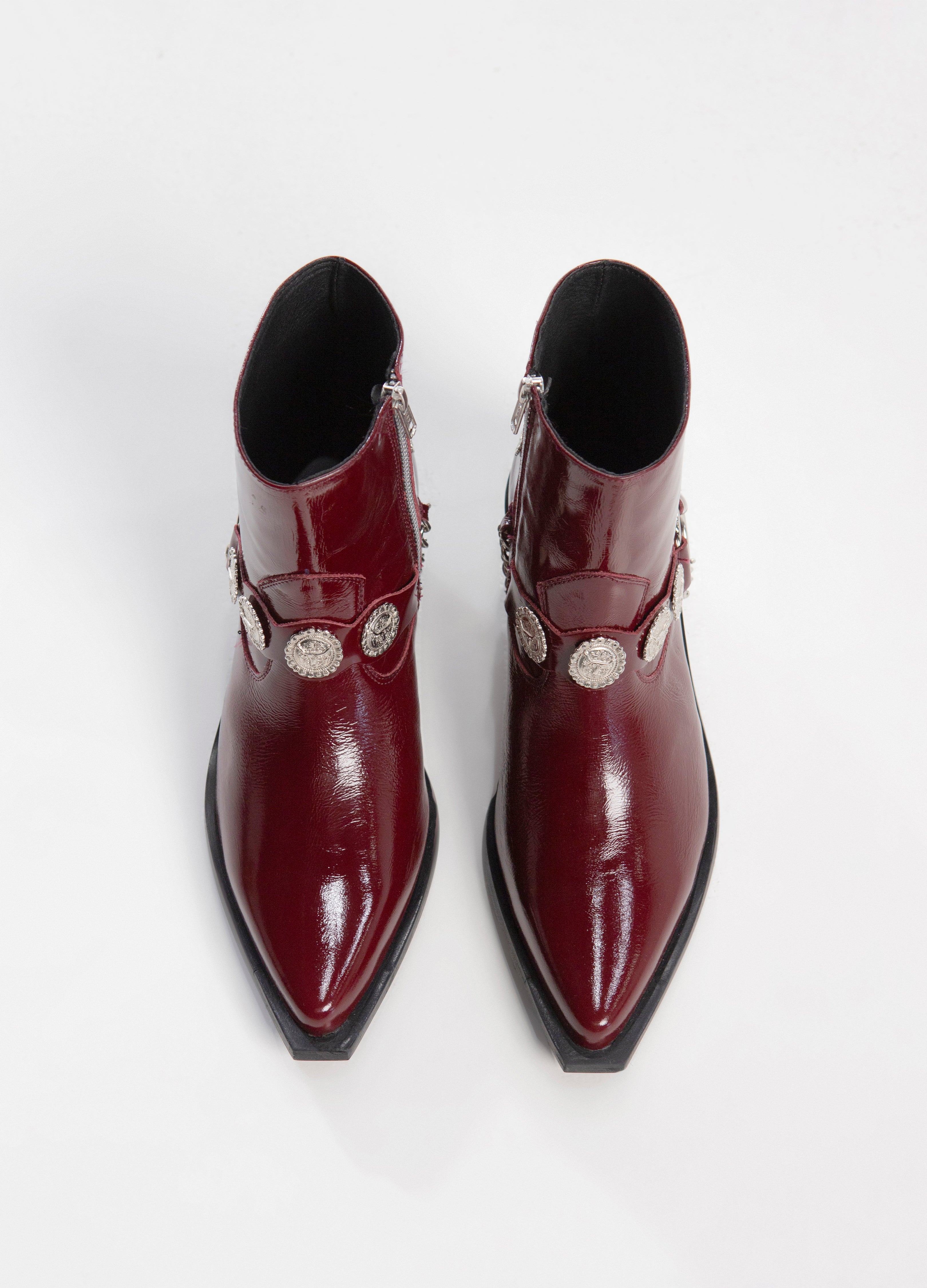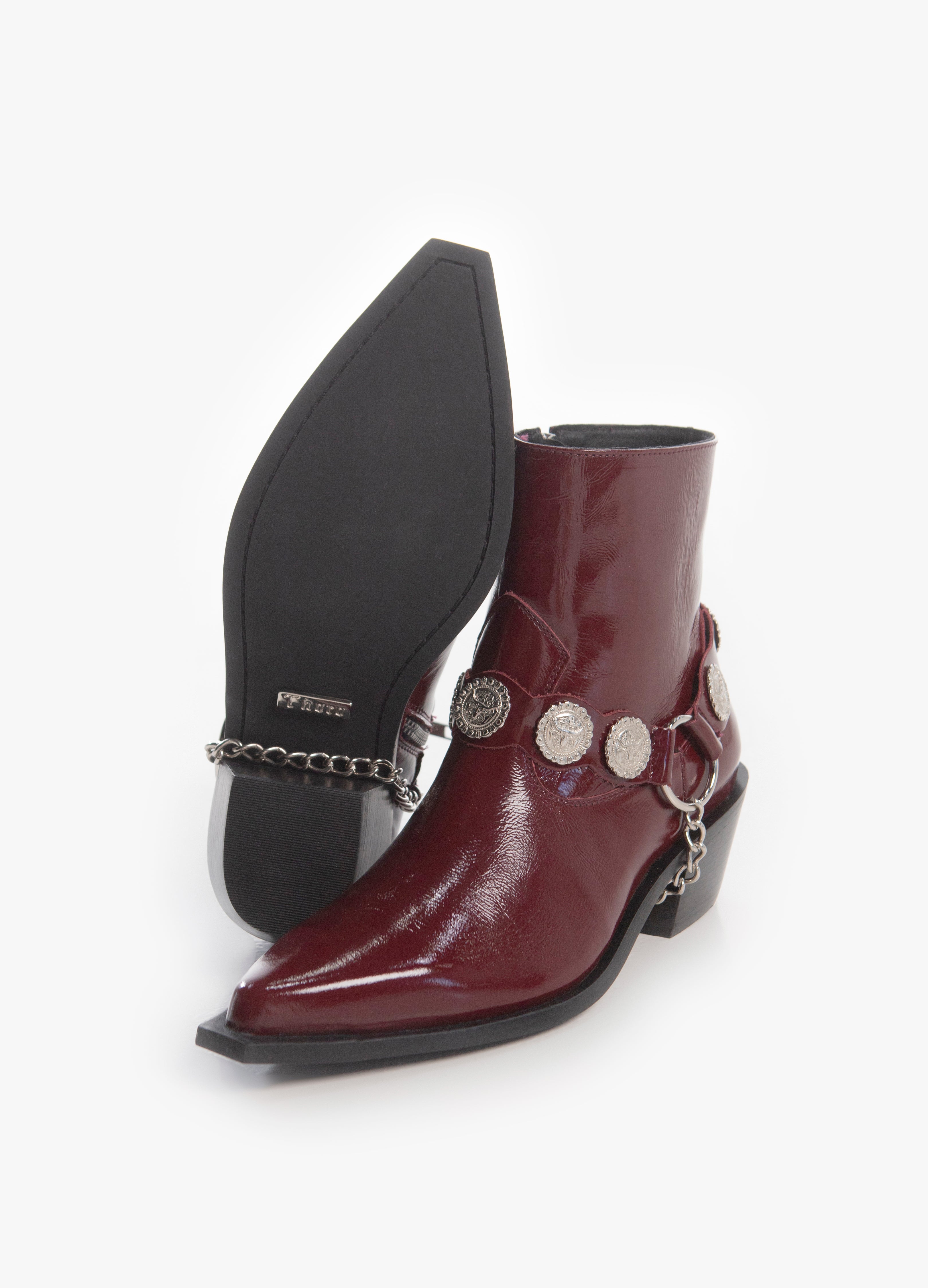 Bota (botín) estilo Chelsea fabricada en piel de res color Rojo Cherry con acabado brillante, con arnés adornado con medallones y cadenas plateadas y cierre lateral color plata para facilitar su uso