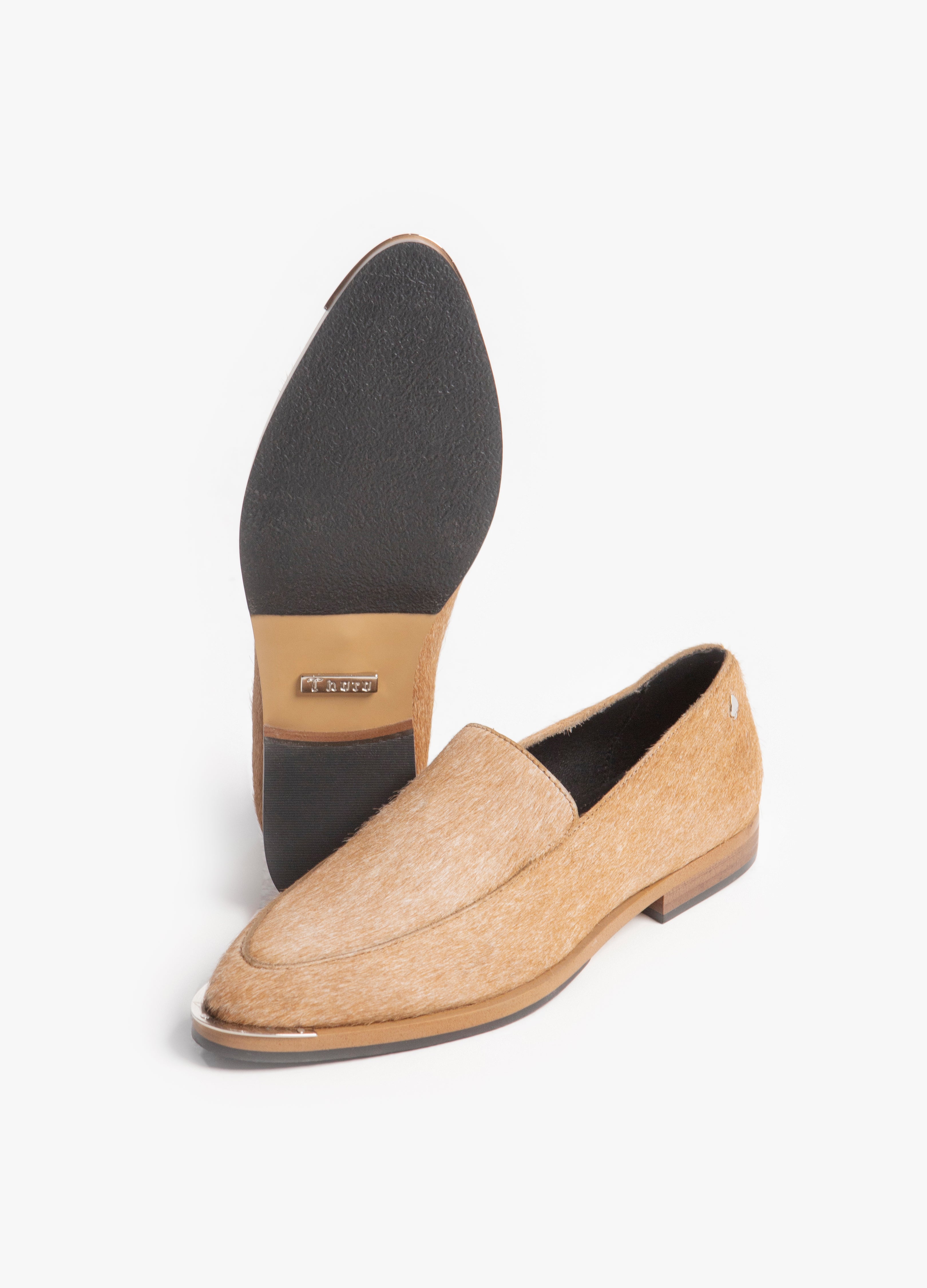 Zapato Flat fabricado en piel con pelaje natural en color arena con suela antiderrapante.