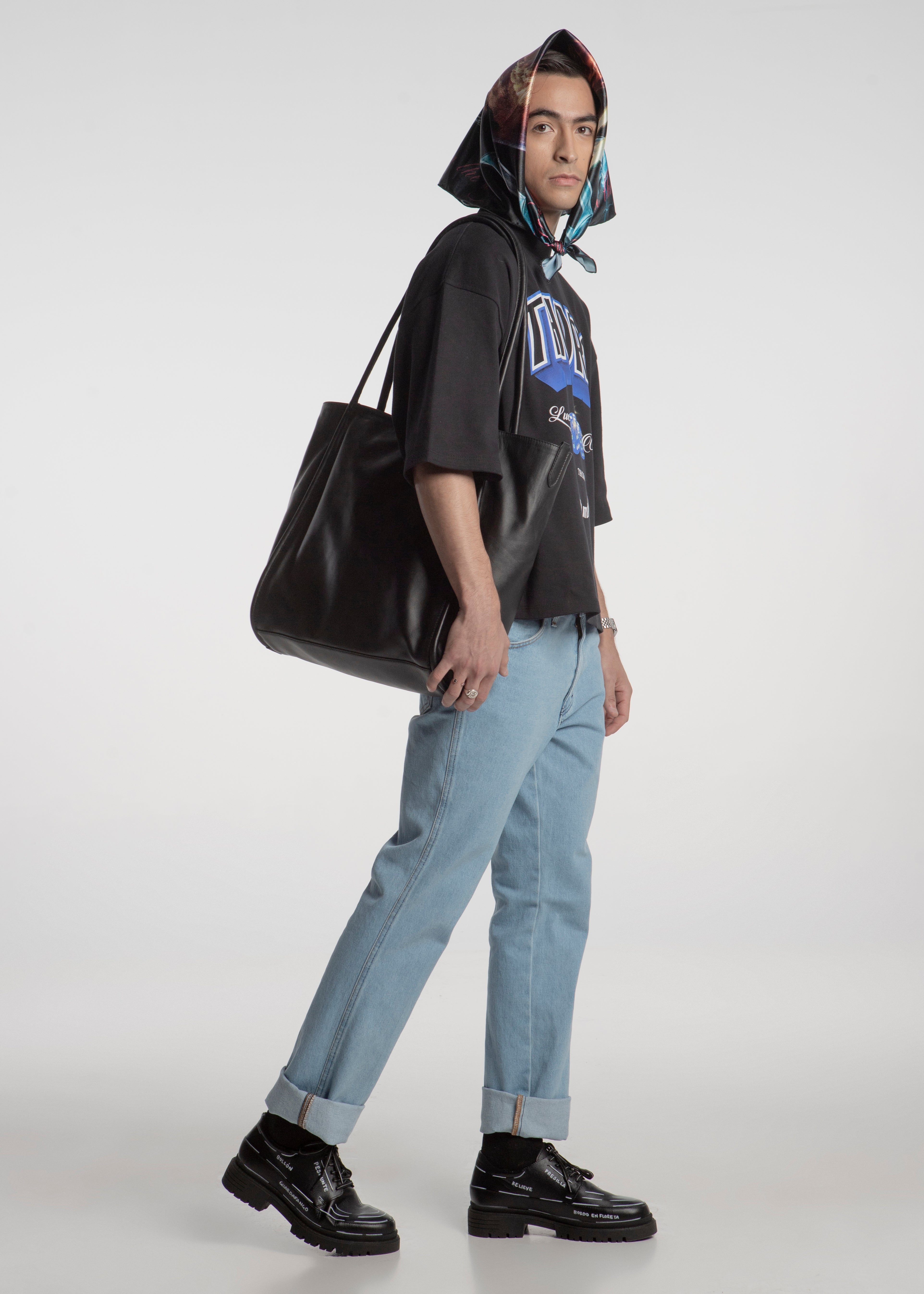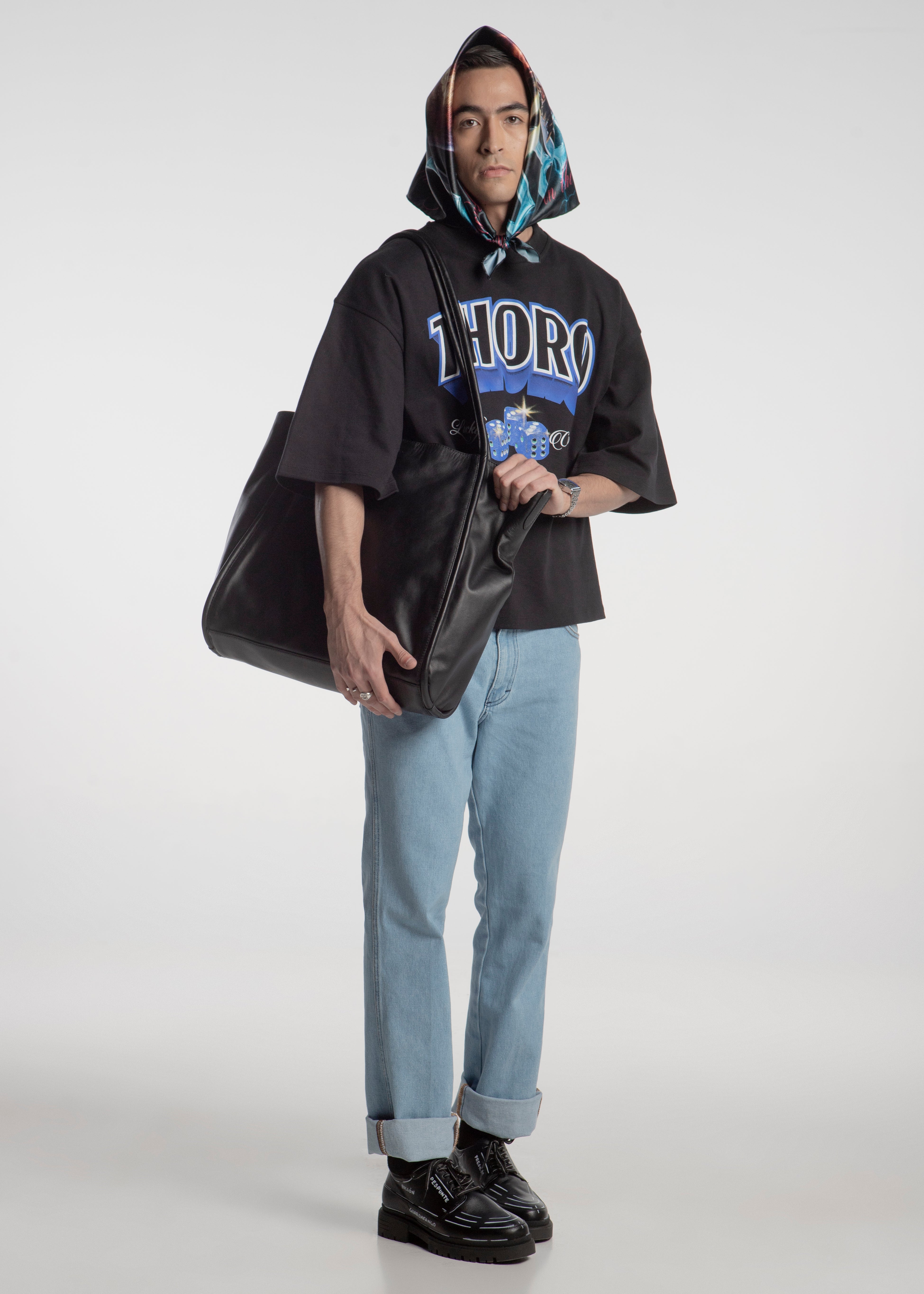 Playera negra de corte boxy fabricada en 100% algodón con el diseño de Thoro con 3 dados azules al frente junto con las frases "Lucky Crew y SIN CITY Atlethics".