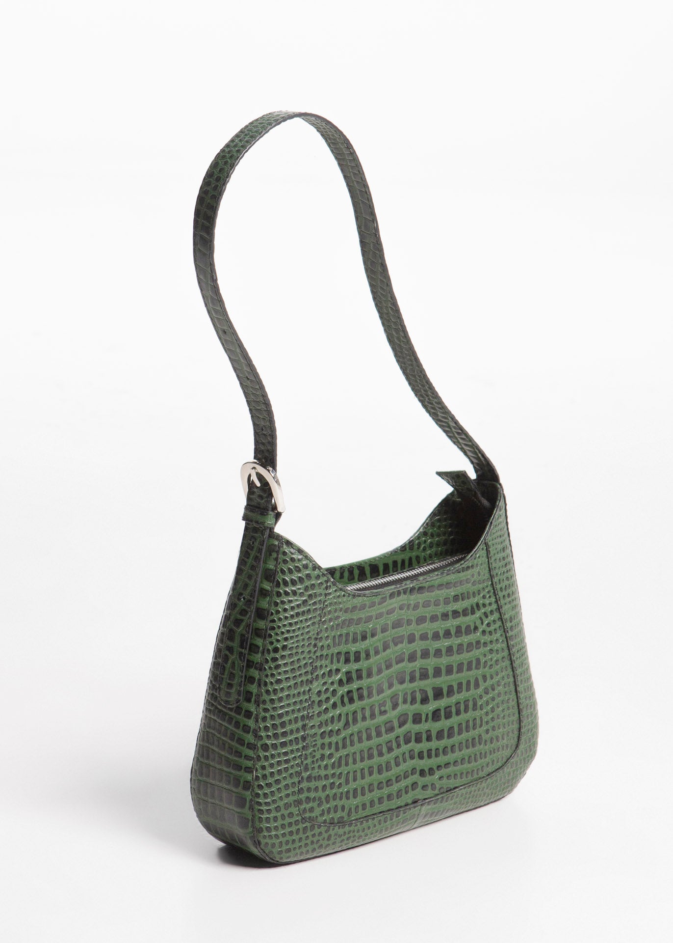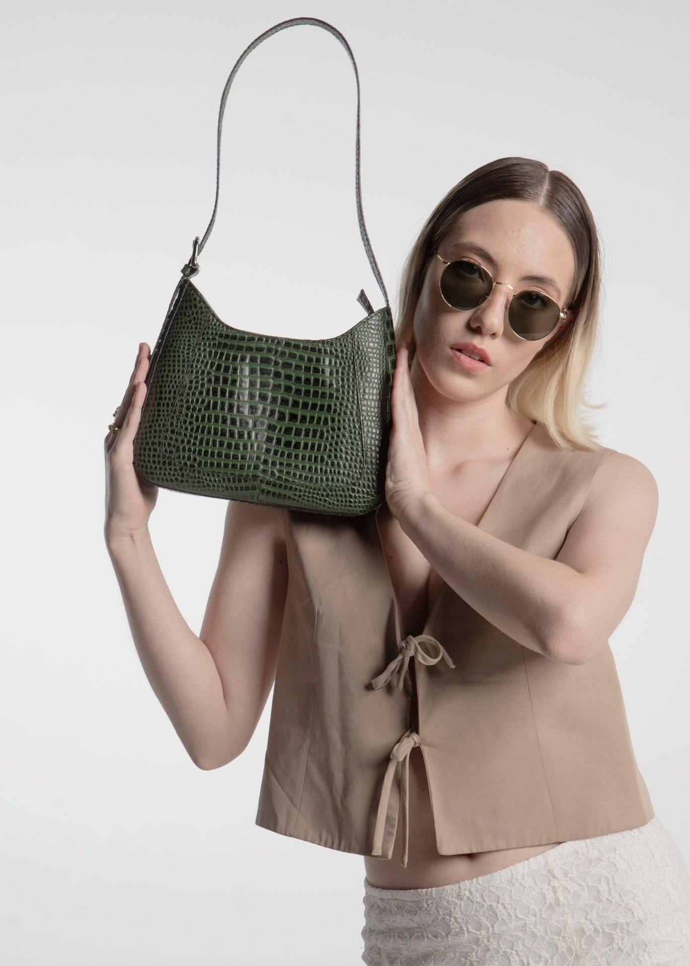 Bolso de mano fabricado en piel de res color verde con textura de escamas