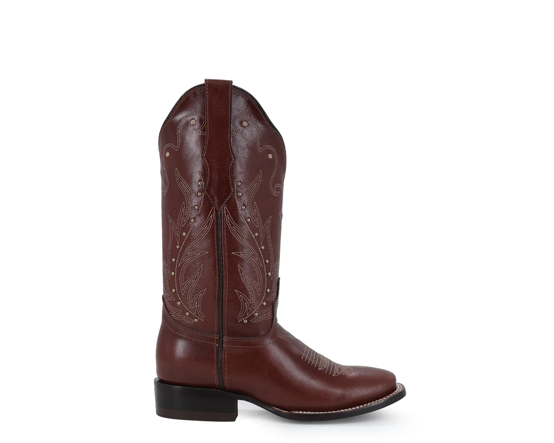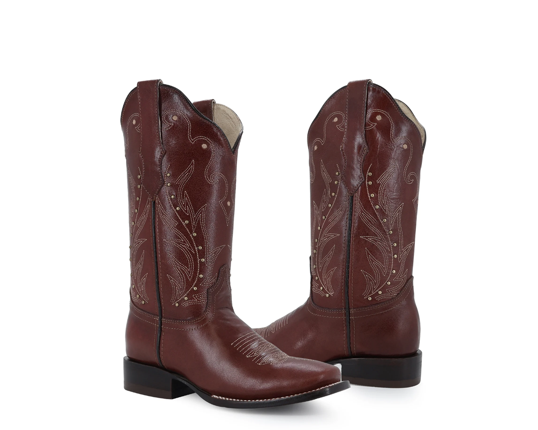 Diseño cowgirl de nuestra línea premium, con corte y forro en piel, ajuste con cierre, pines metálicos y suela de cuero pegada y cosida que garantiza la máxima fijación y durabilidad.