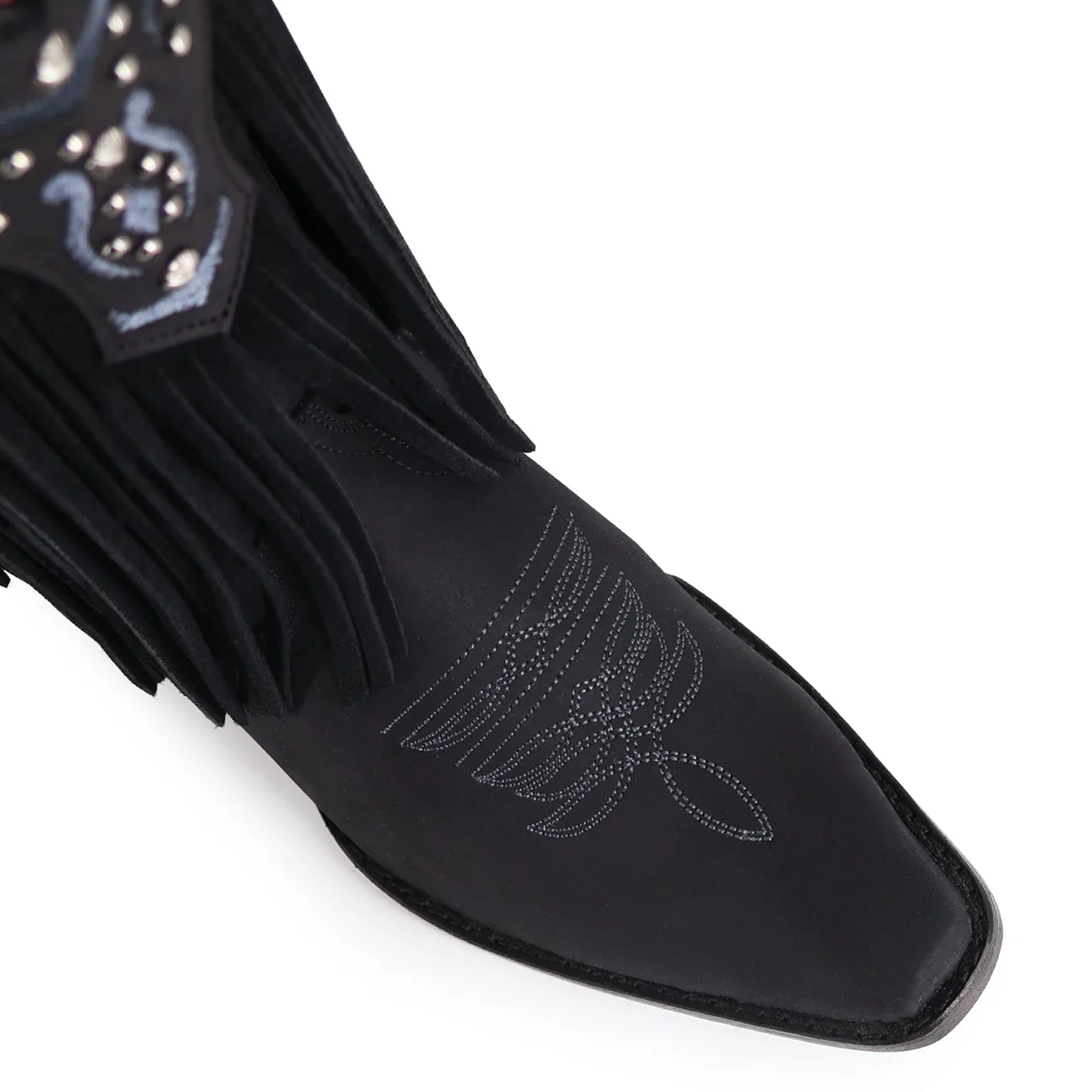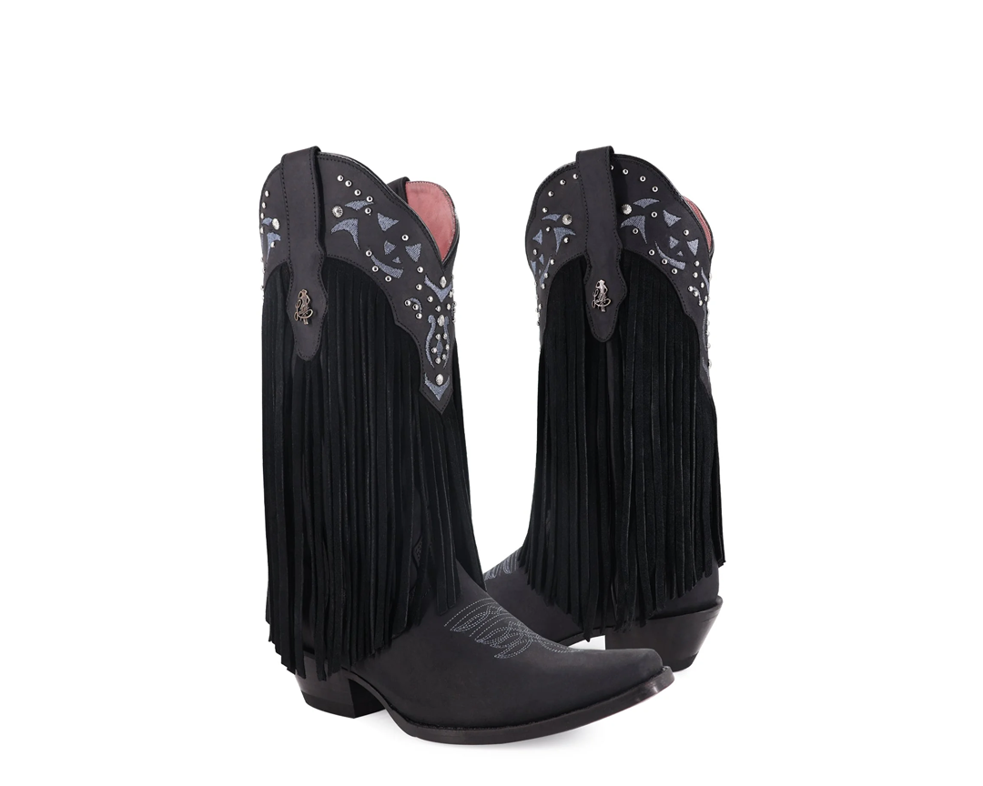 Diseño cowgirl de nuestra línea premium, con corte y forro en piel, ajuste con cierre, pines metálicos y suela de cuero pegada y cosida que garantiza la máxima fijación y durabilidad.