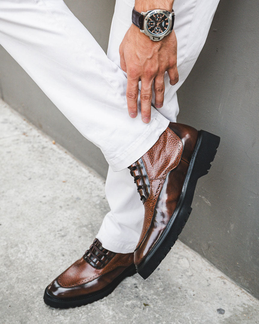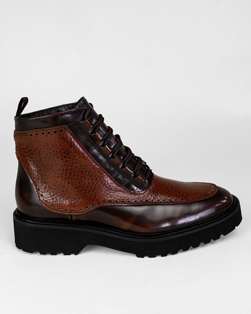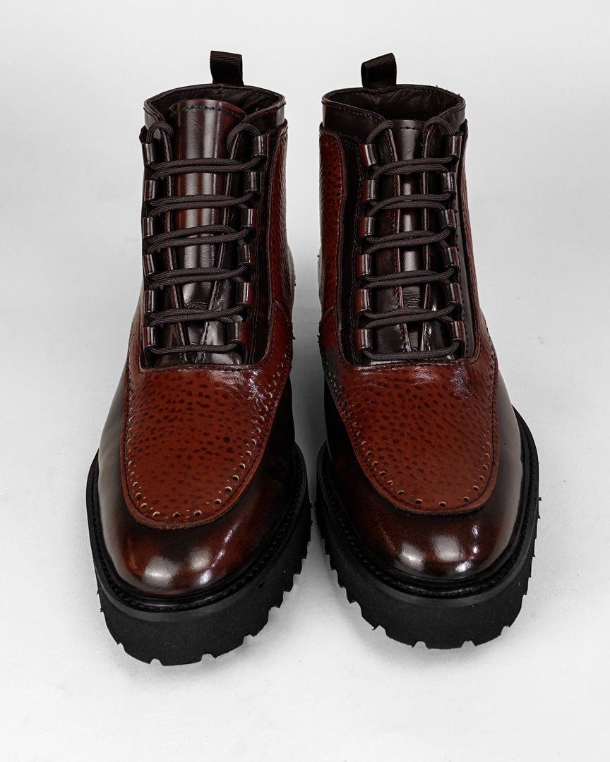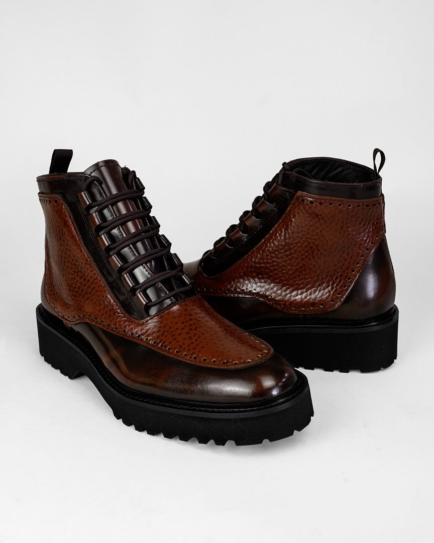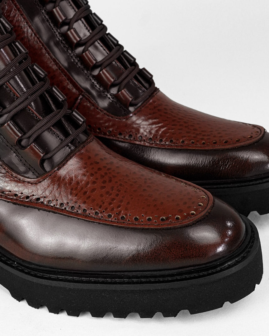 Bota urbana estilo chunky, en piel acabado camaleon y chinela en flother, con ajuste de agujetas de algodon, su suela pegada, garantiza la mejor fijación y durabilidad.