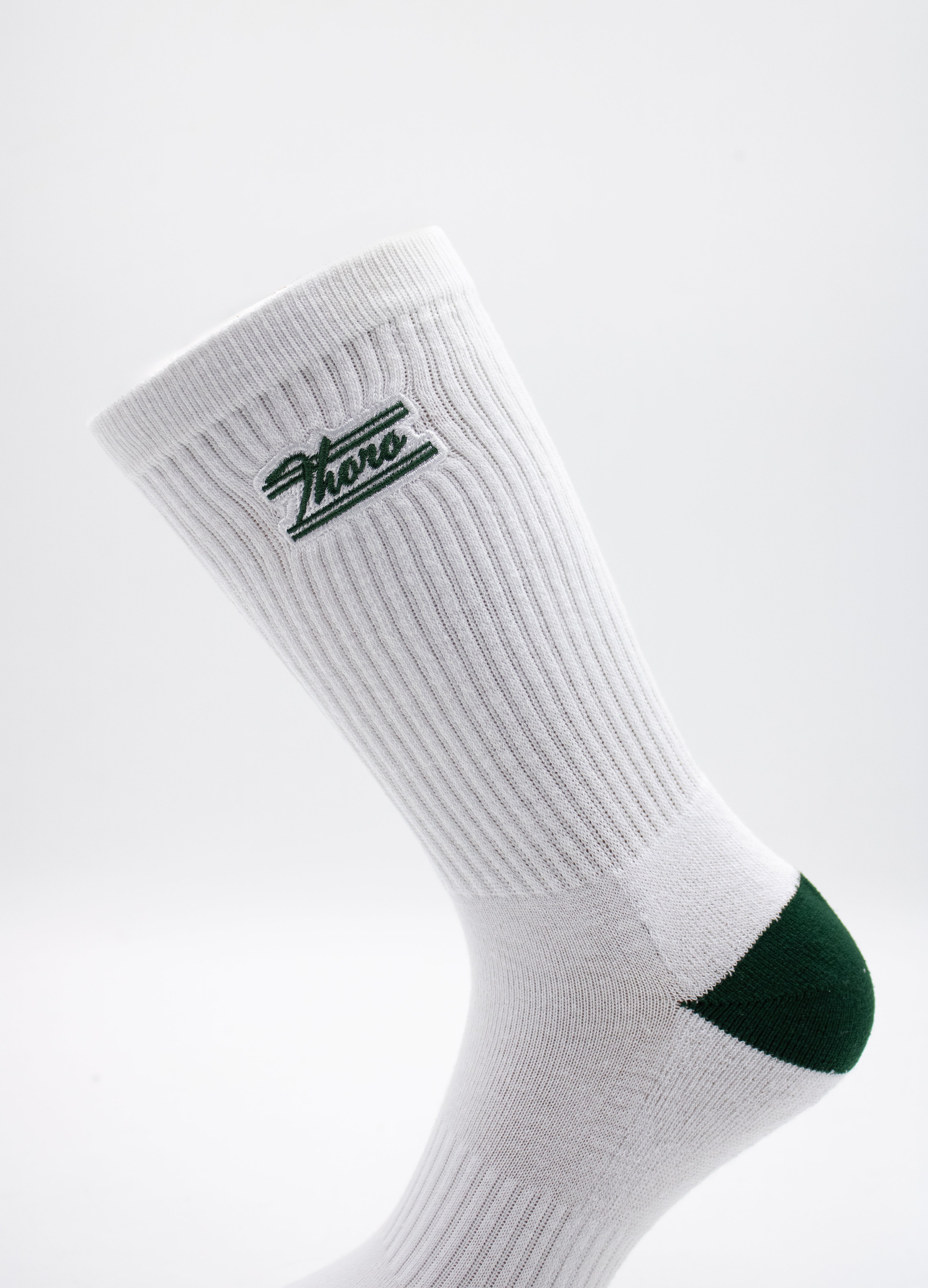Calceta fabricada en algodón premium, en color beige con detalles en color verde, bordado de Thoro en color verde.