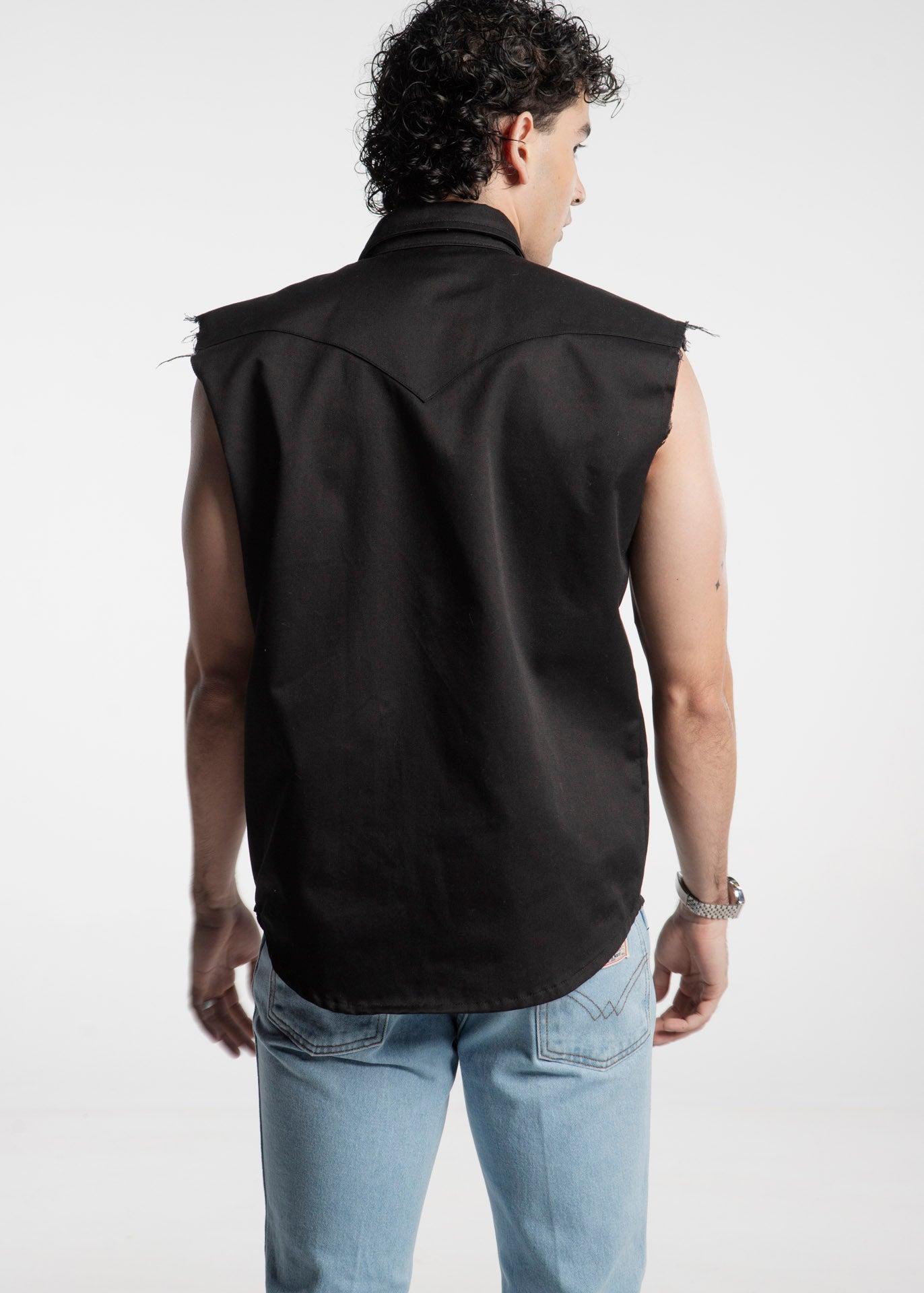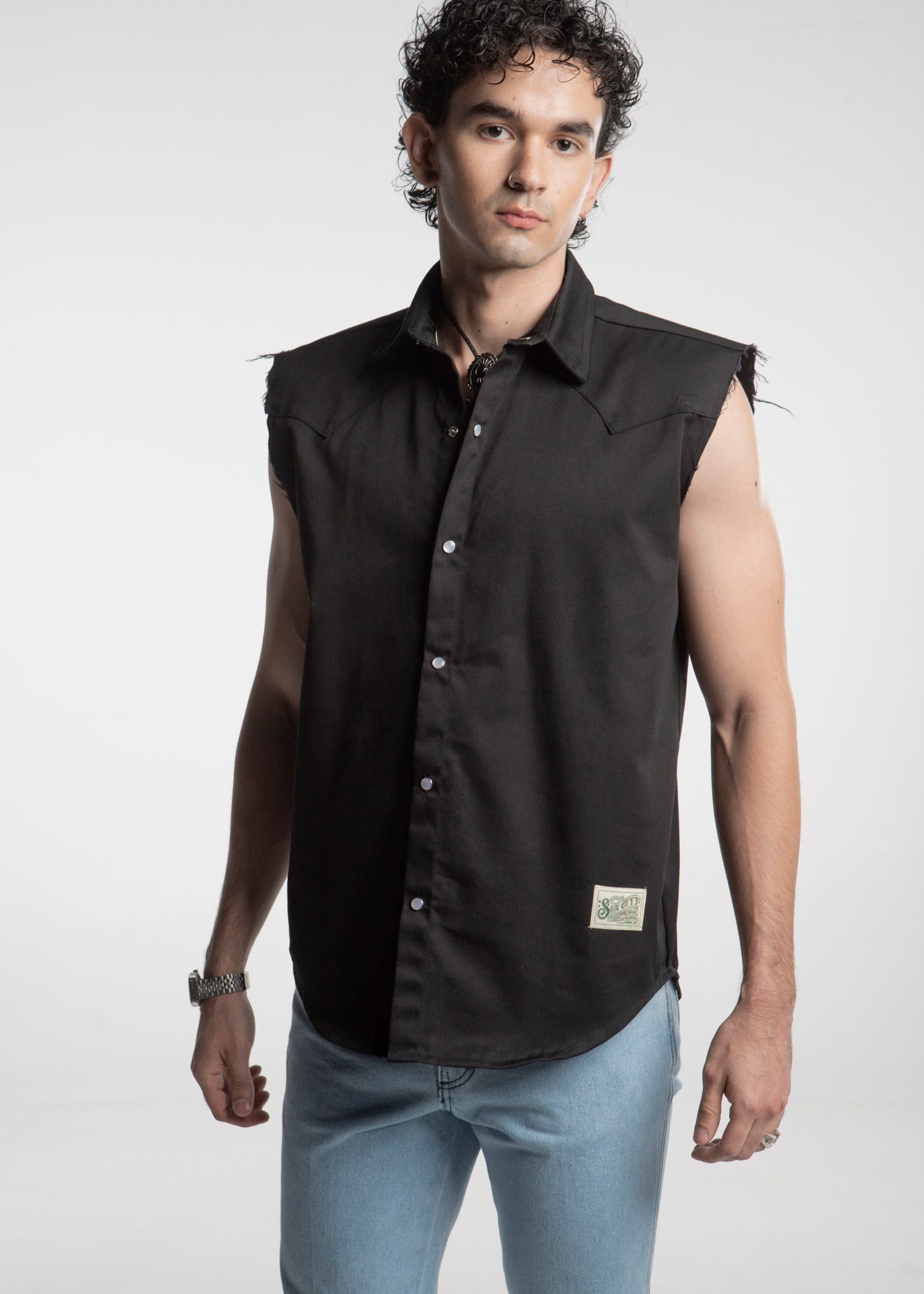Camisa sin mangas estilo trailero en color negro con botones a presión estilo perla.