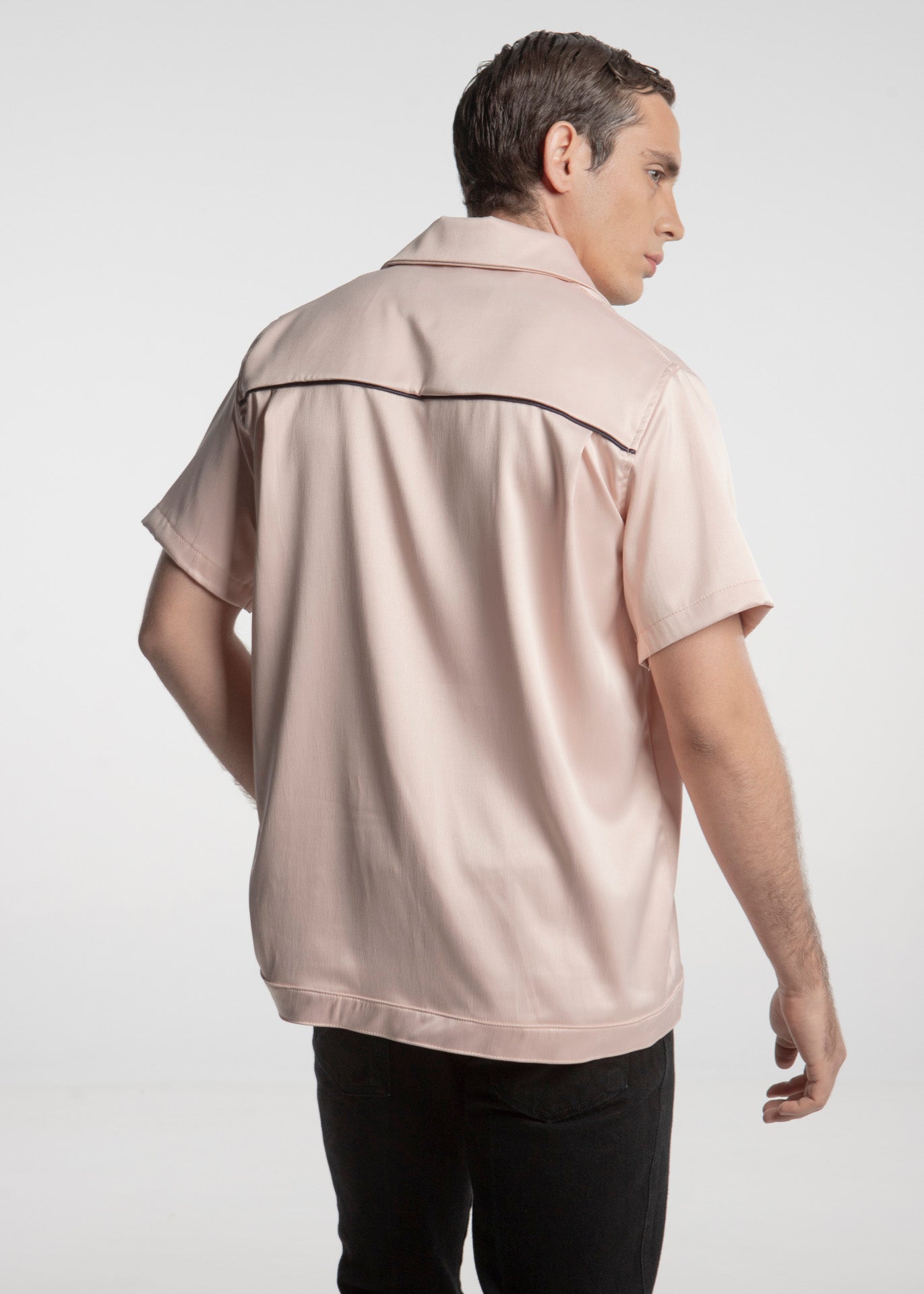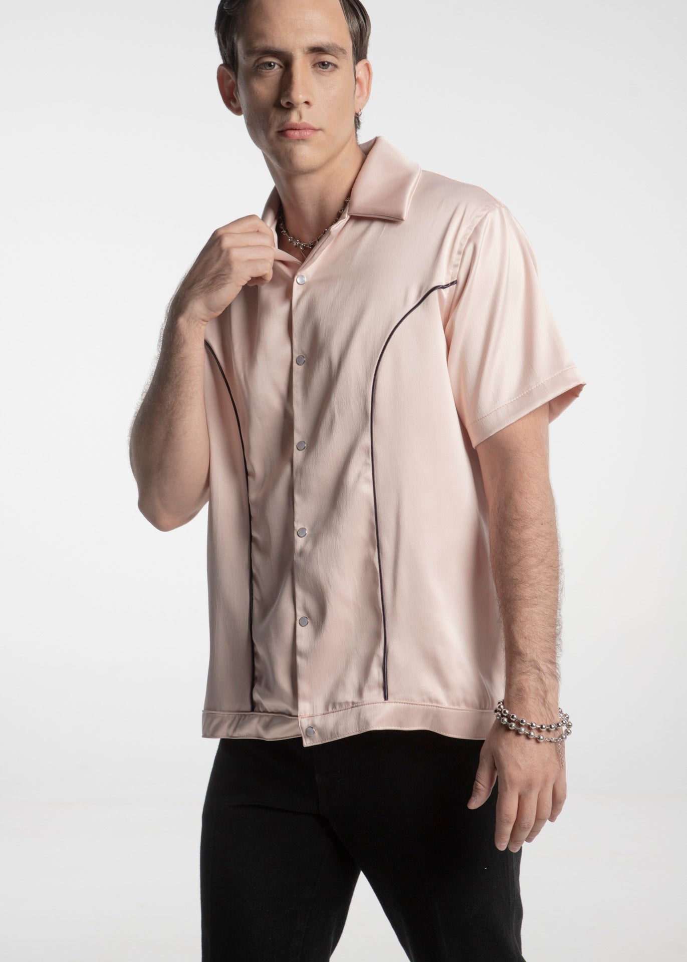 Camiseta fabricada en tela tipo seda color rosa con ribetes vaqueros en color negro, botones a presión estilo perla.