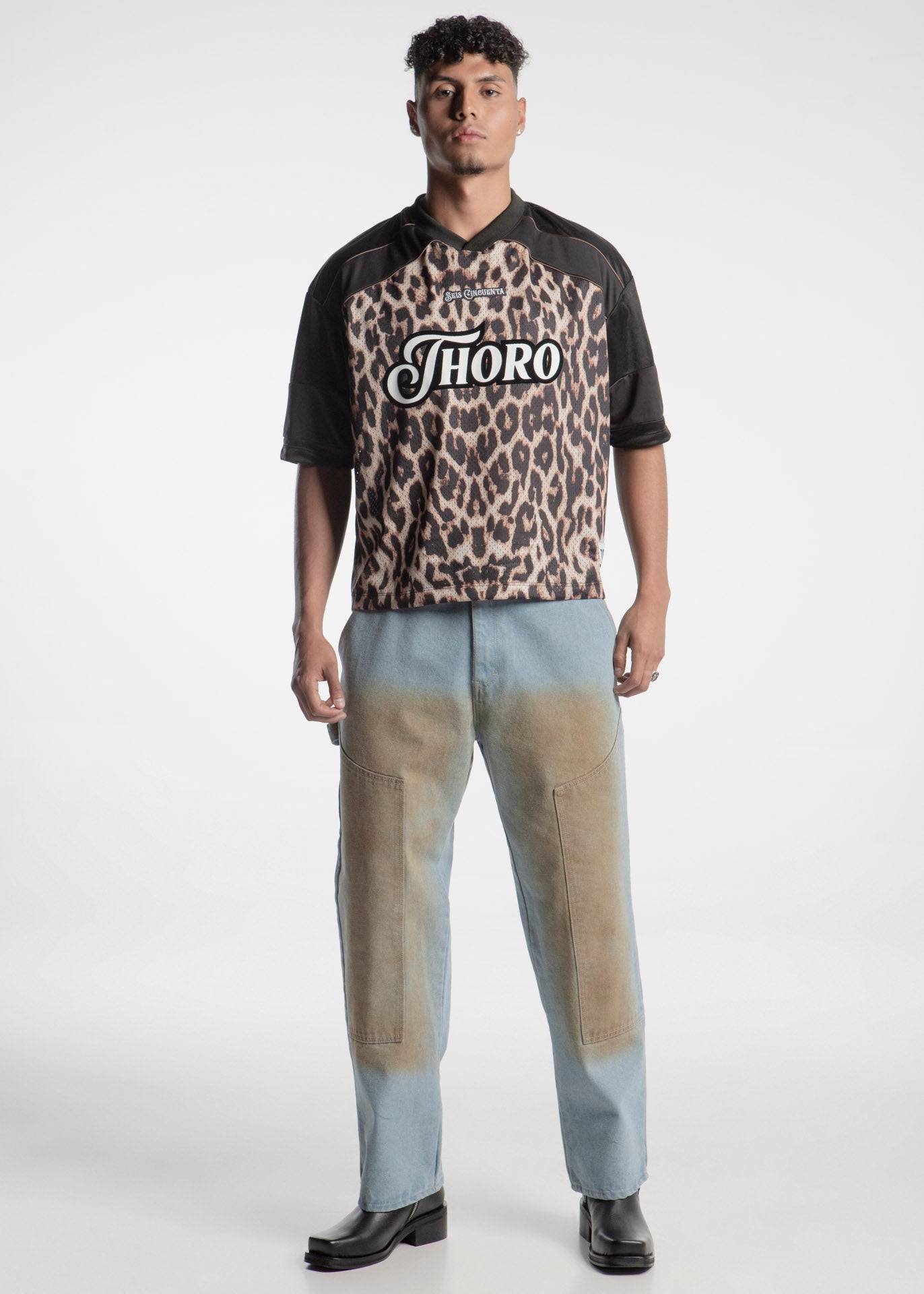 Pantalon de mezclilla estilo carpintero en color azul claro con manchas en contraste en el area de muslos que simulan suciedad.