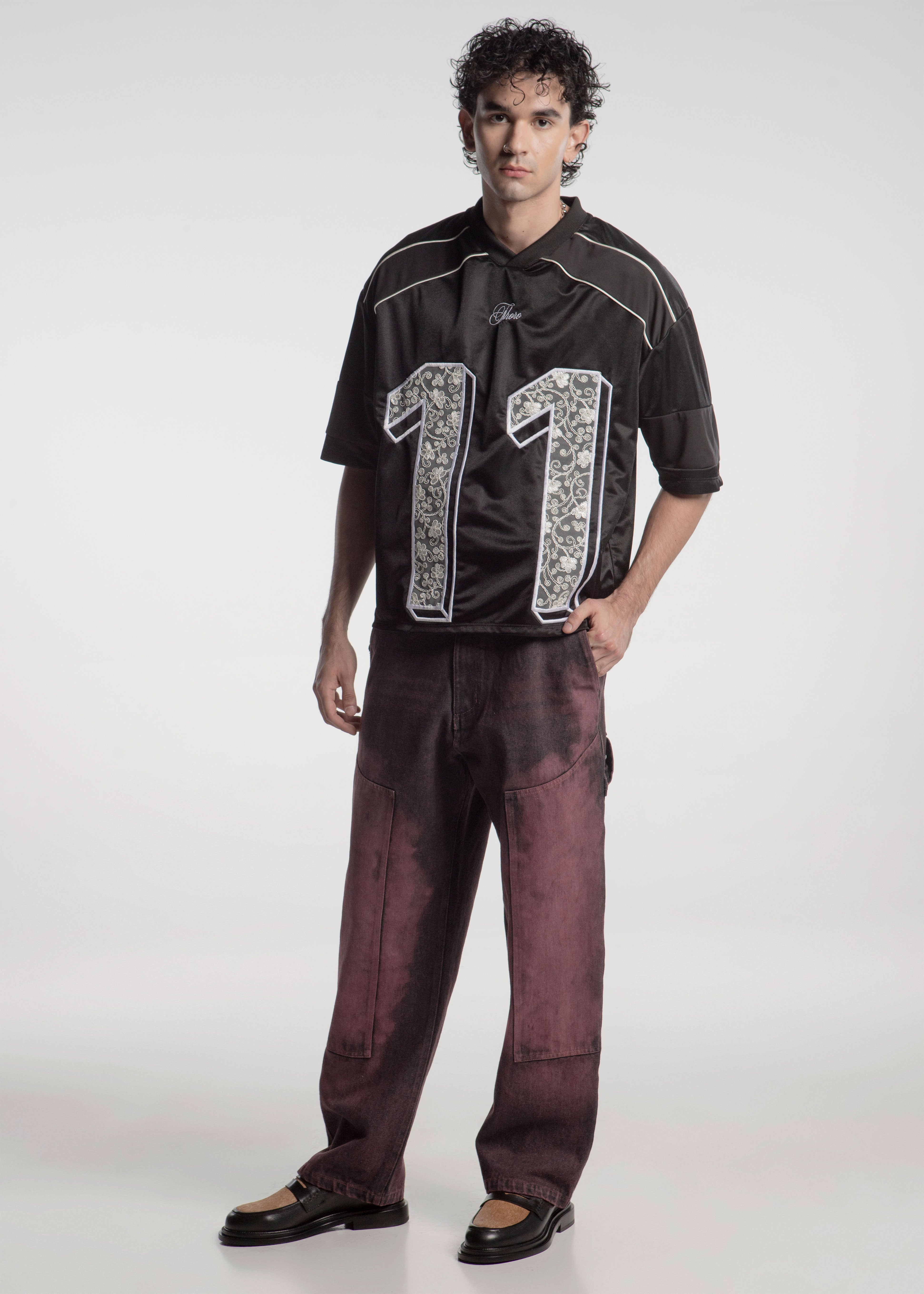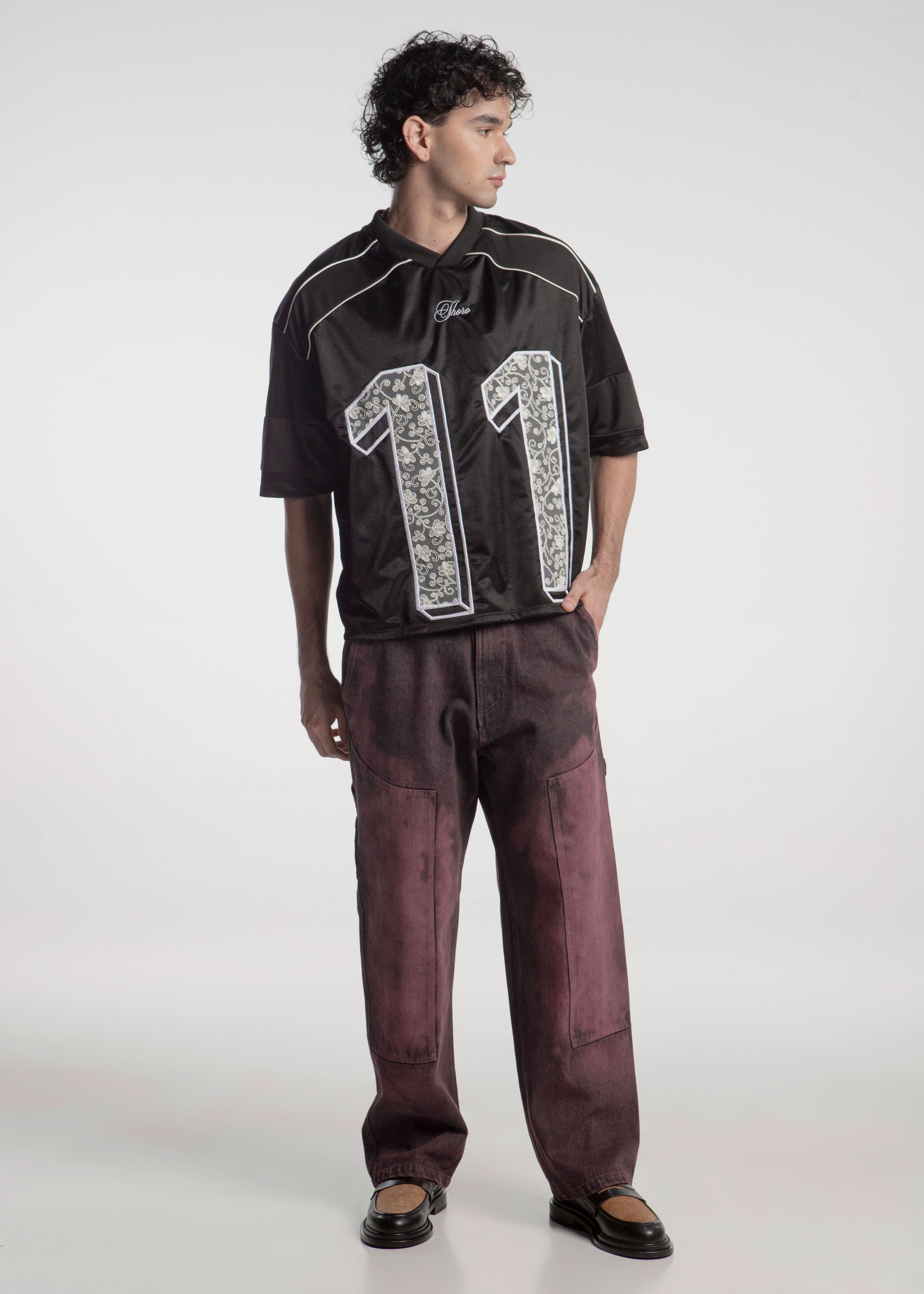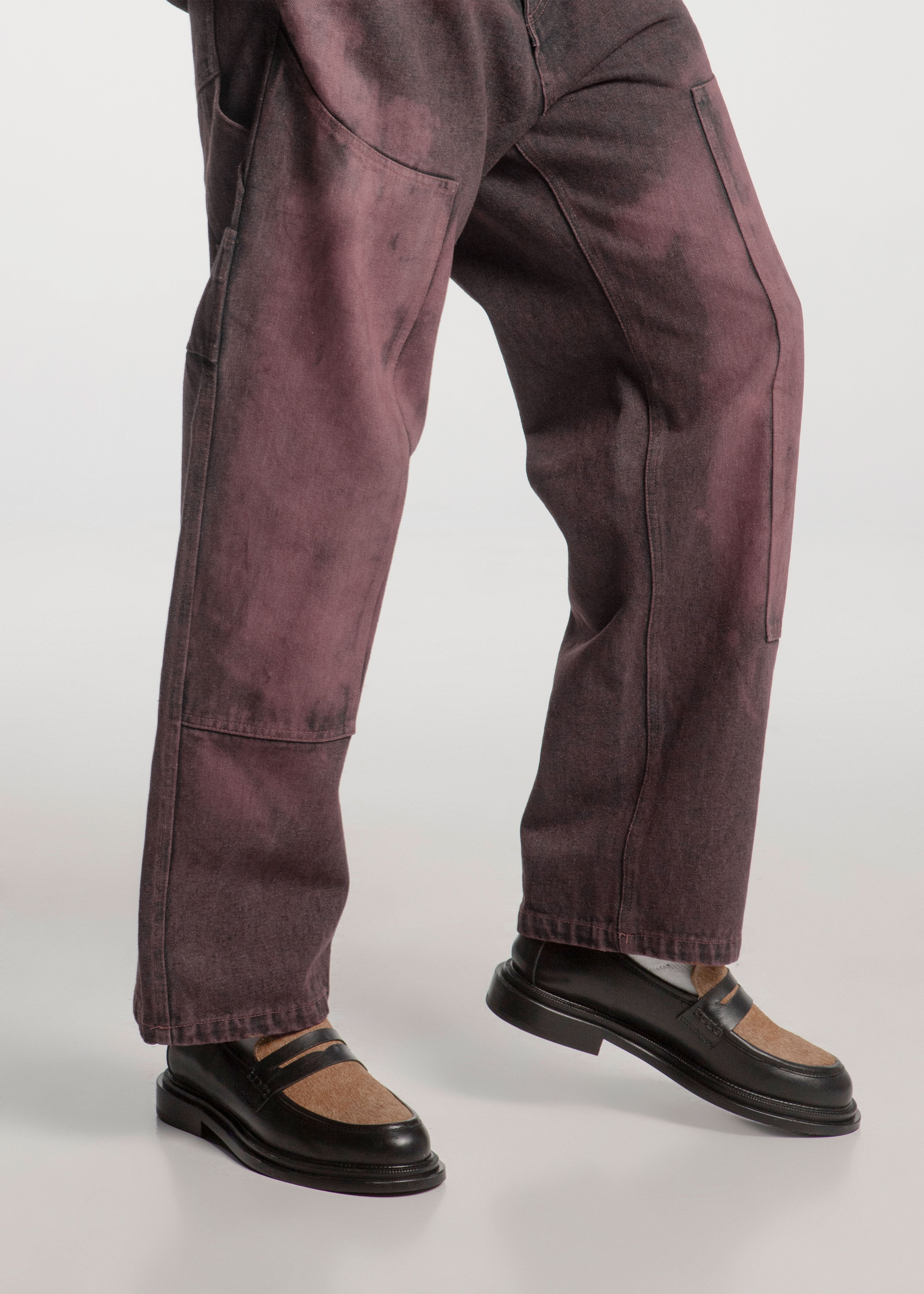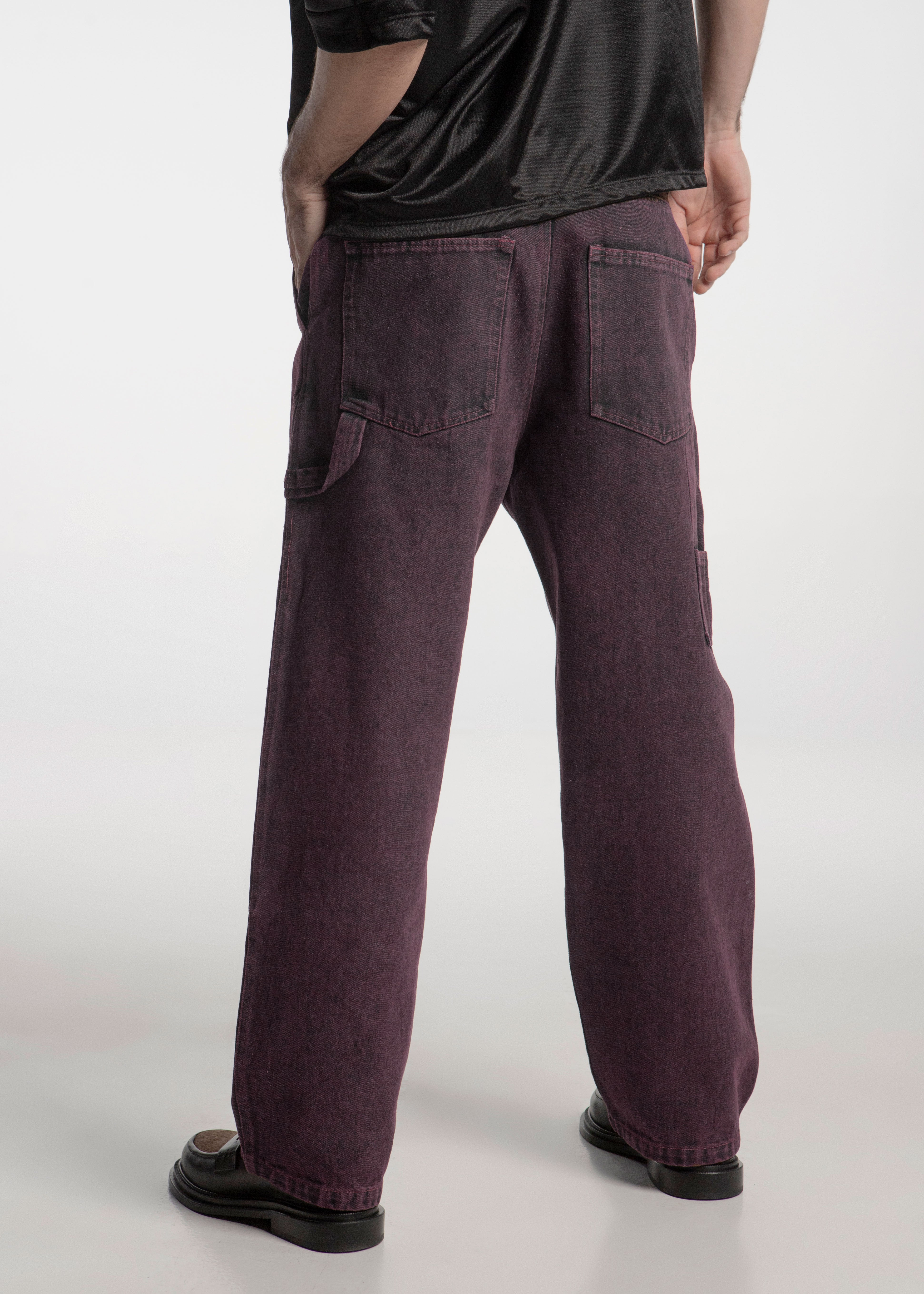 Pantalon de mezclilla estilo carpintero en color café con manchas en contraste en el area de muslos que simulan suciedad.