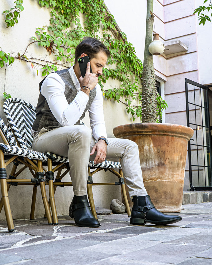 Casual Italian design, from our premium line, laced leather, spring adjustment at the ankle, removable leather harness with steel chains and its glued and sewn sole, guarantees the best fit and durability.