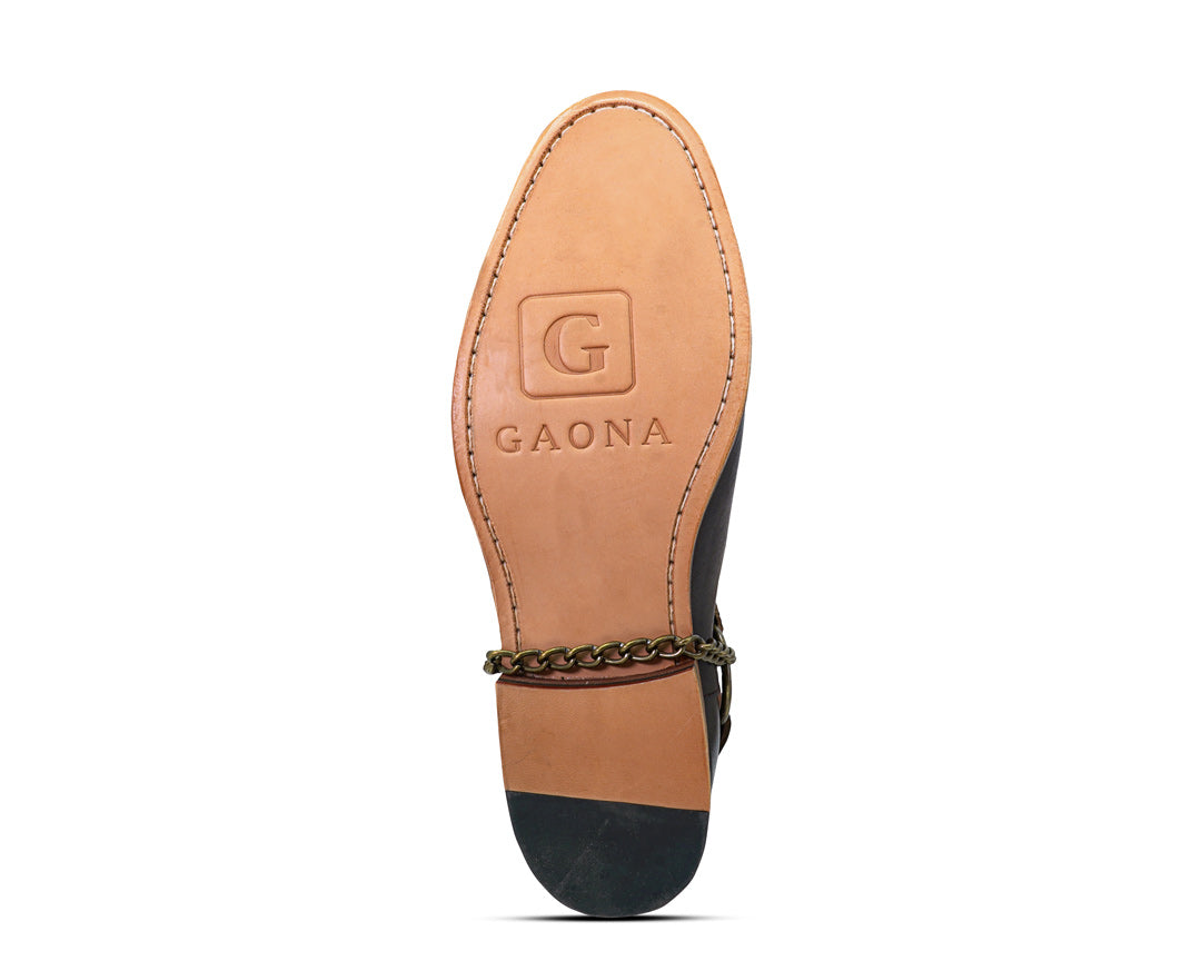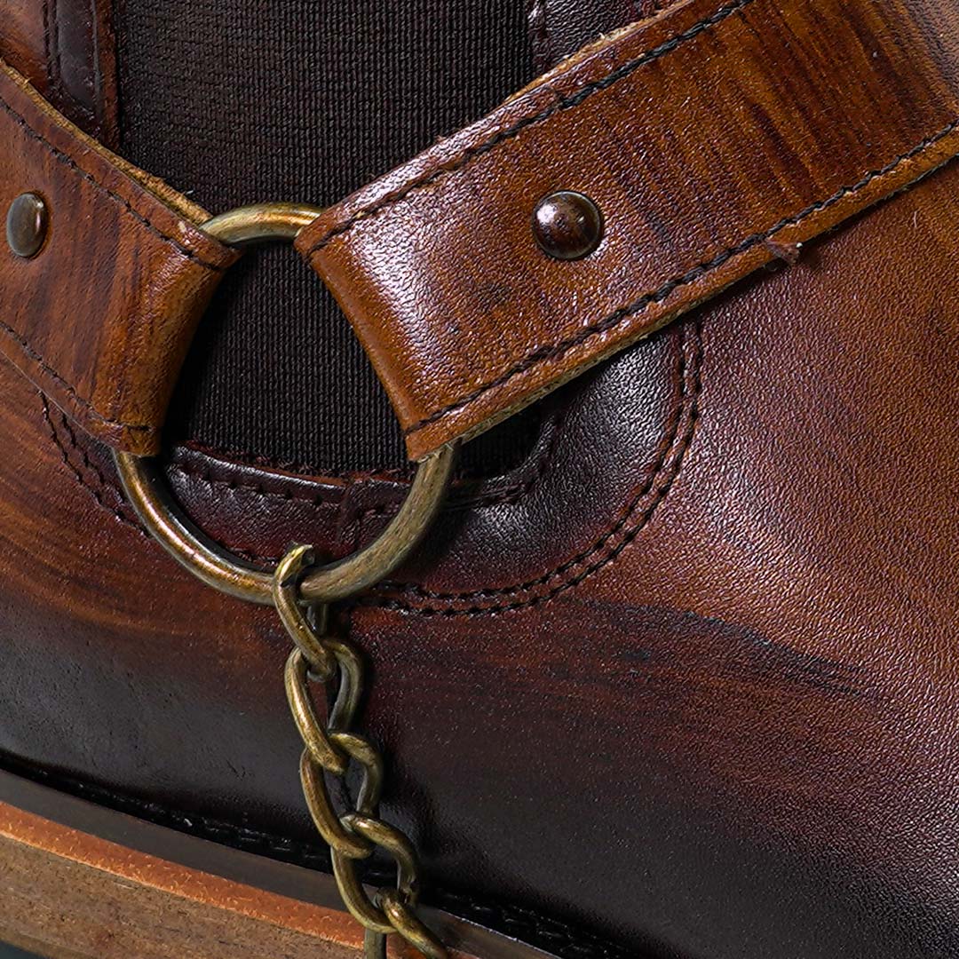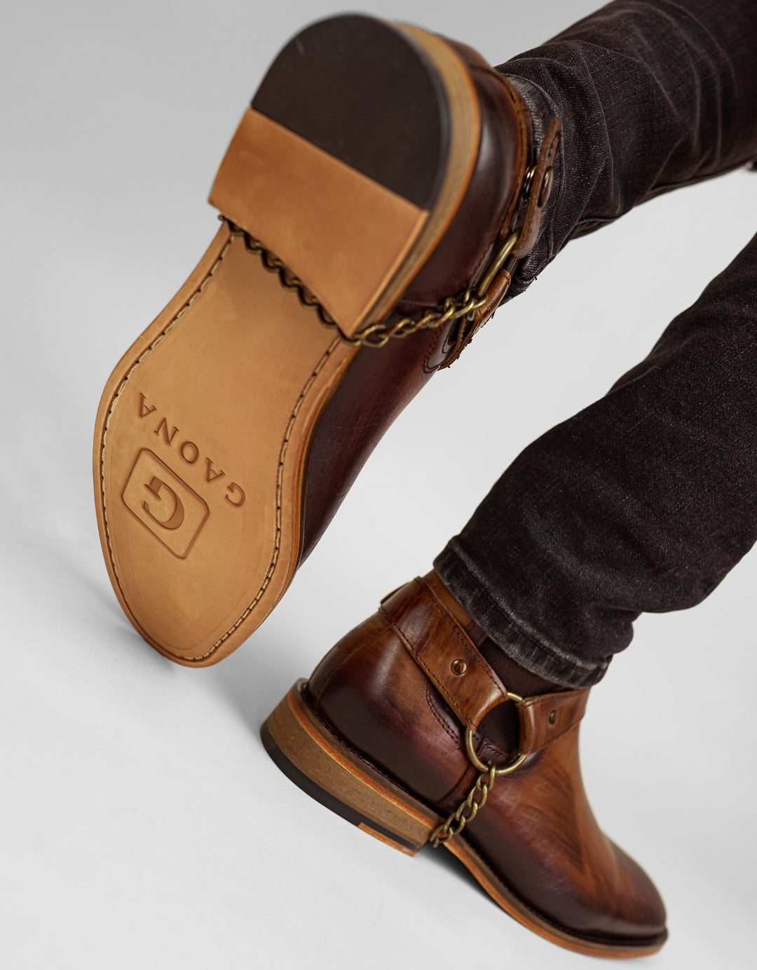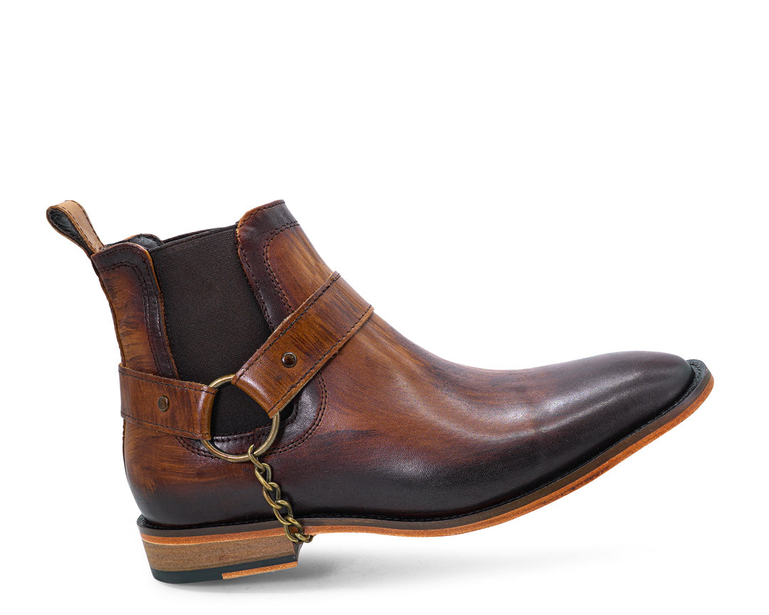 Casual Italian design from our premium line, hand-finished leather with special waxes that highlight the effect of silhouetted stripes, spring adjustment at the ankle, removable leather harness with steel chains and its glued and sewn sole, guarantees the best fit and durability.