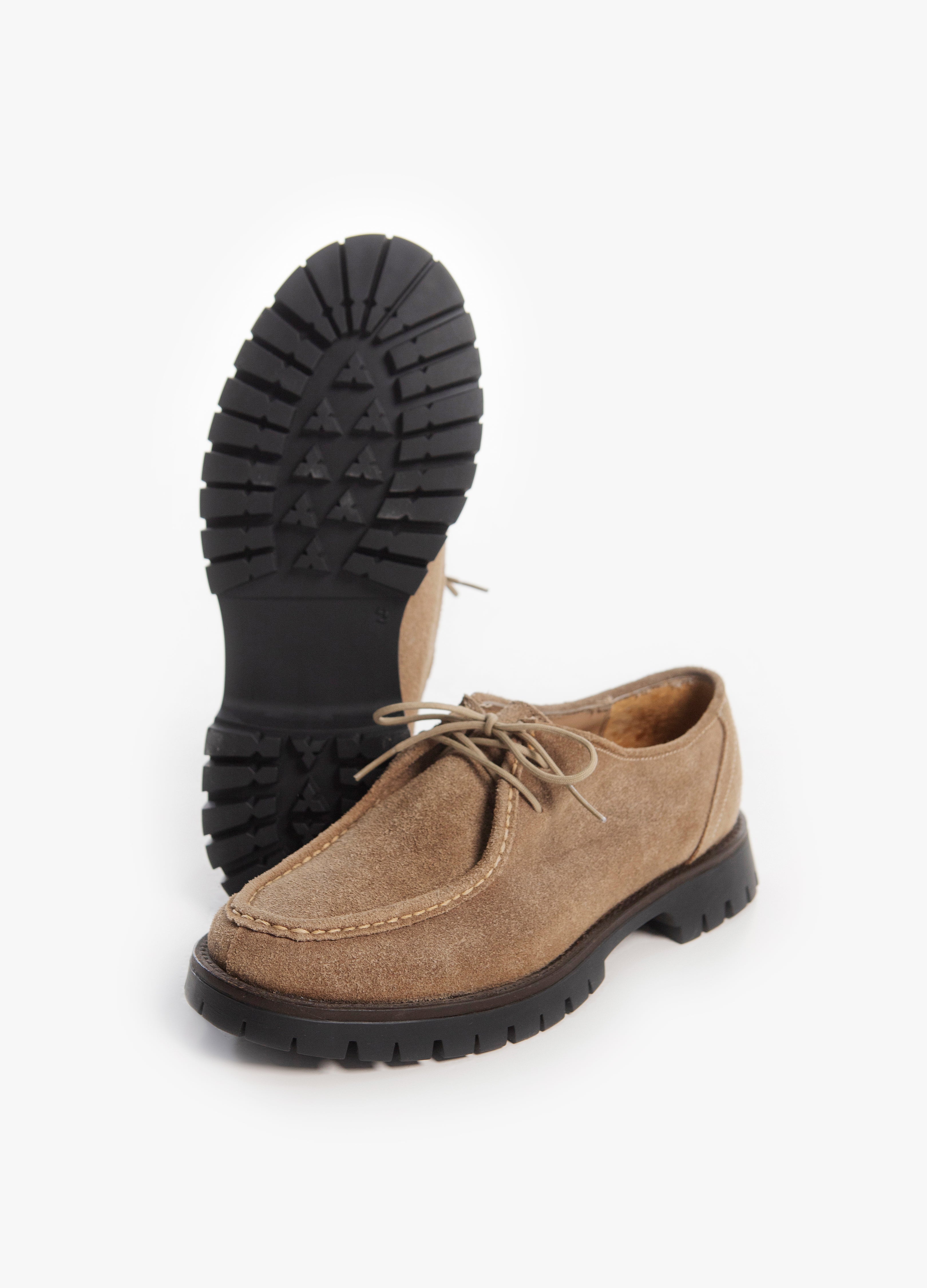 Zapato estilo Wallabee, fabricado en piel de res en acabado gamuza color arena, con suela gruesa de goma que combina estilo y comodidad.