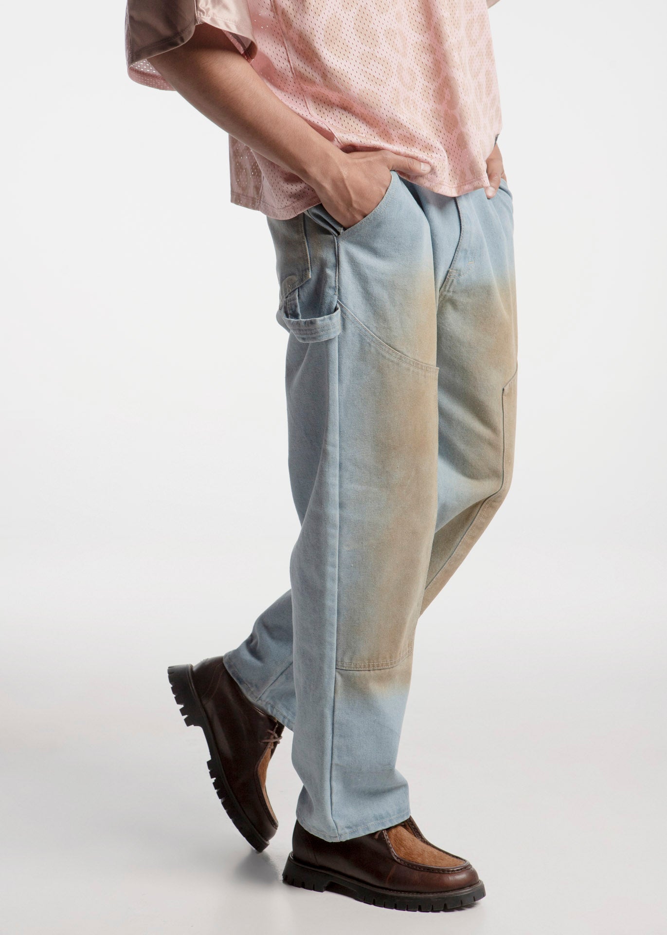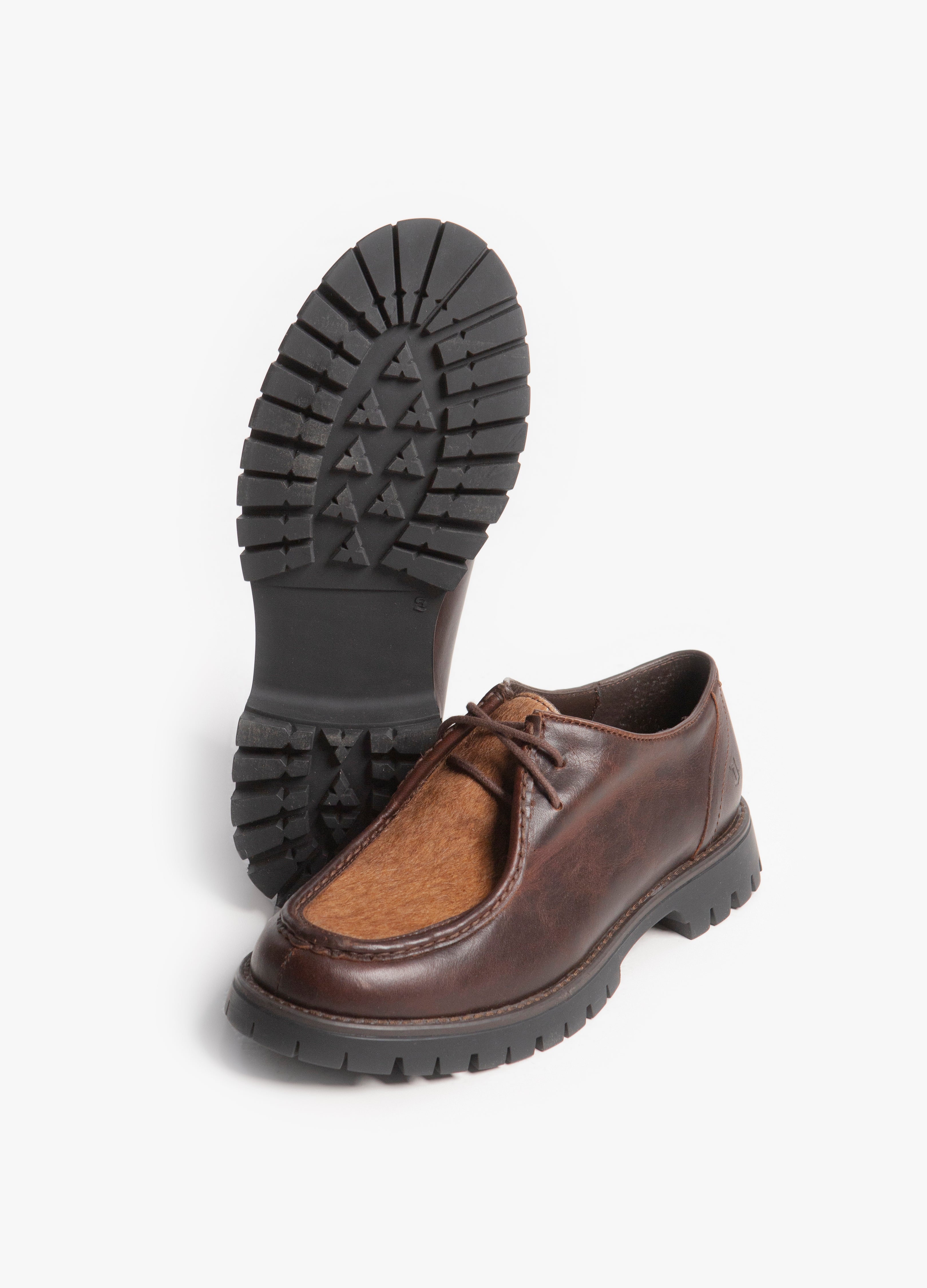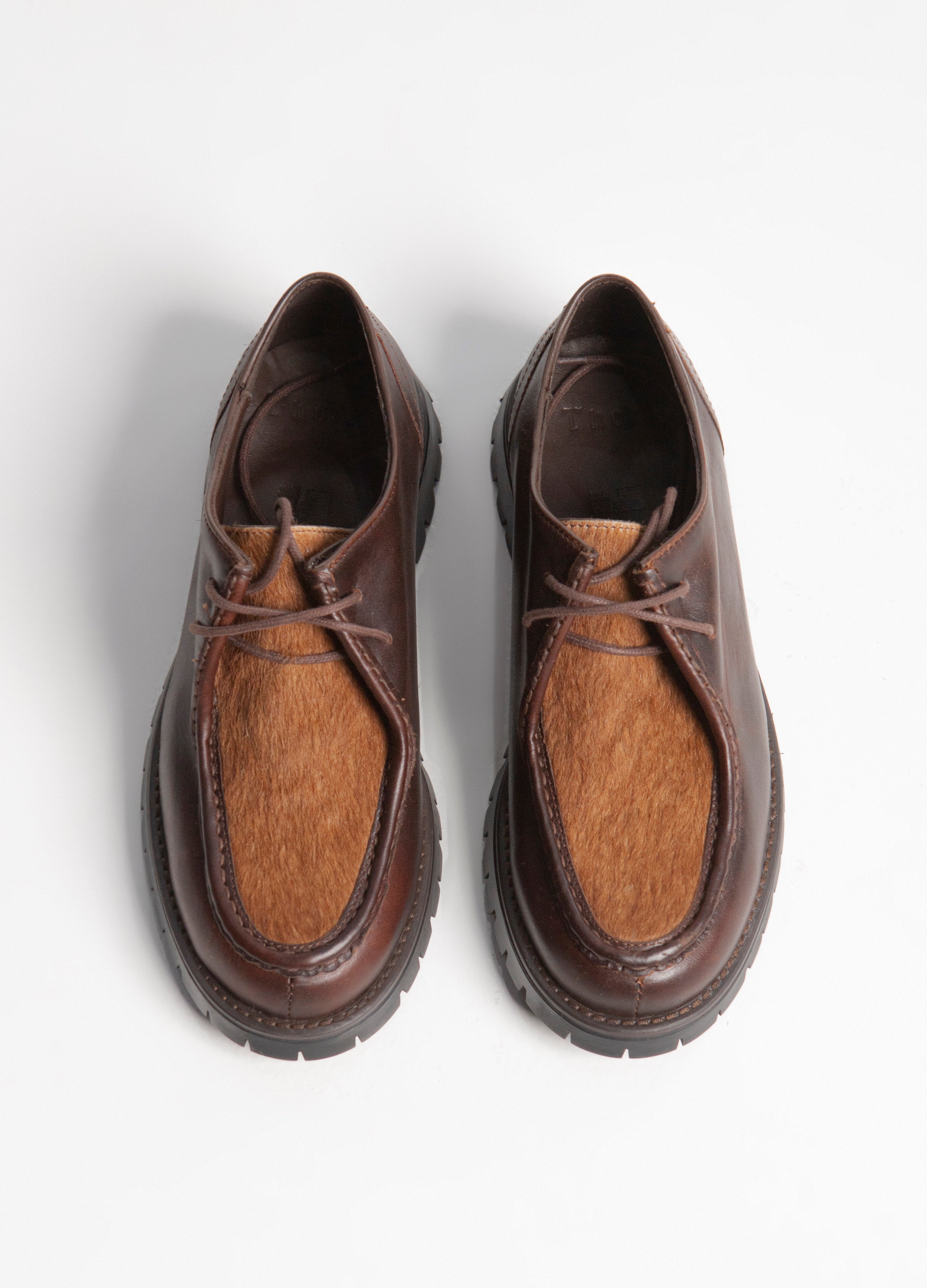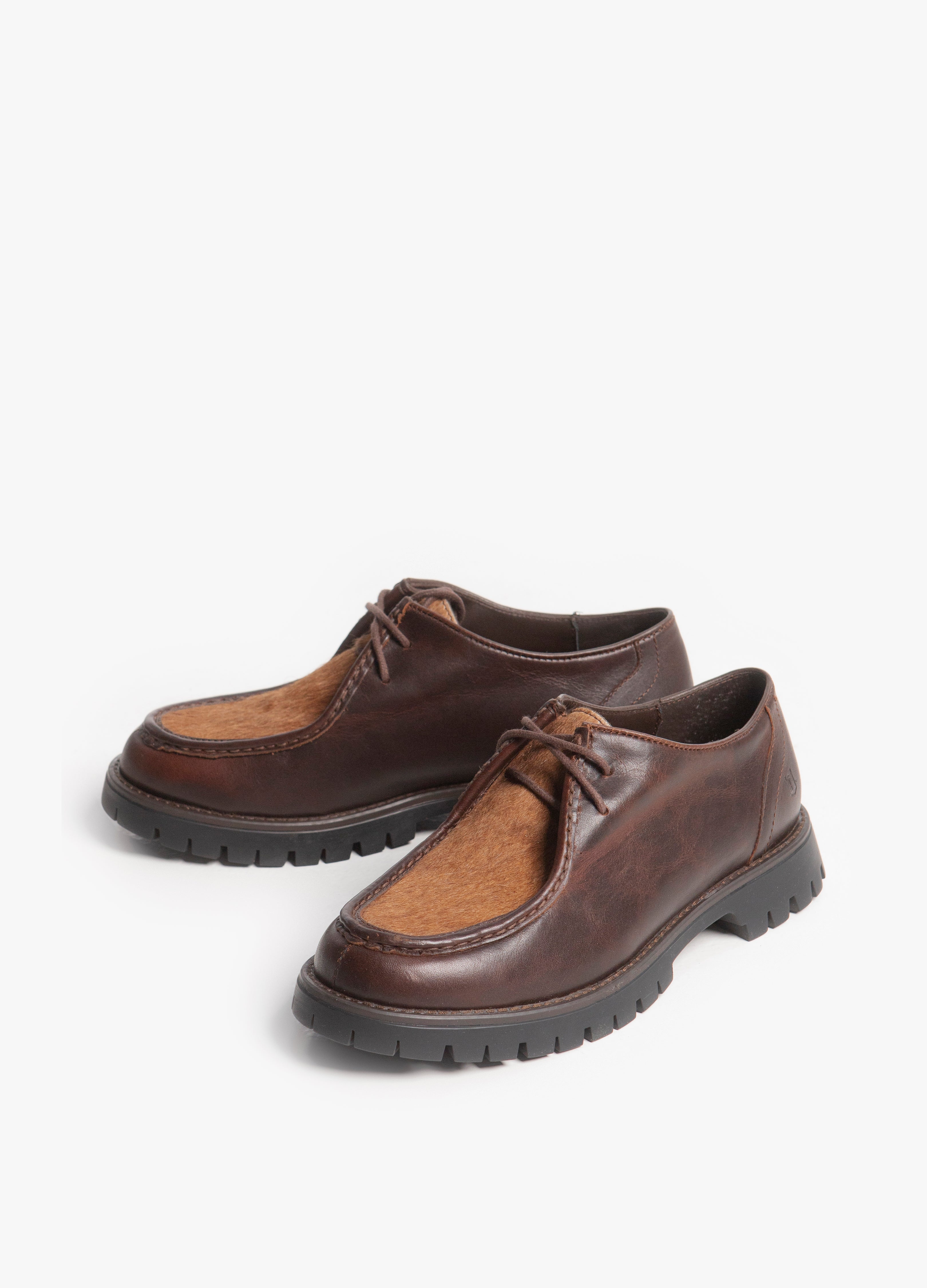 Zapato estilo wallabee, fabricado en piel de res color café, con suela gruesa de goma y empeine con pelaje natural.