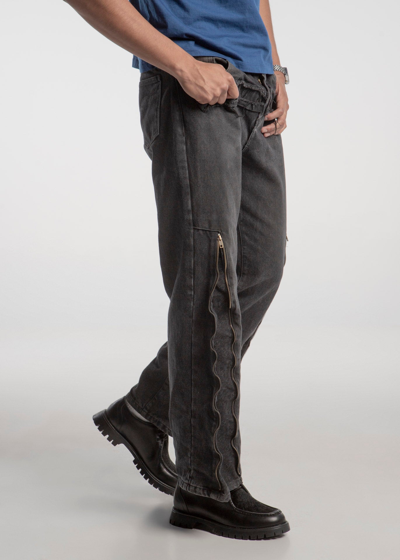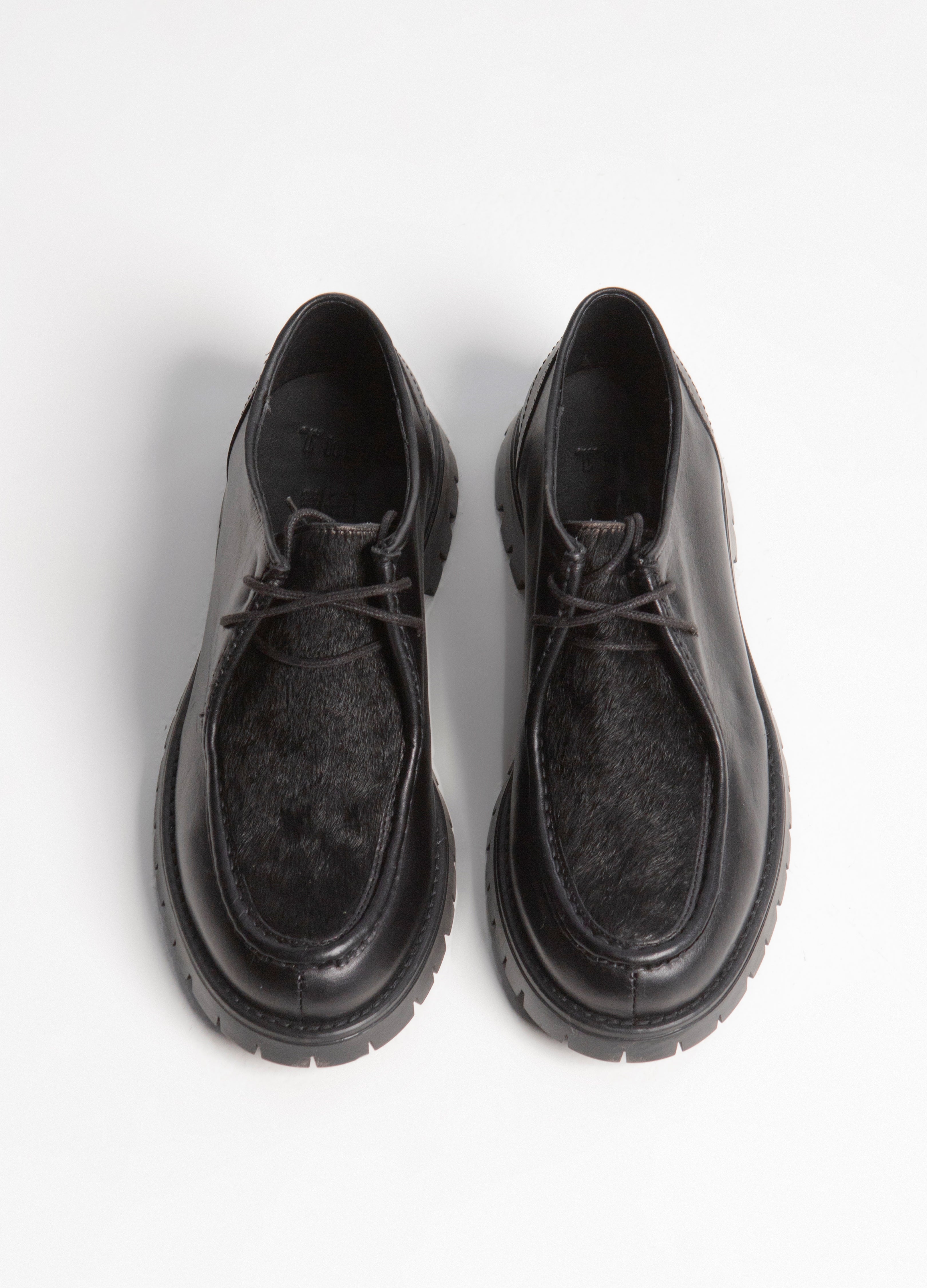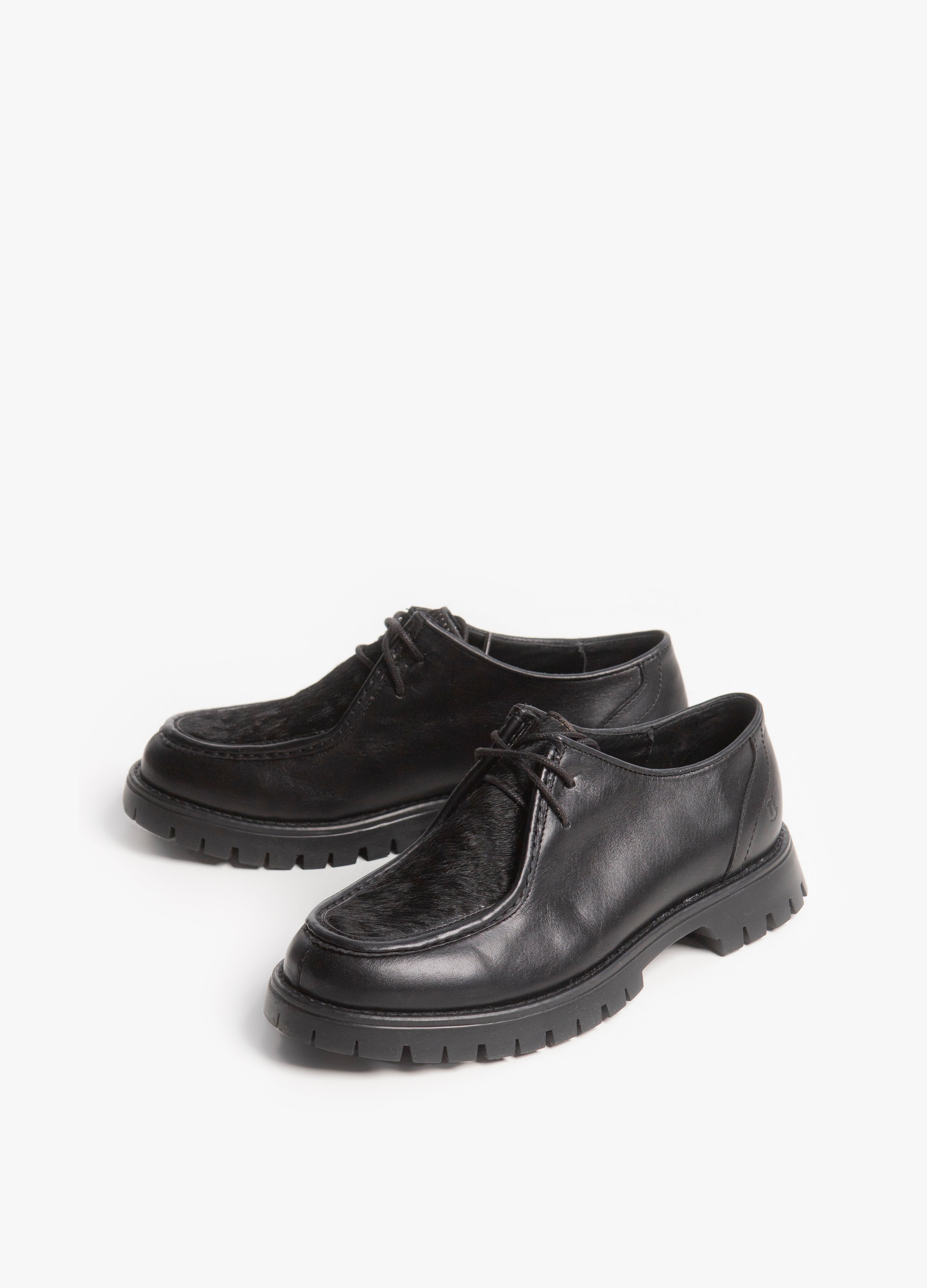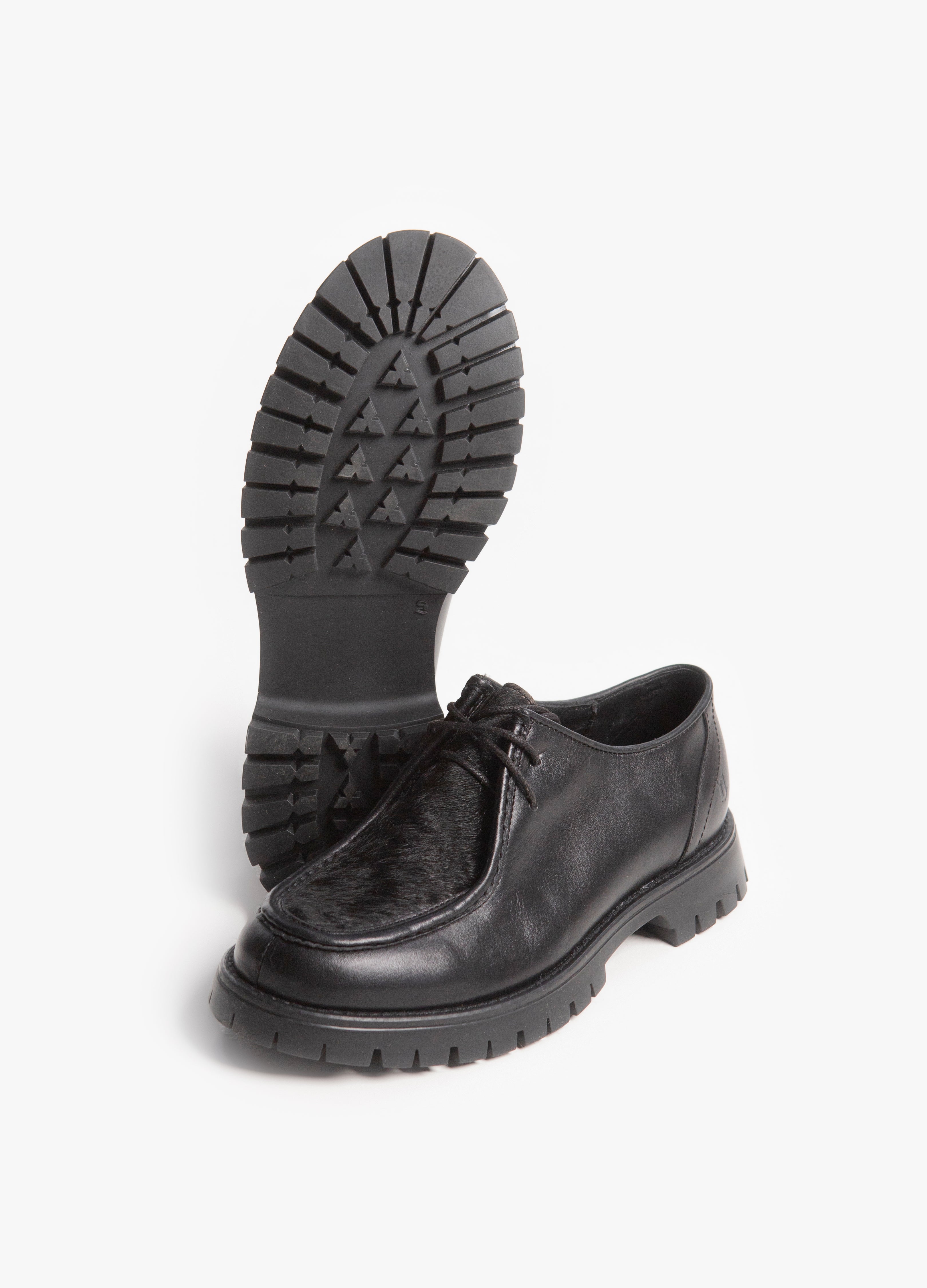 Zapato estilo wallabee, fabricado en piel de res color negro, con suela gruesa de goma y empeine con pelaje natural.