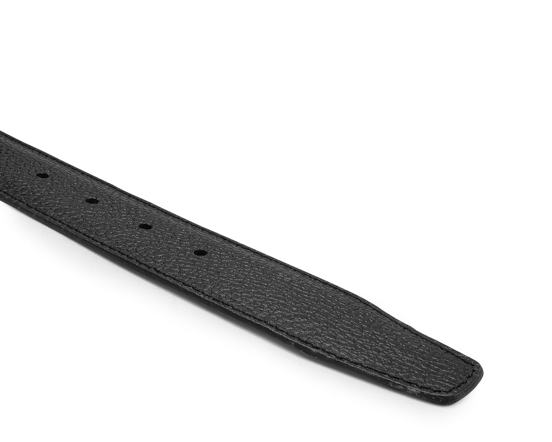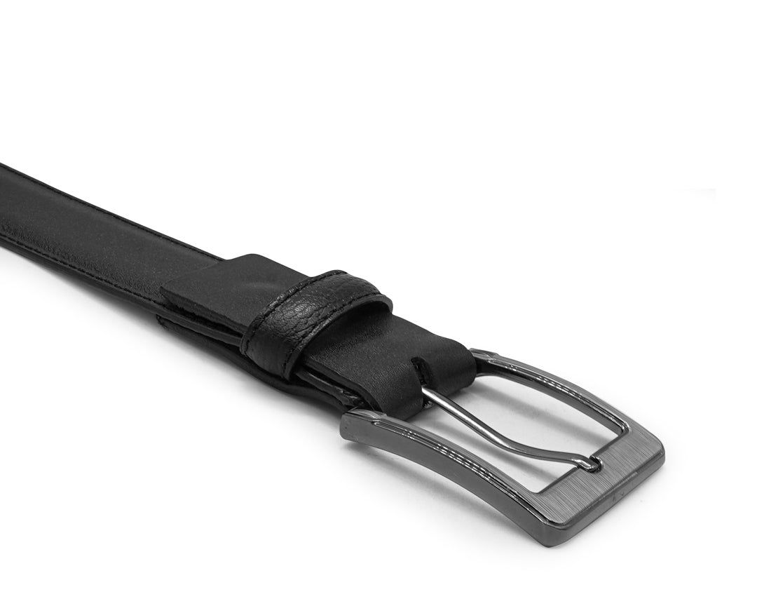 Cinto elegante de piel color negro, con acabado en atanado y punta en flother.