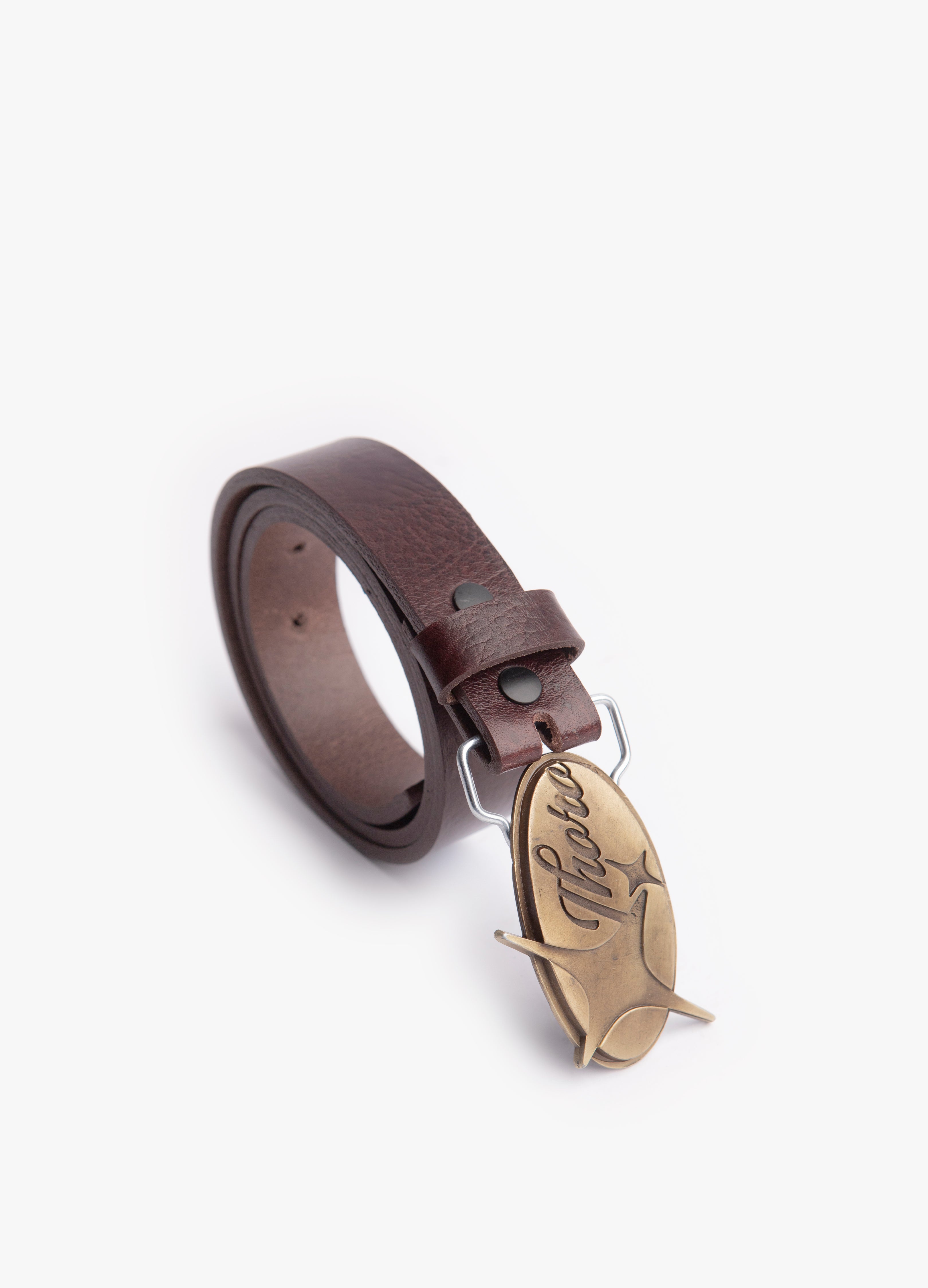 La protagonista es su imponente hebilla ovalada de metal envejecido en tono bronce, diseñada con la leyenda "Thoro" y grabados decorativos de dos estrellas en bajo relieve que evocan los destellos de una noche en Sin City.