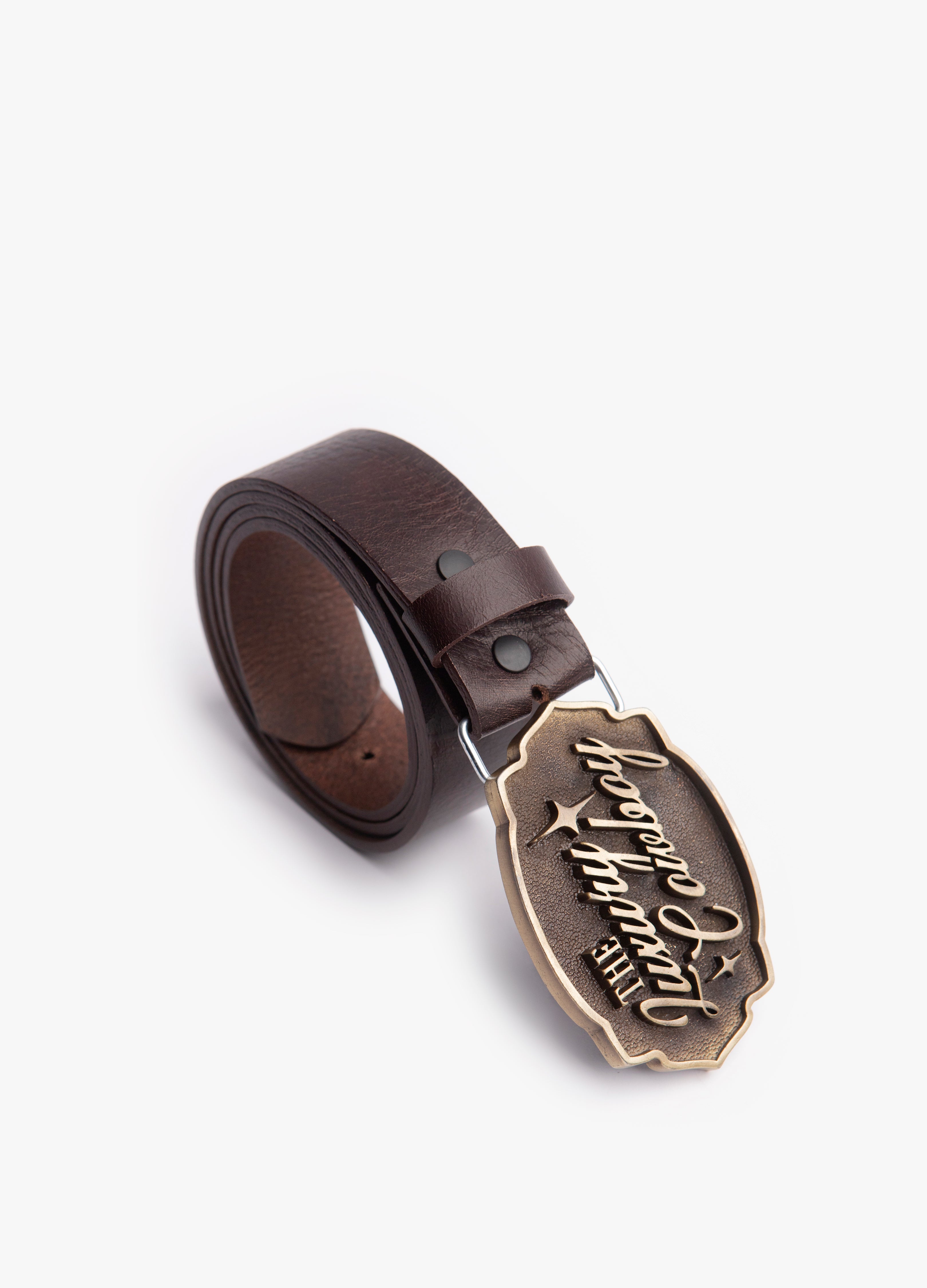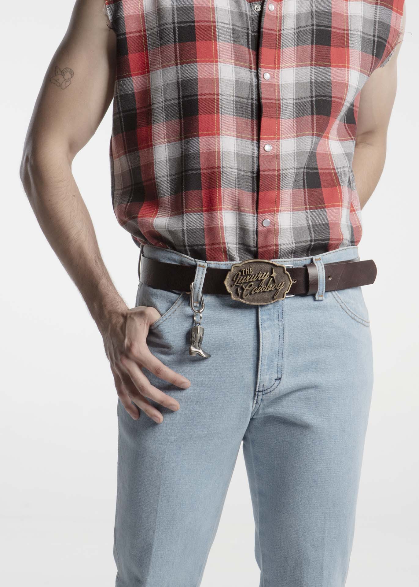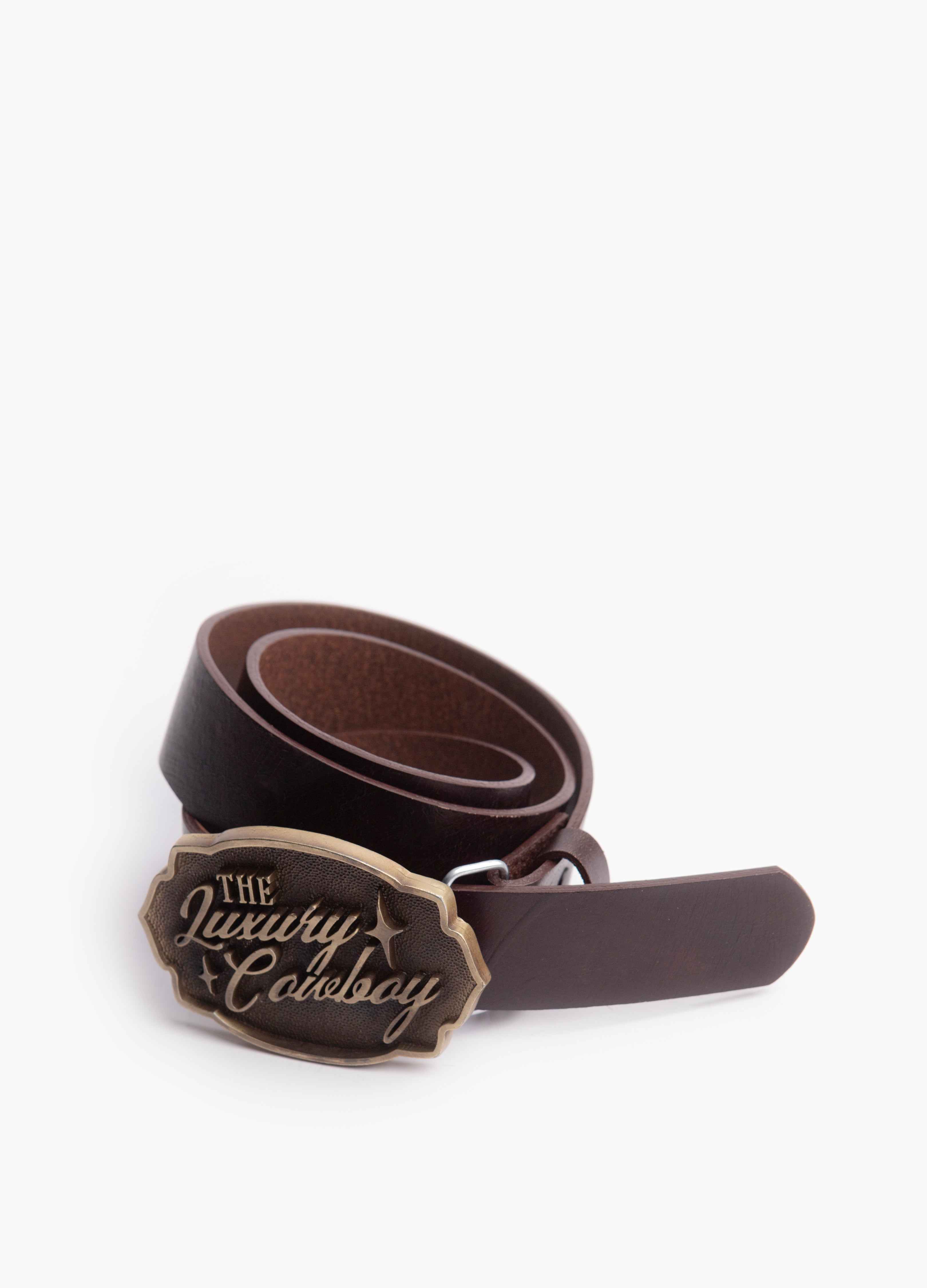 La protagonista es su imponente hebilla ornamentada de metal envejecido en tono bronce, diseñada con la leyenda "The Luxury Cowboy" y grabados decorativos que evocan las luces de Sin City.