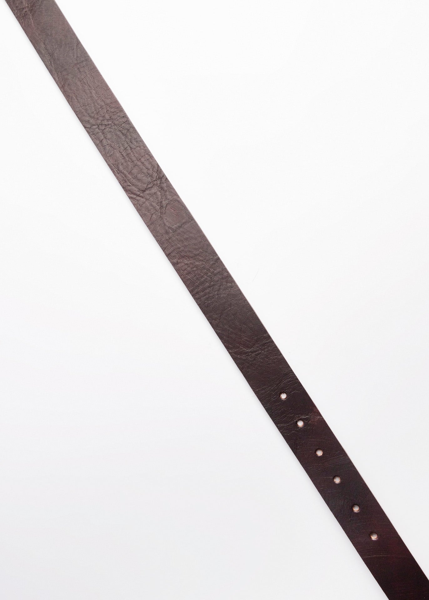 Confeccionado 100% piel, este cinturón luce un tono marrón oscuro que se adapta a cualquier estilo, aportando calidez y autenticidad. Su acabado mate resalta la veta única de la piel, haciendo de cada pieza algo irrepetible.