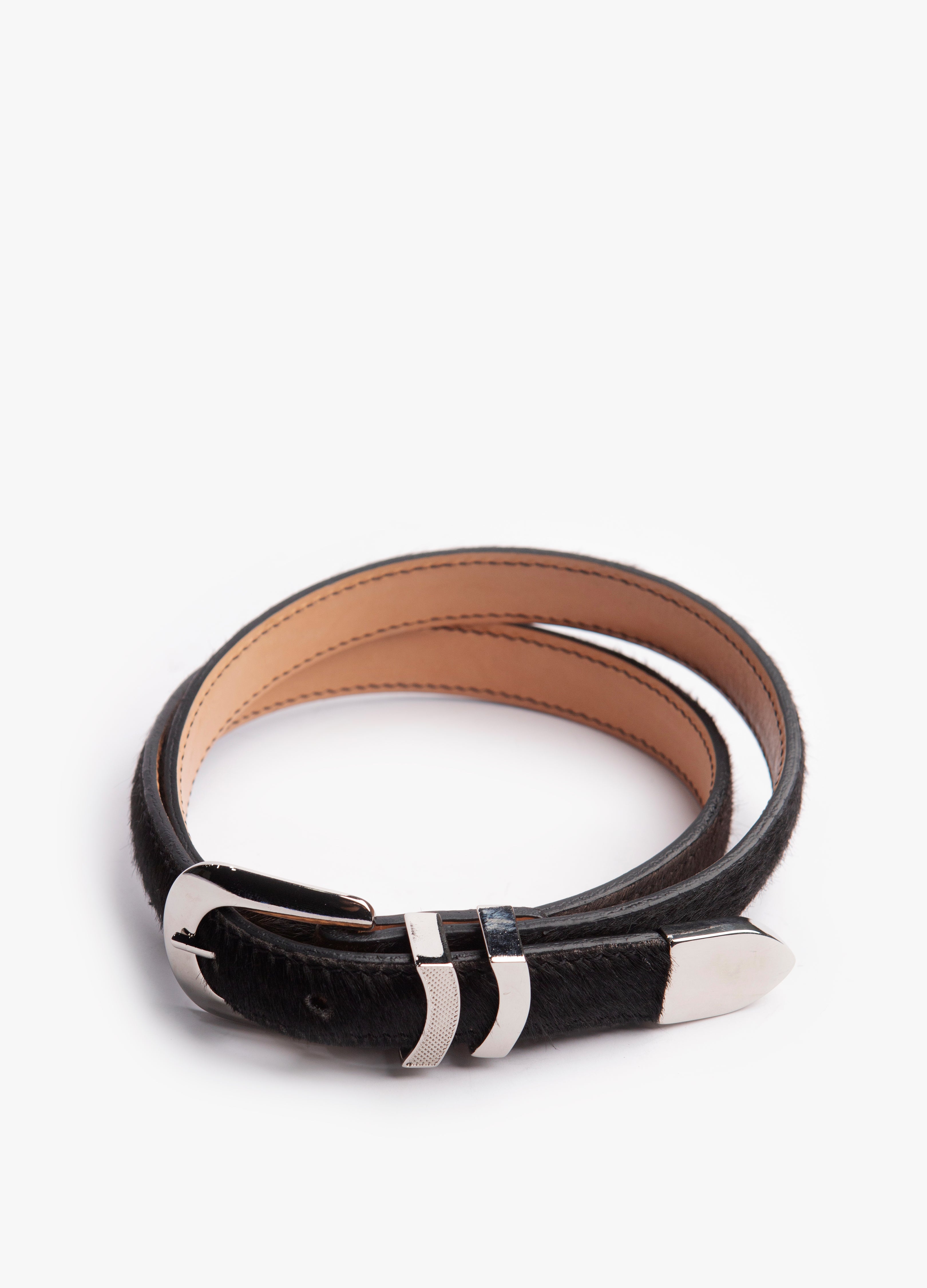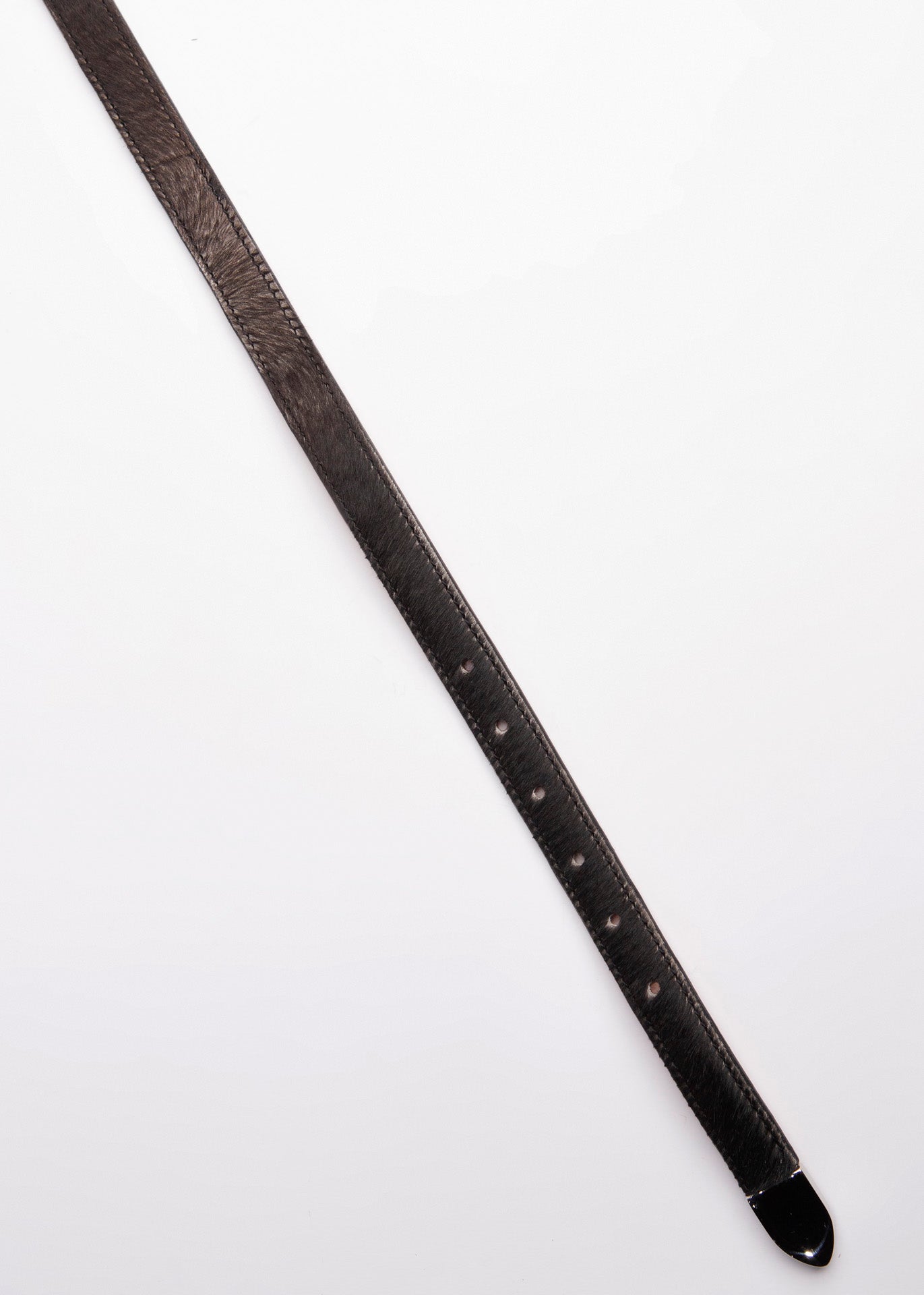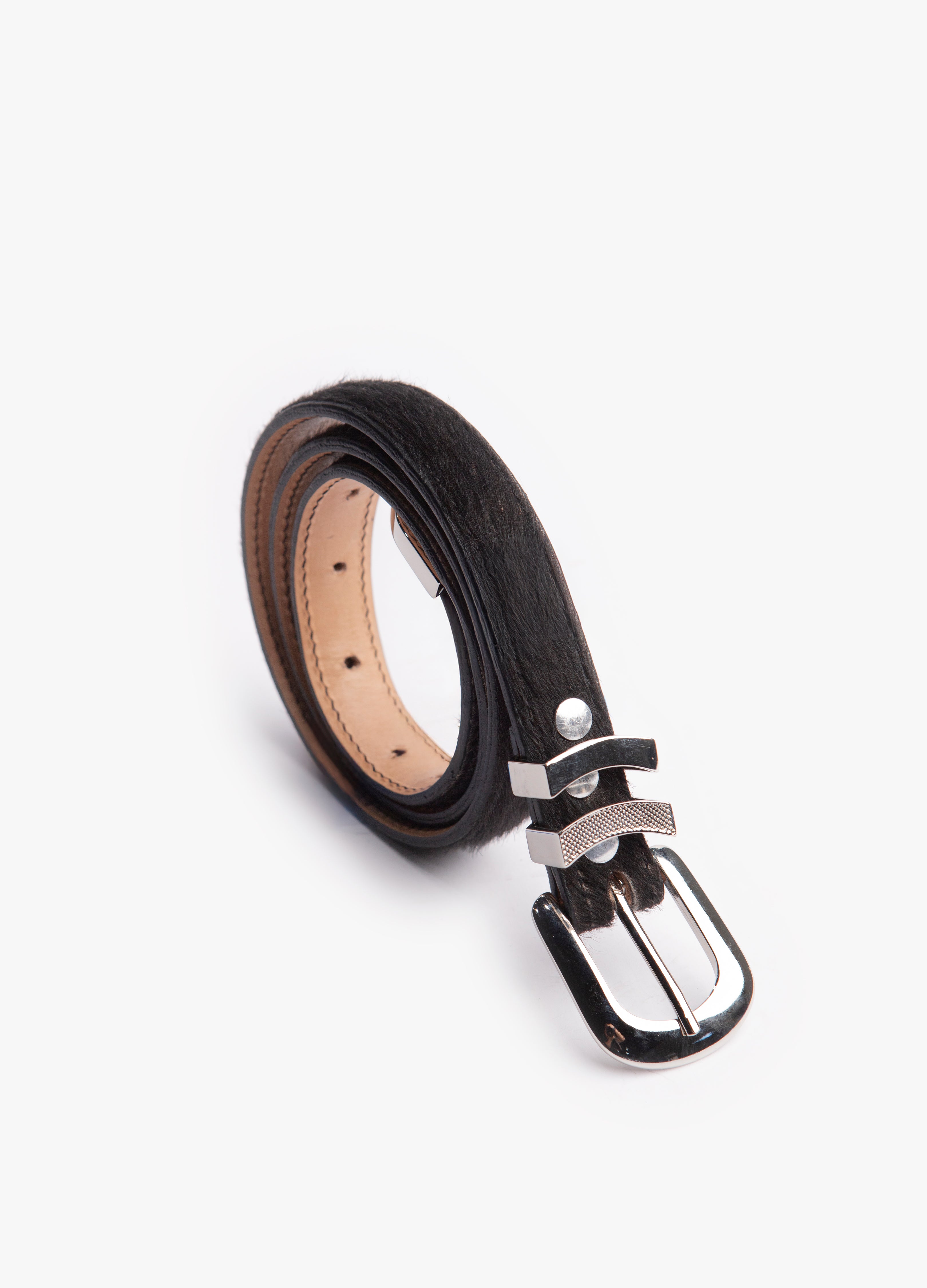 Este cinturón exclusivo está confeccionado en piel genuina de res con acabado en pelo natural, lo que le confiere una textura única y un aspecto sofisticado de inspiración artesanal. Su diseño delgado y elegante lo convierte en un accesorio versátil, ideal tanto para atuendos casuales como para ocasiones formales donde se busca proyectar autenticidad y estilo refinado.