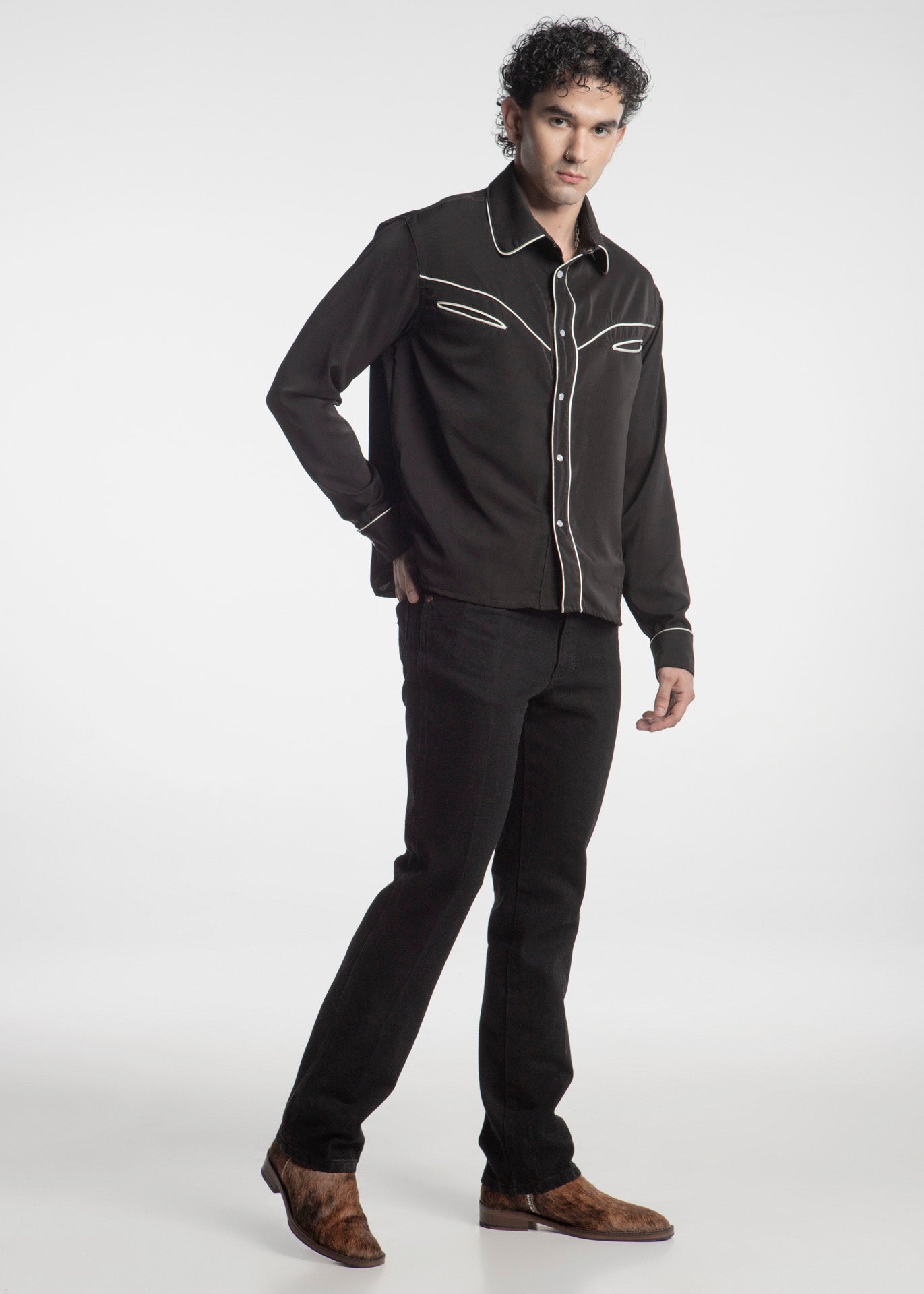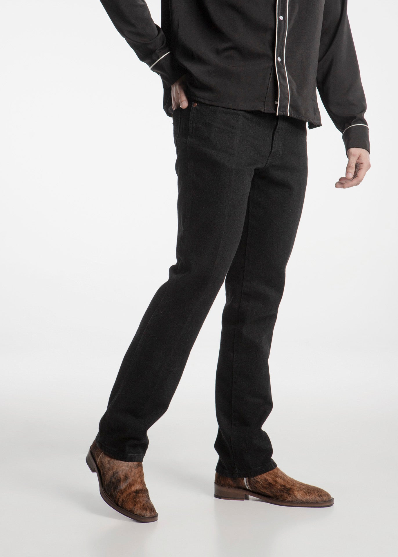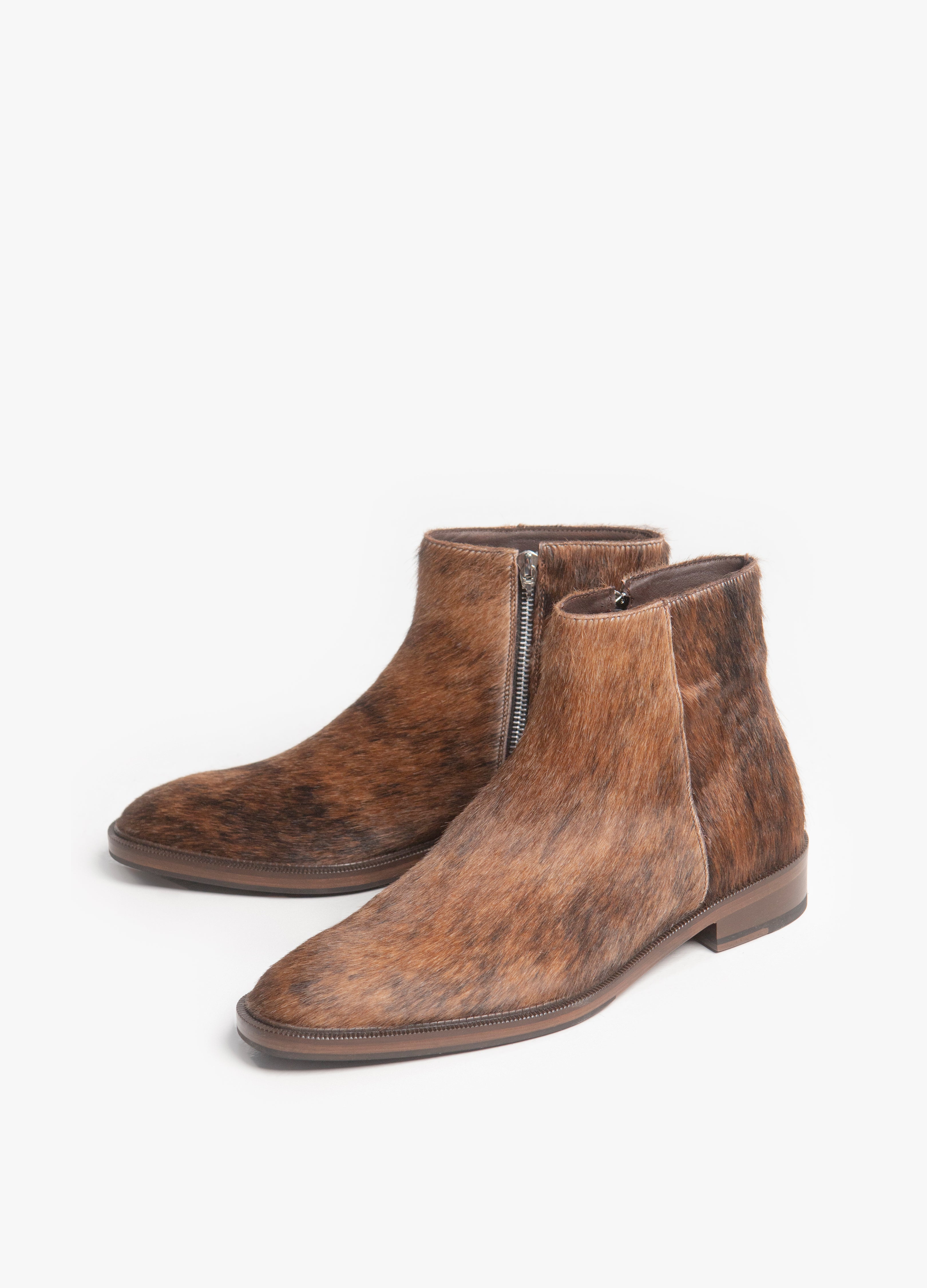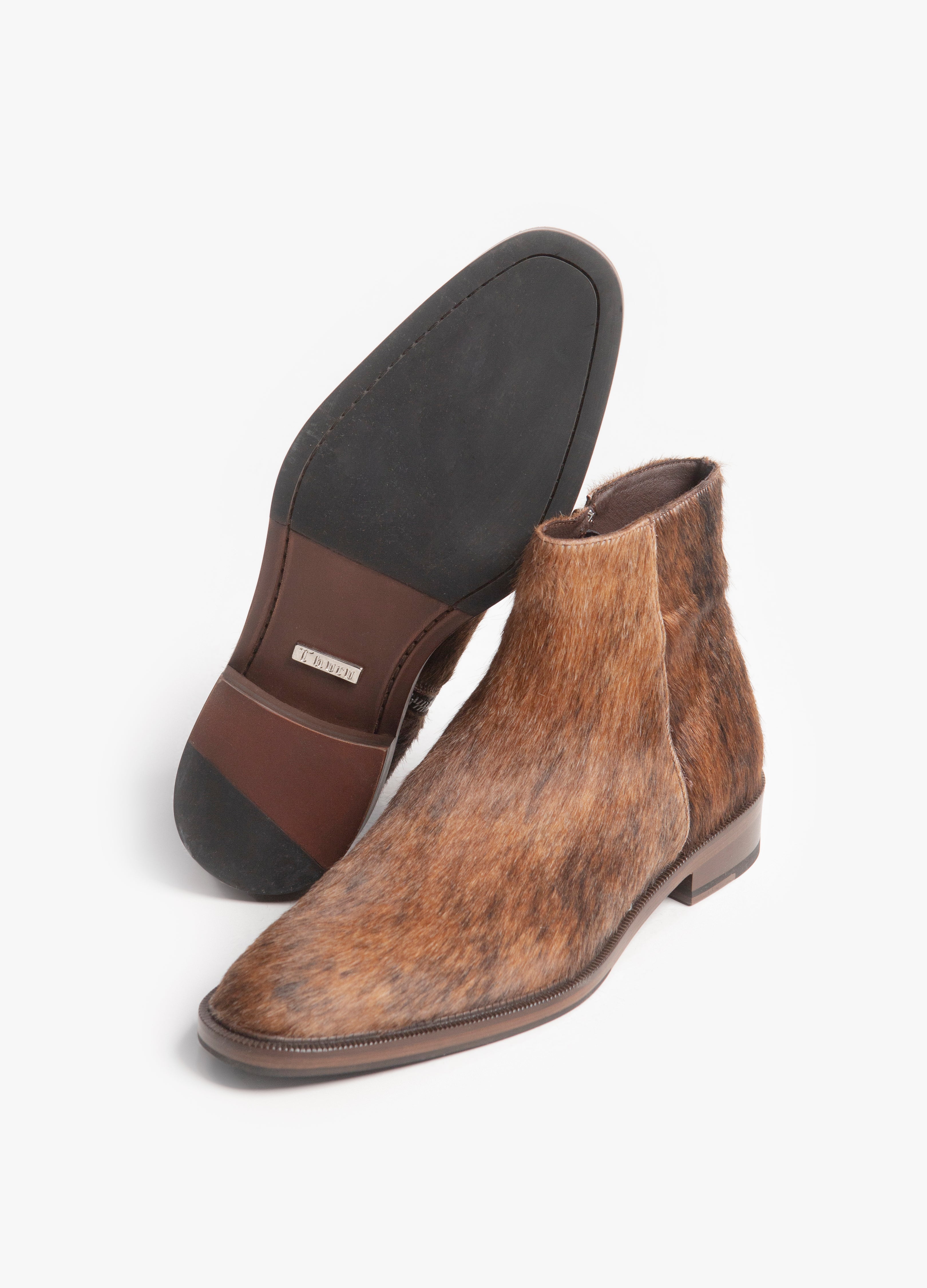 Botín fabricado en piel de res con pelaje natural atrigado y cierre lateral metálico con suela antiderrapante.
