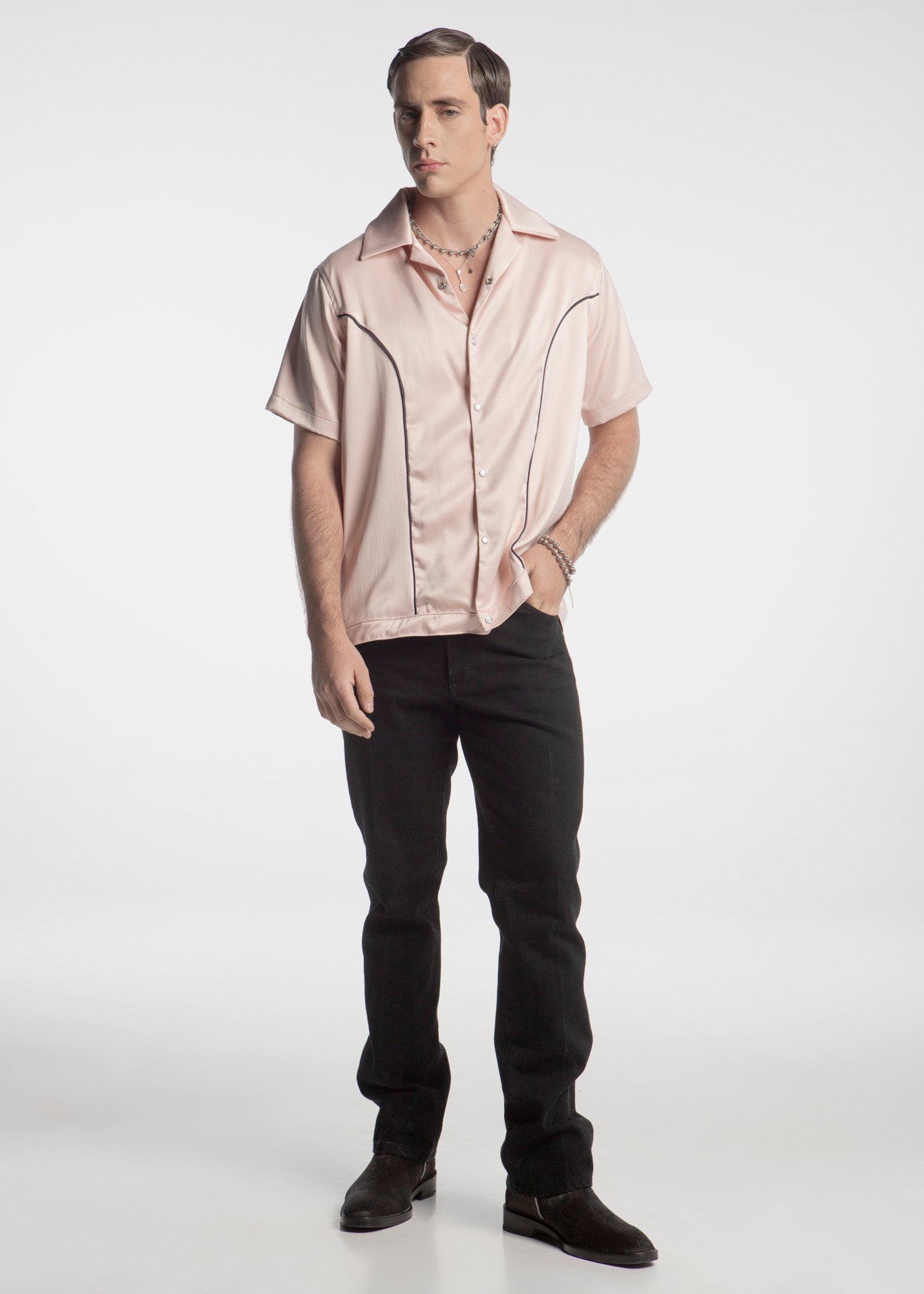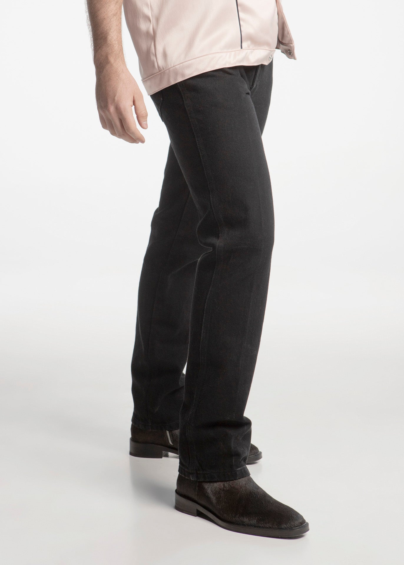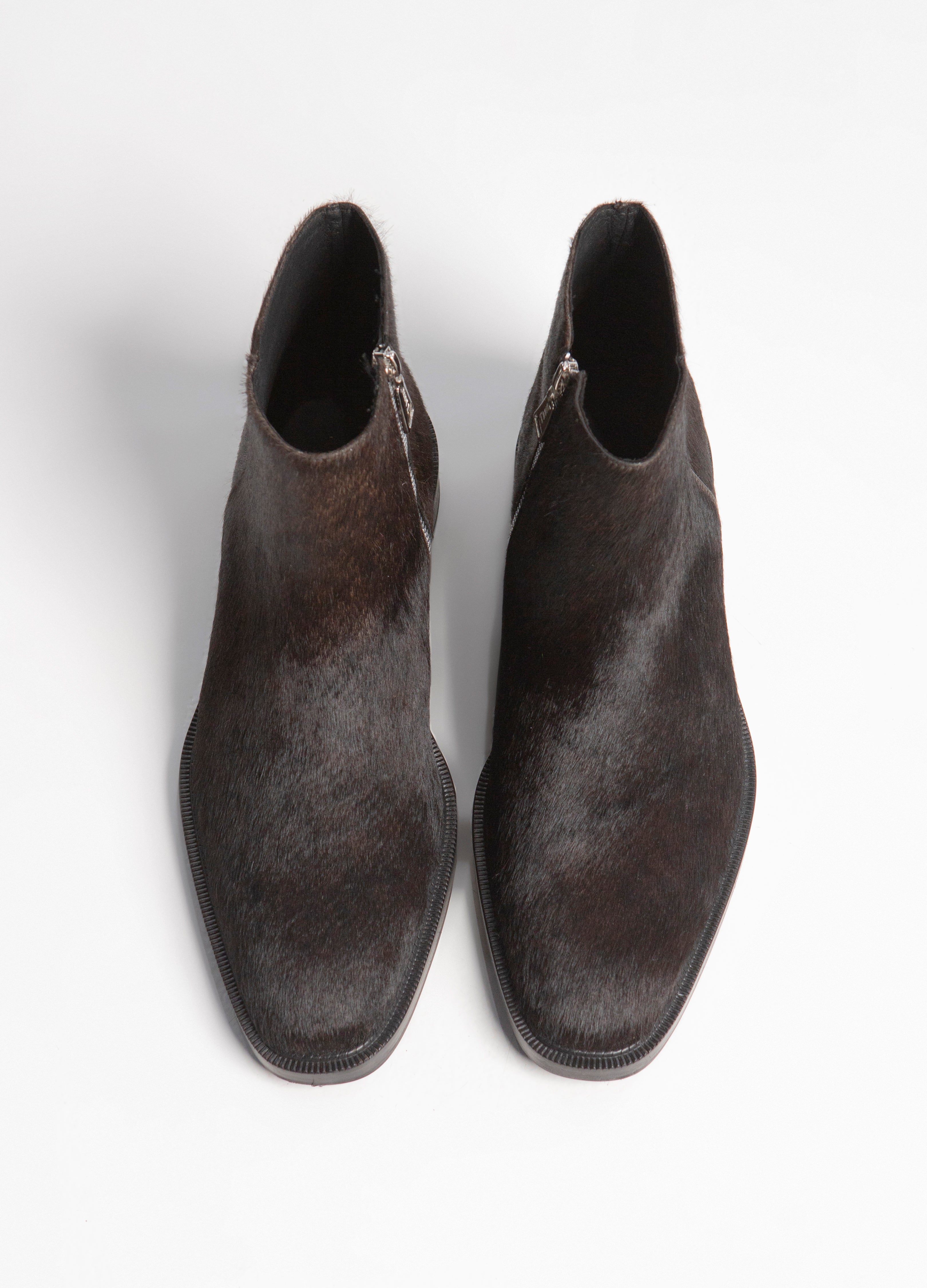 Botín fabricado en piel de res con pelaje natural negro y cierre lateral metálico.