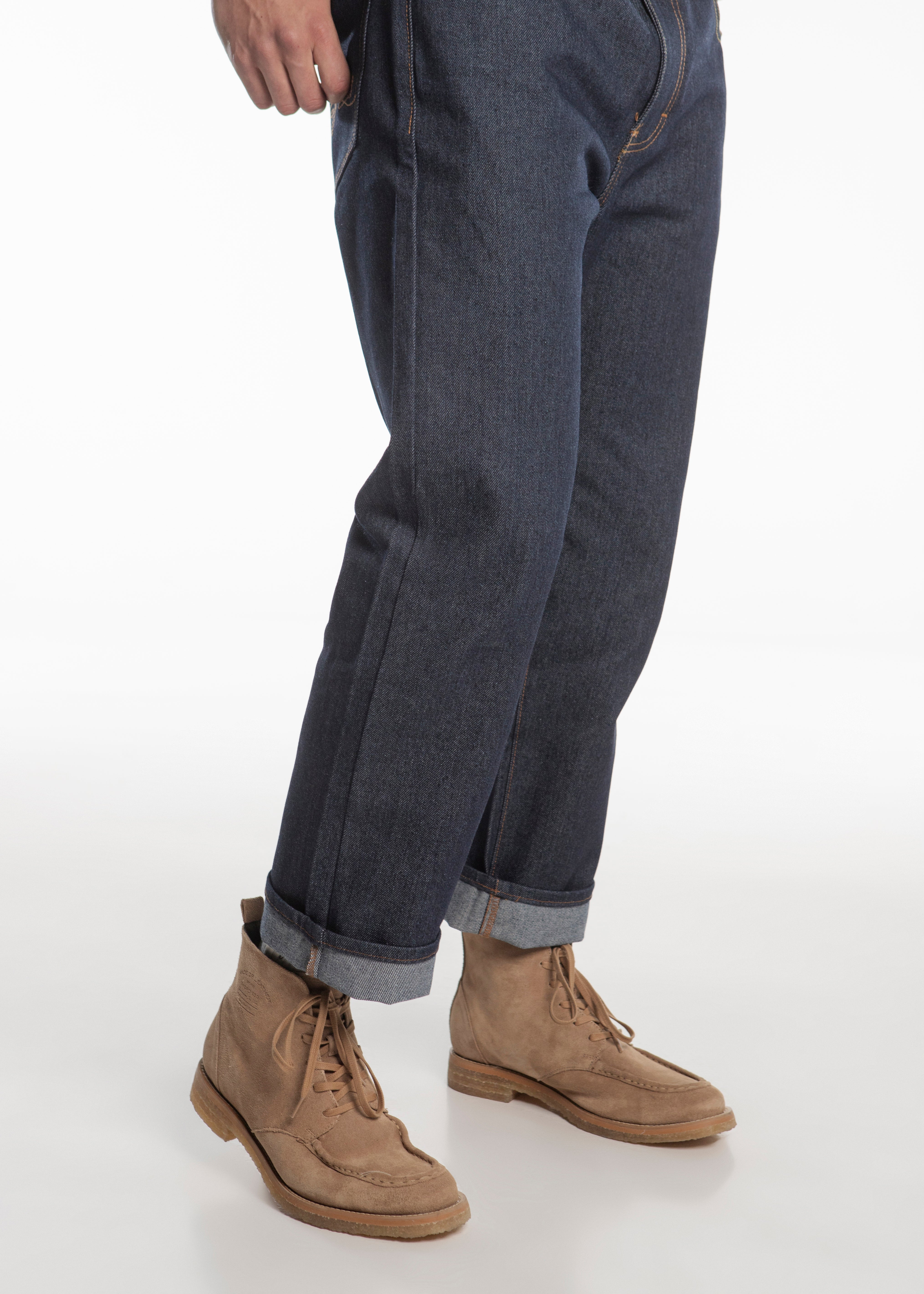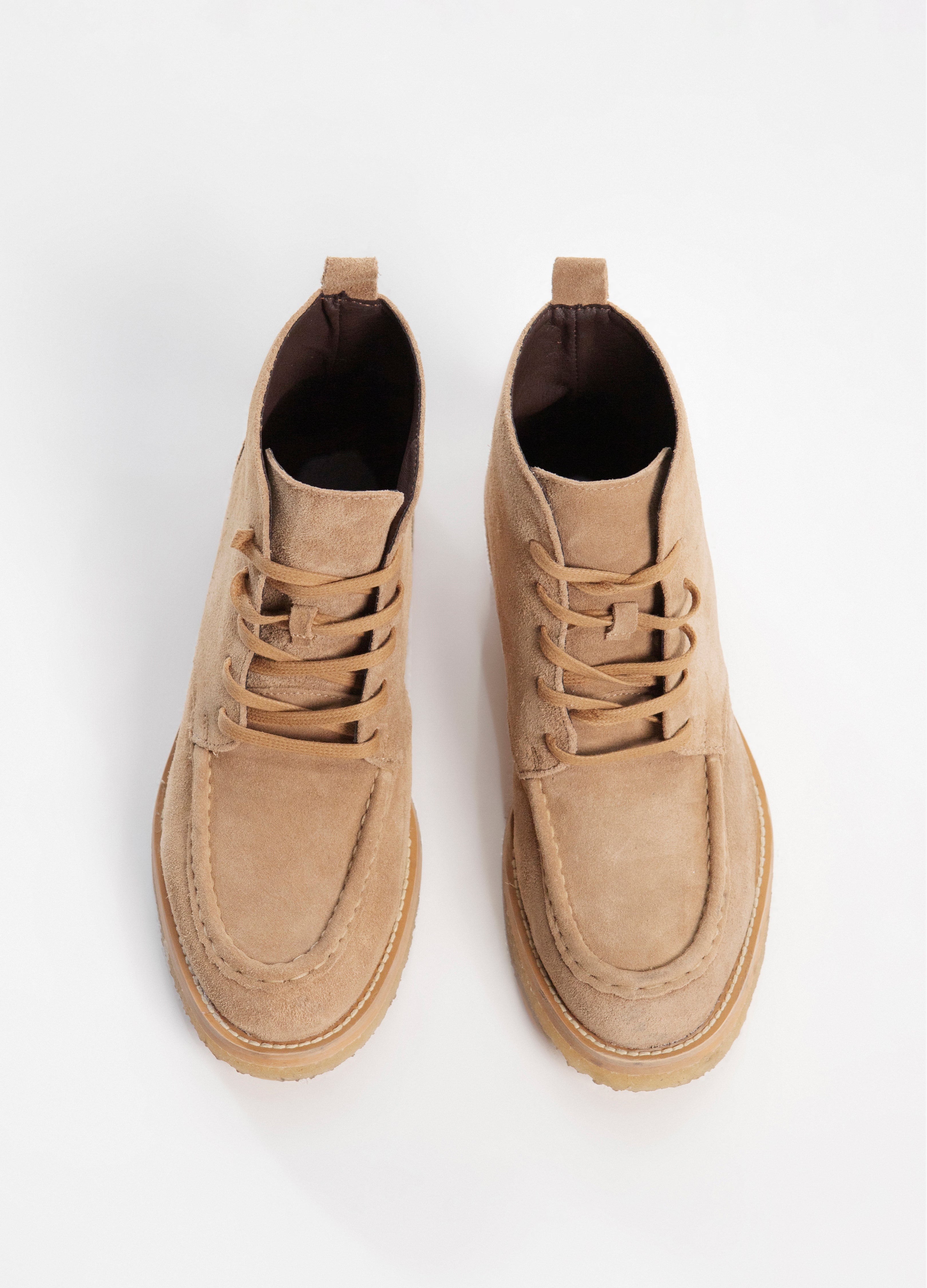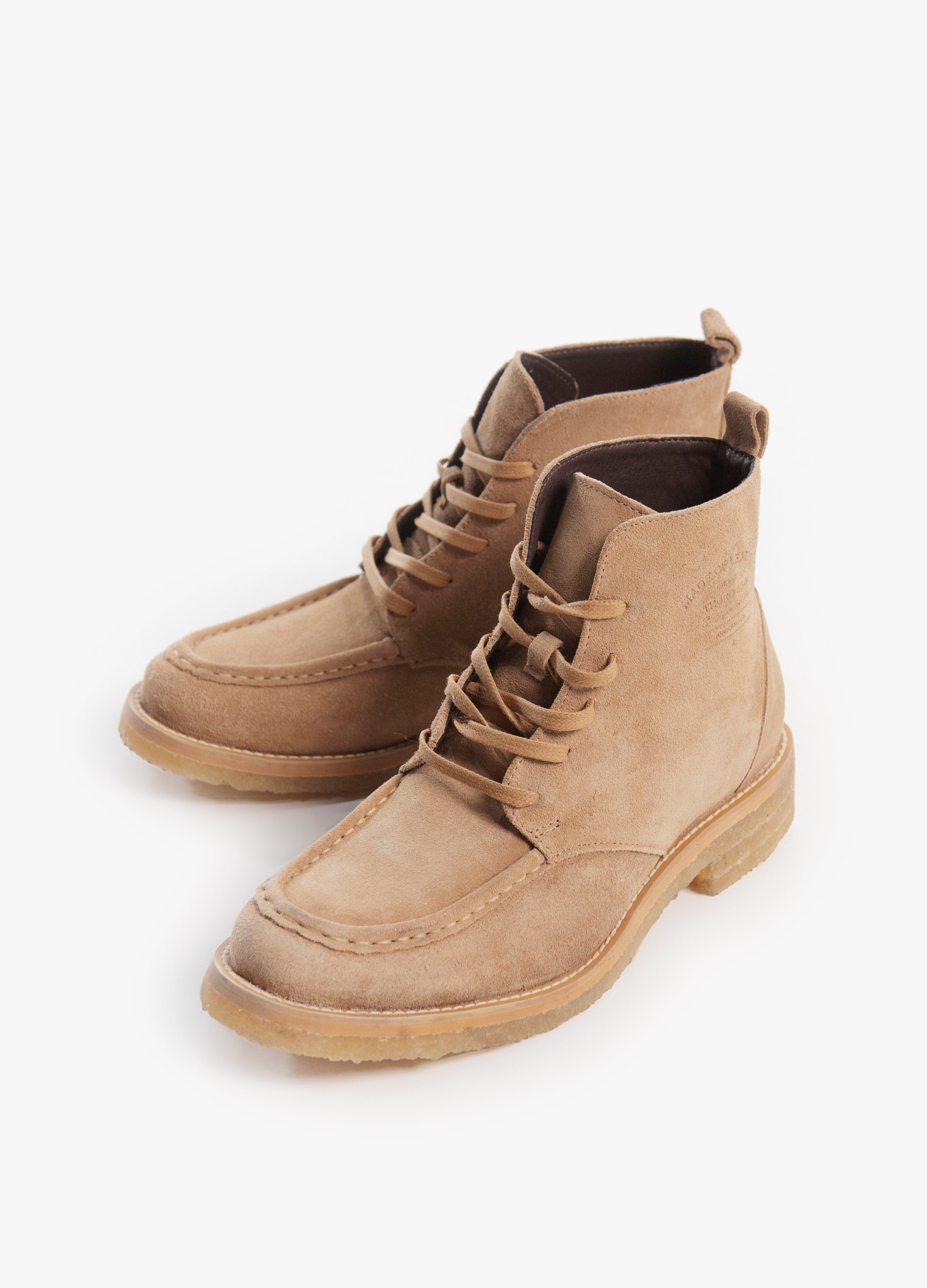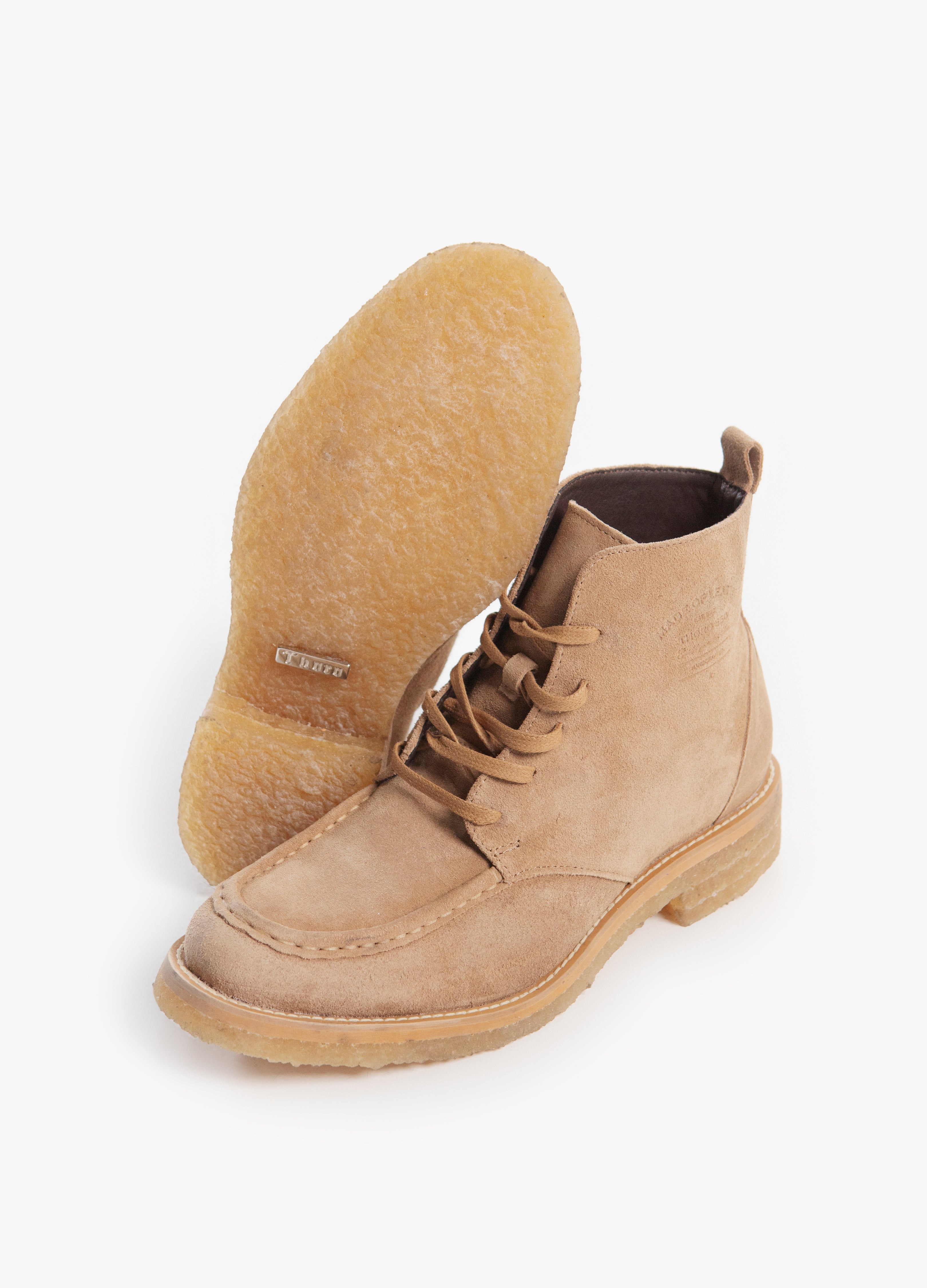 Botas estilo Moc Toe fabricas en piel gamuza color arena, con suela de goma crepe natural.