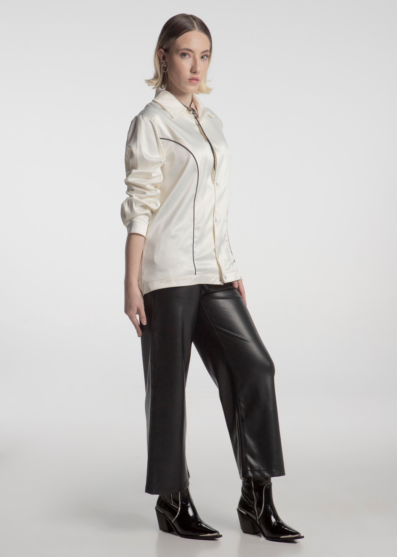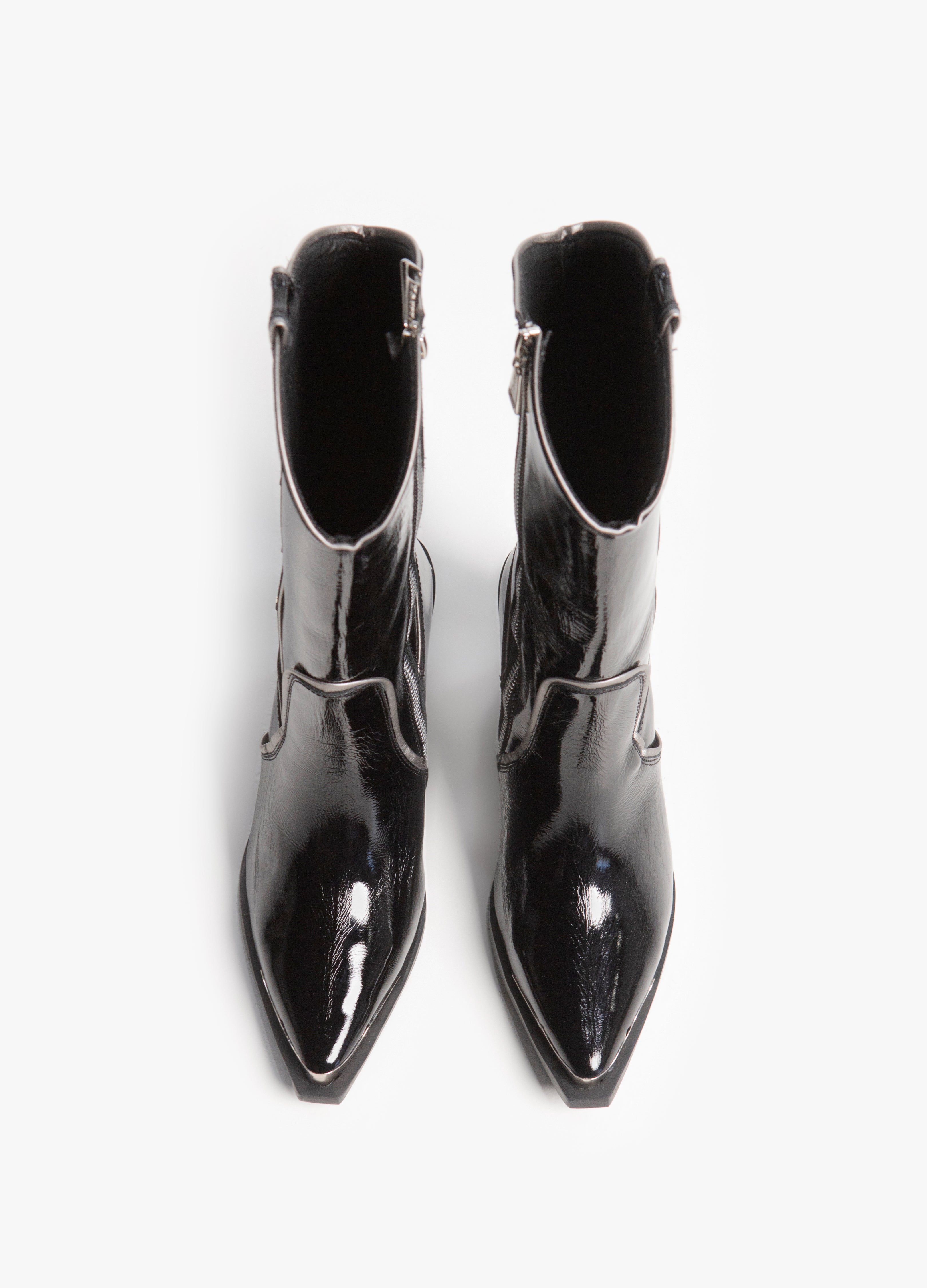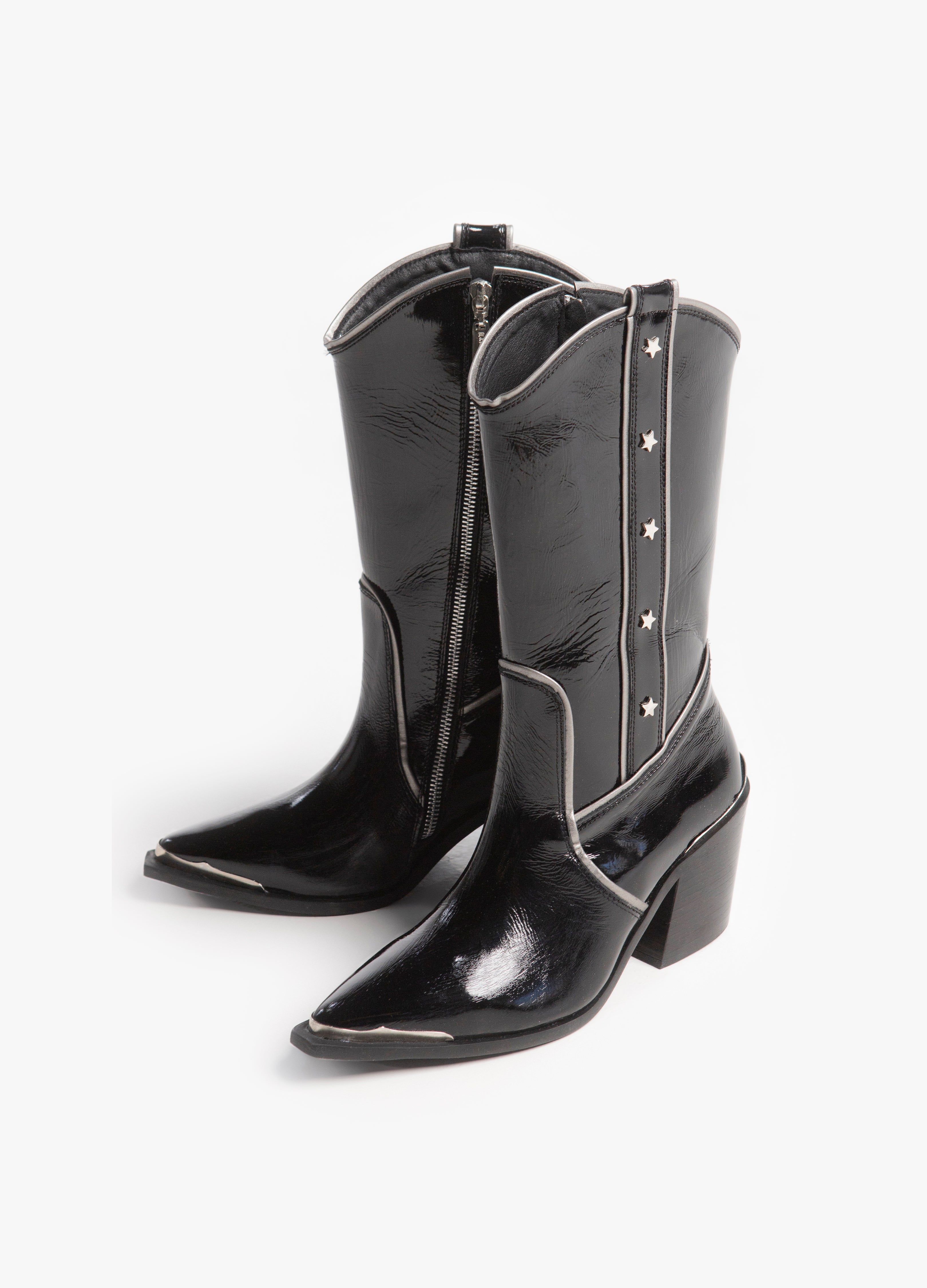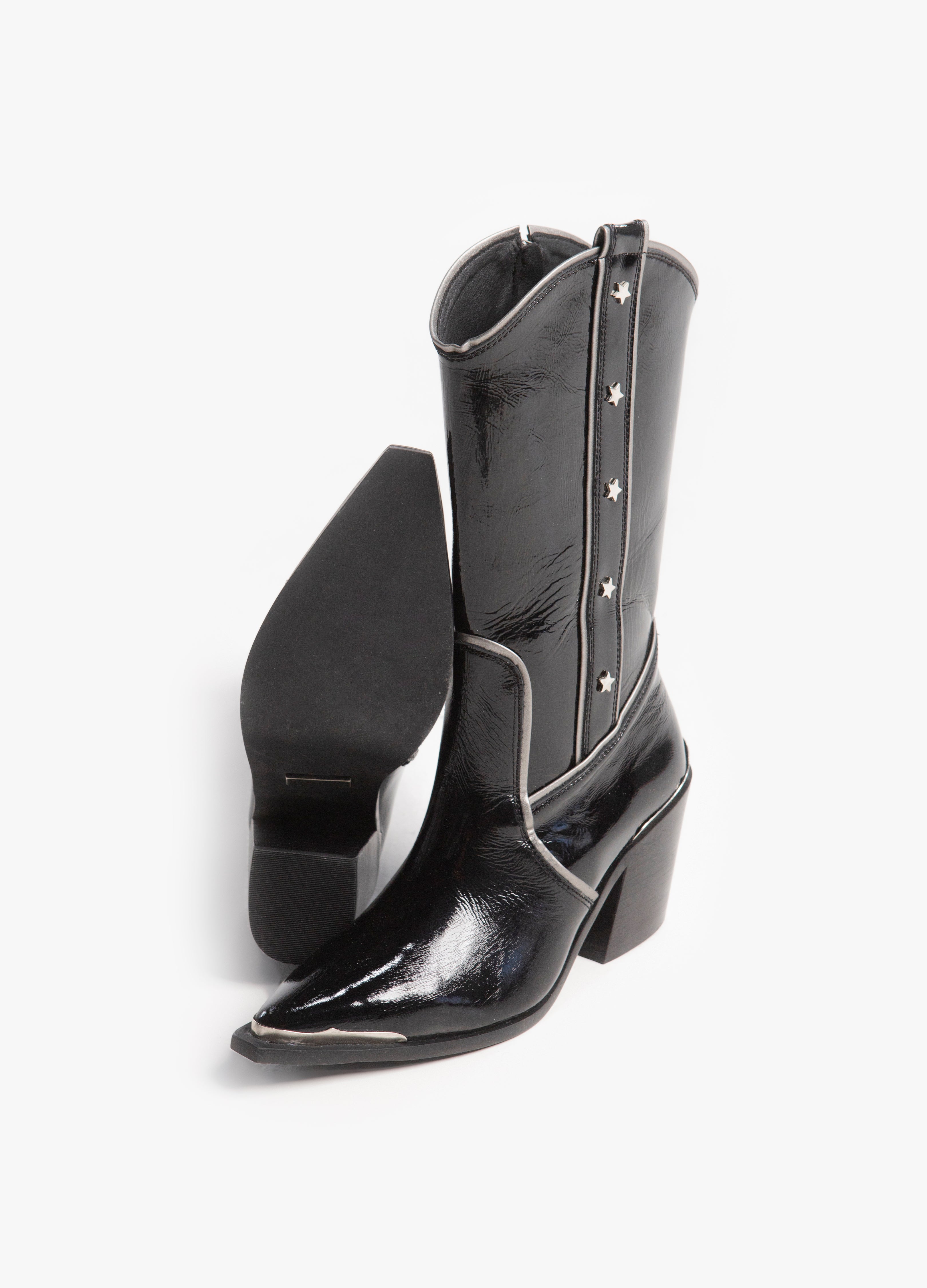 Bota vaquera (de tubo alto) fabricada en piel de res color negro acabado brillante con cierre lateral plateado, tacón cubano y punta metálica. Adornada con ribetes plateados y estrellas en el tubo.