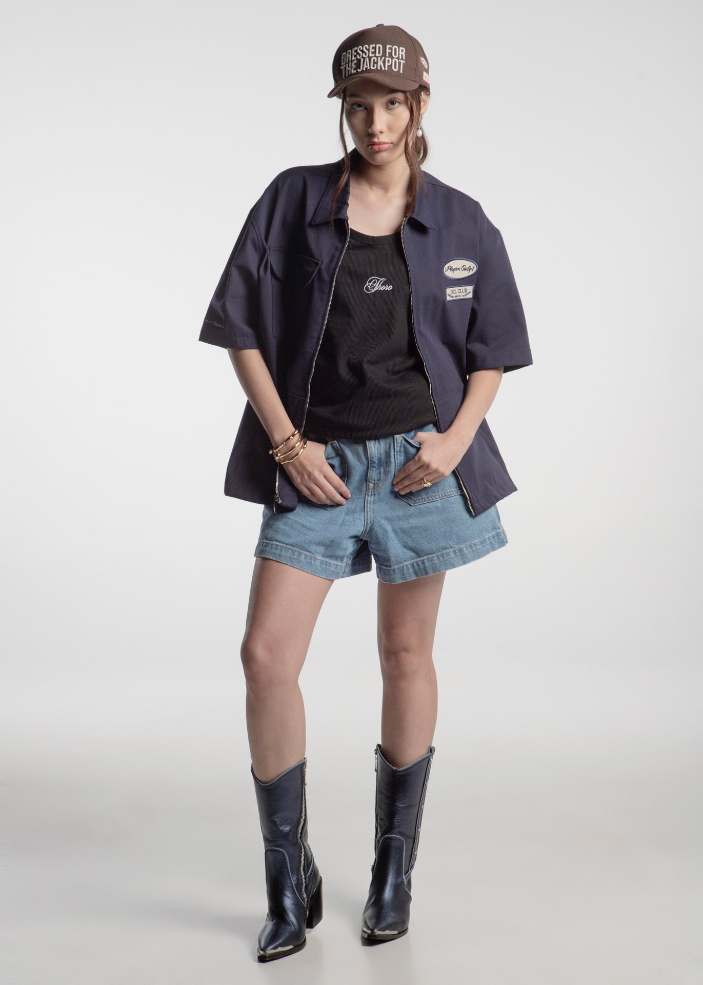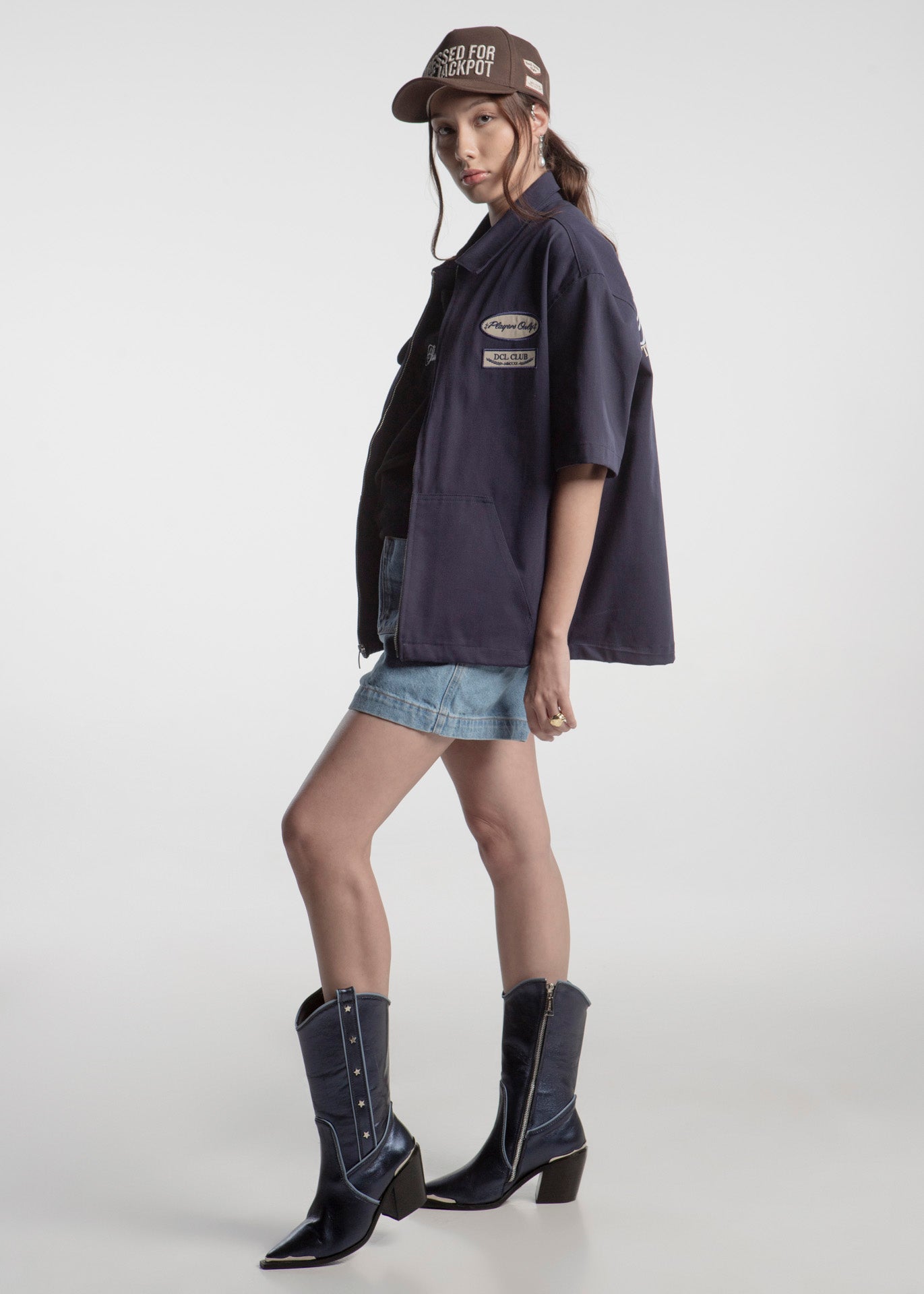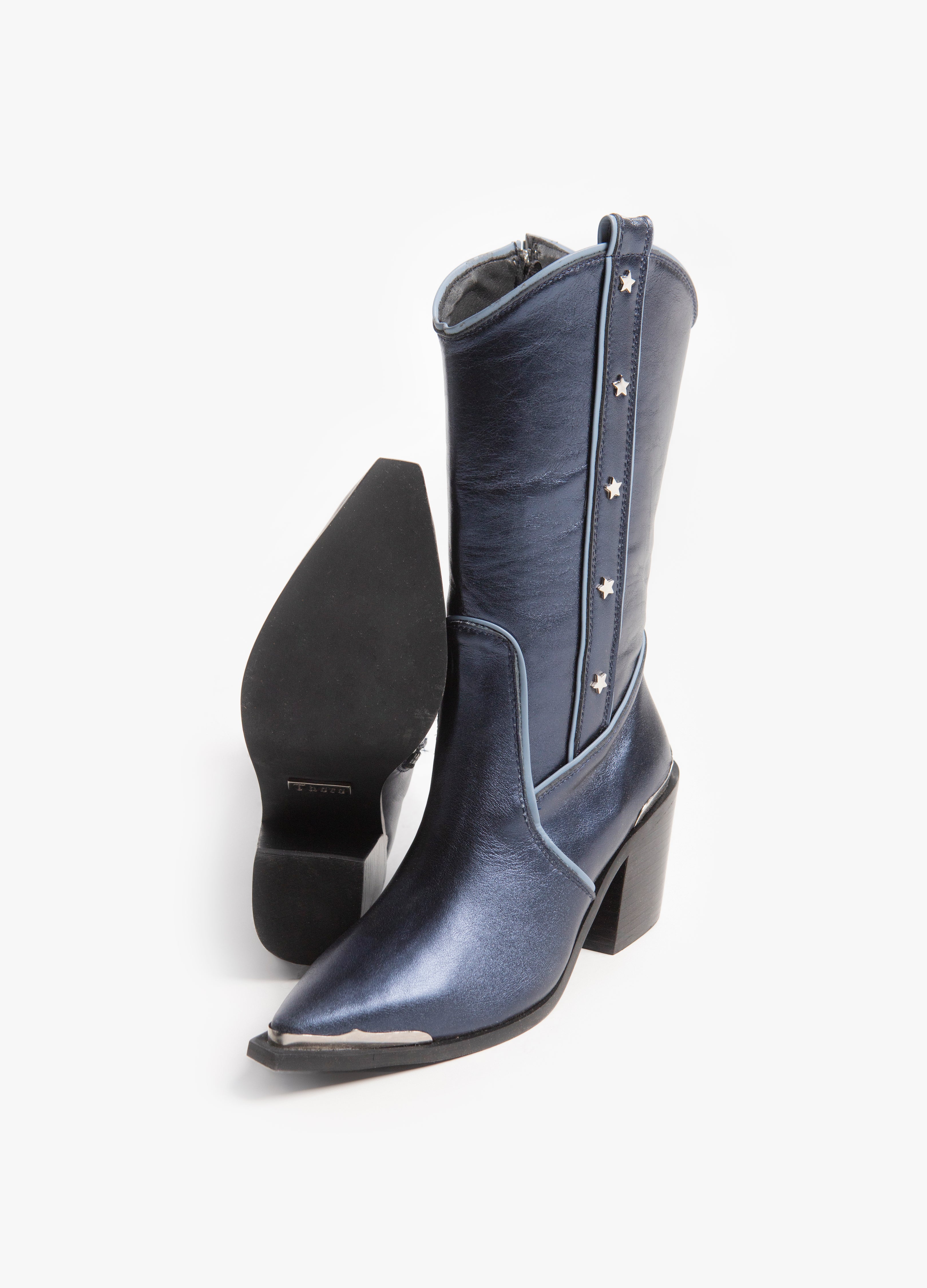 Bota vaquera (de tubo alto) fabricada en piel de res color azul acabado metálico con cierre lateral plateado, tacón cubano y punta metálica. Adornada con ribetes celestes y estrellas en el tubo.