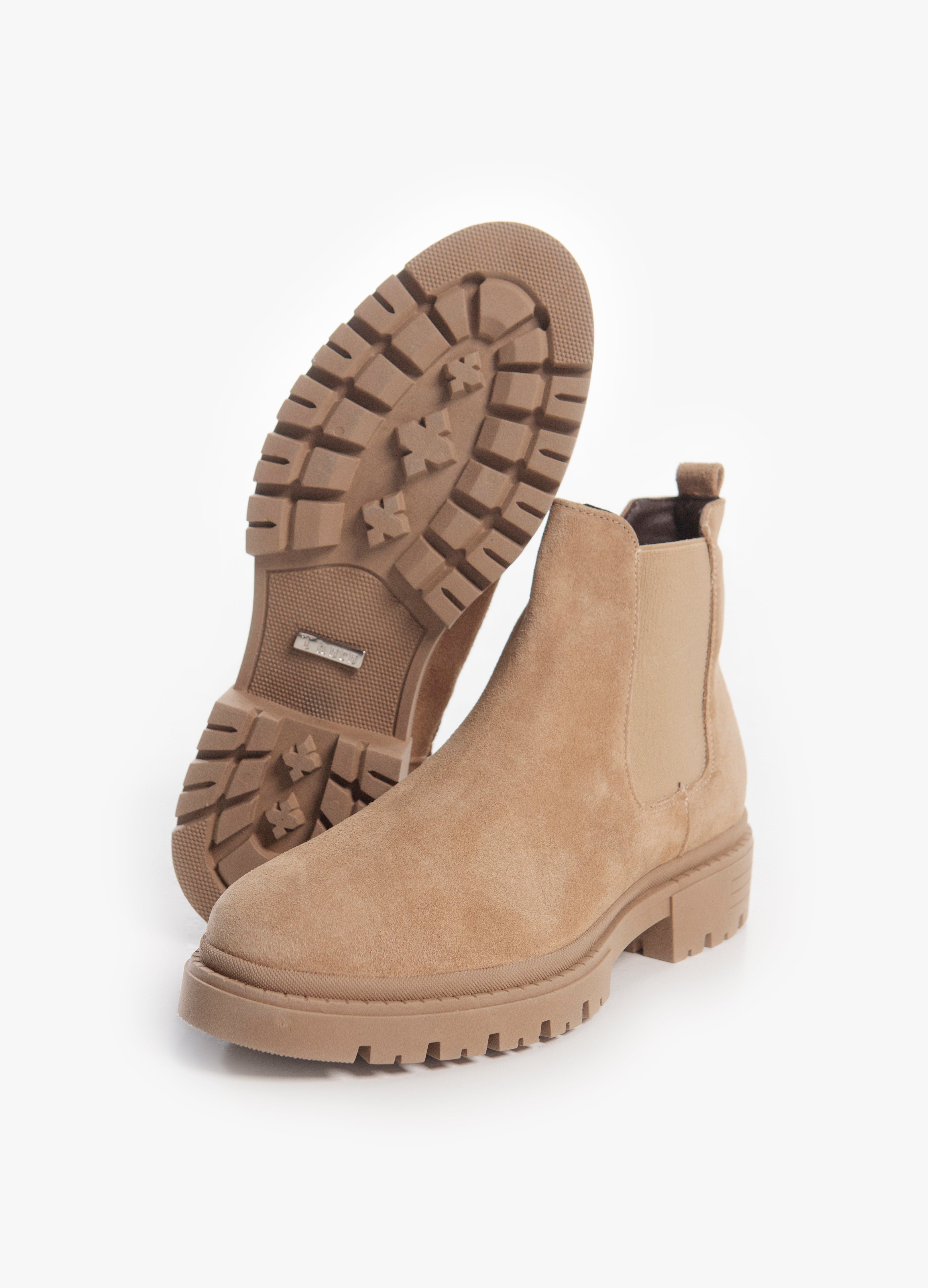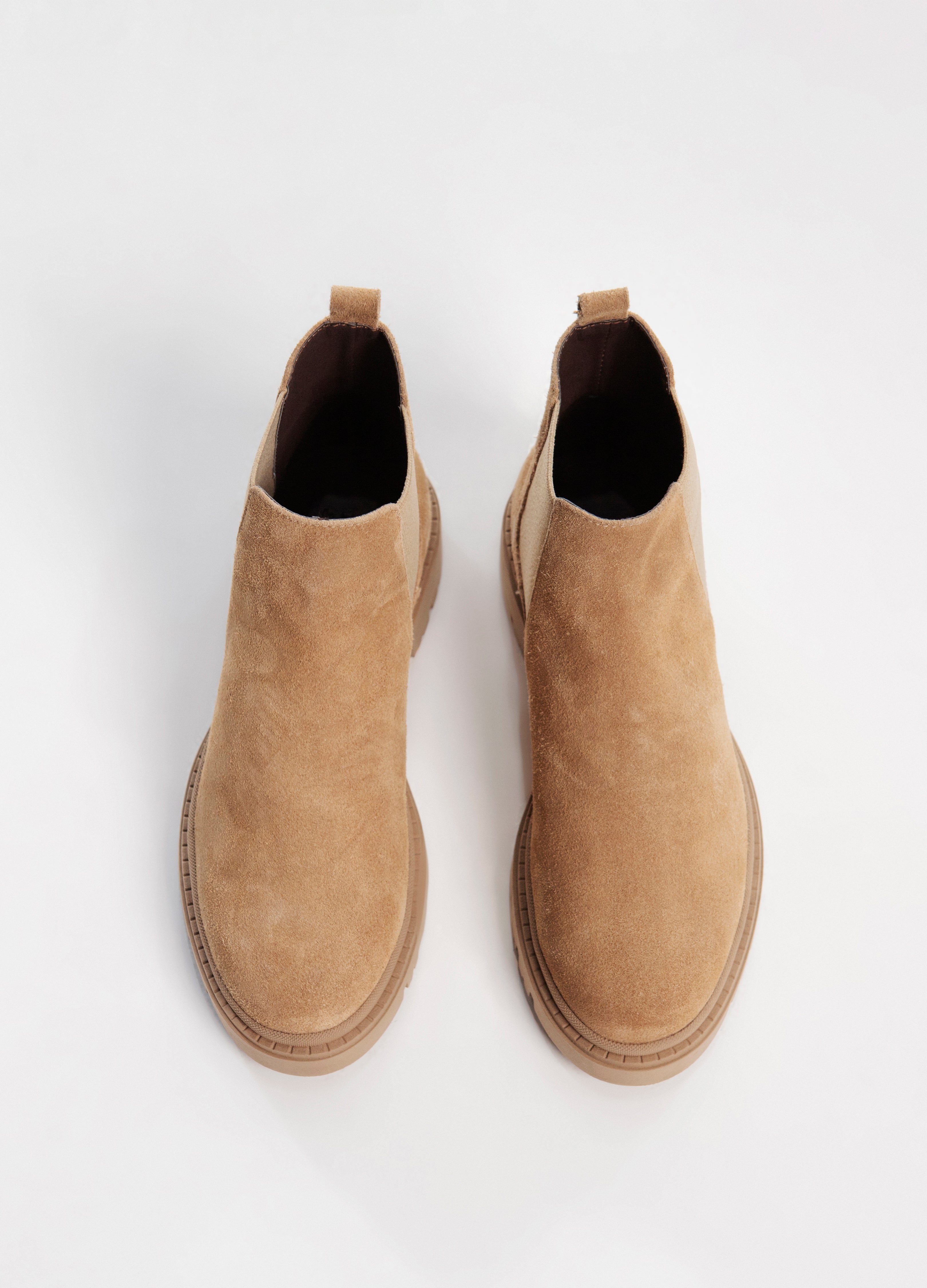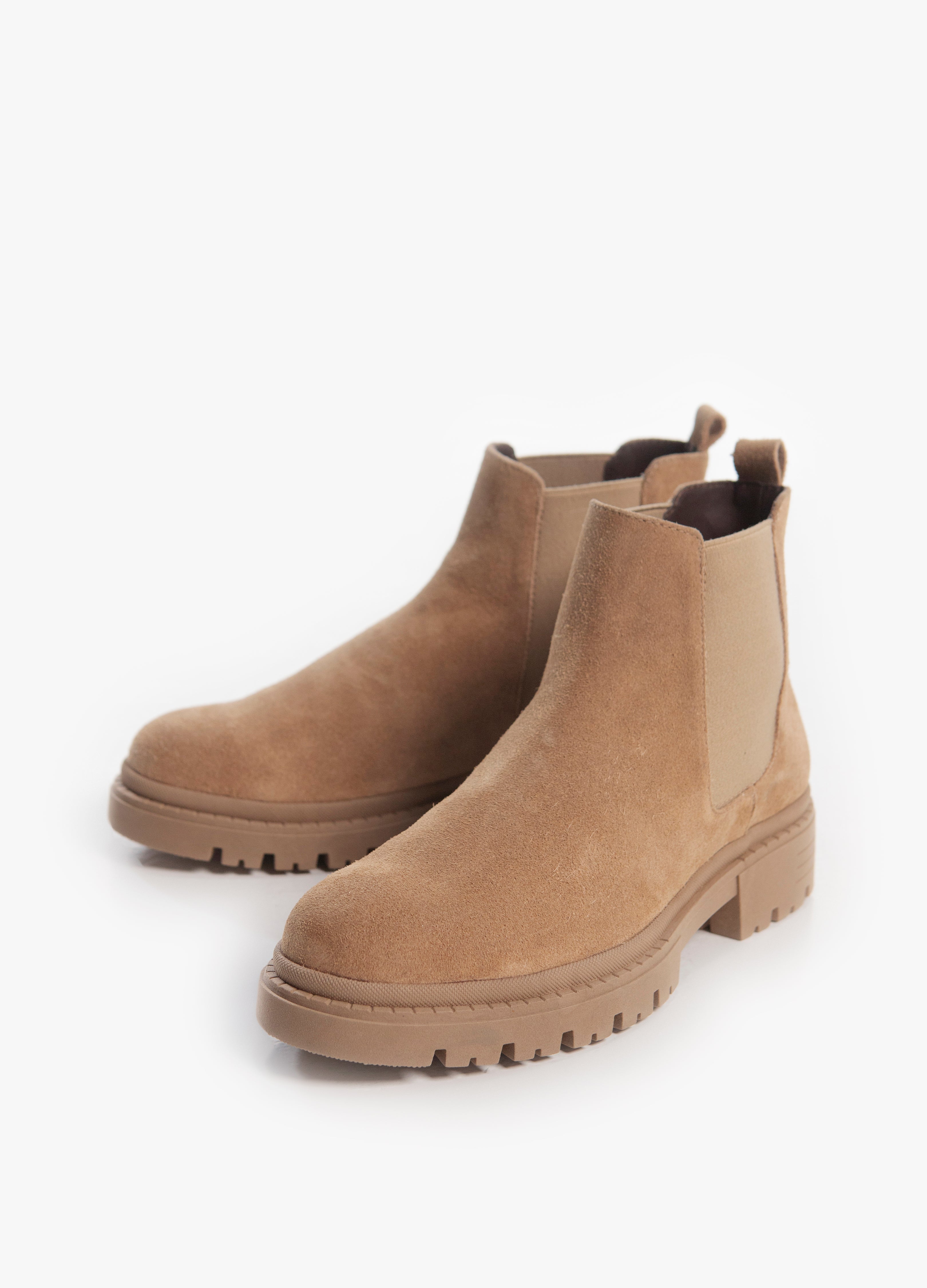 Botas (botines) Chelsea de piel gamuza color arena monocromática, como el desierto, con suela gruesa y elásticos laterales.