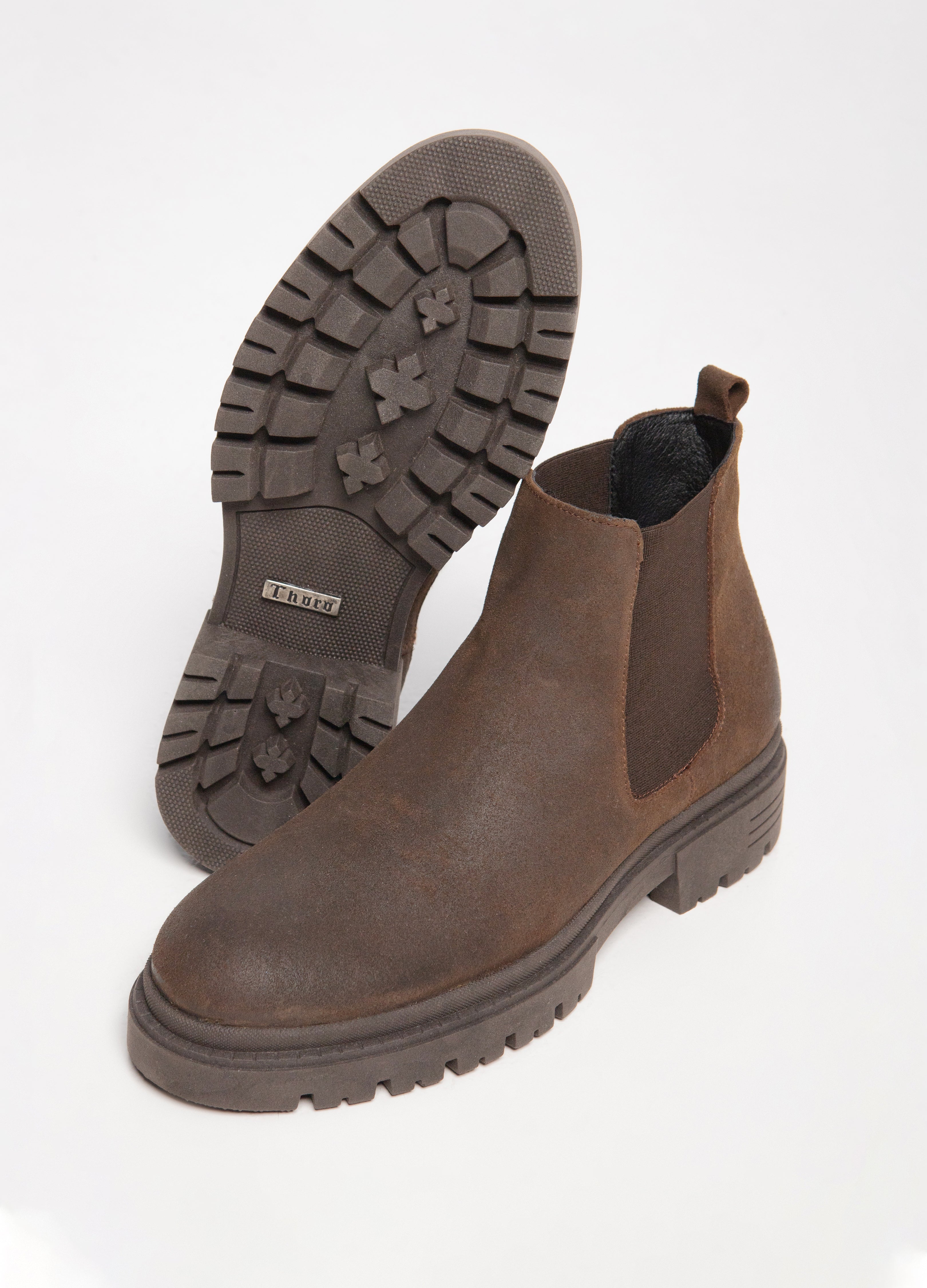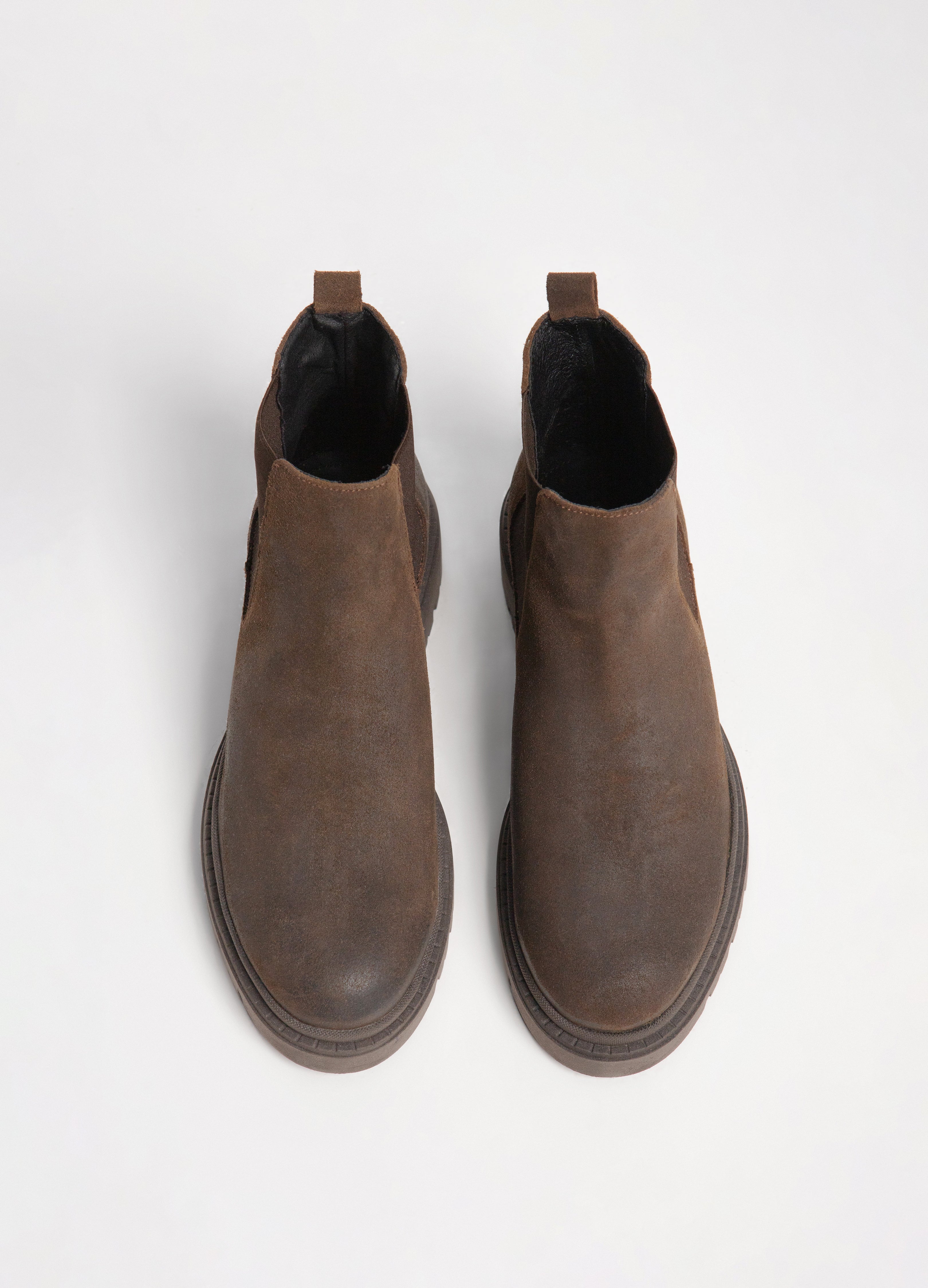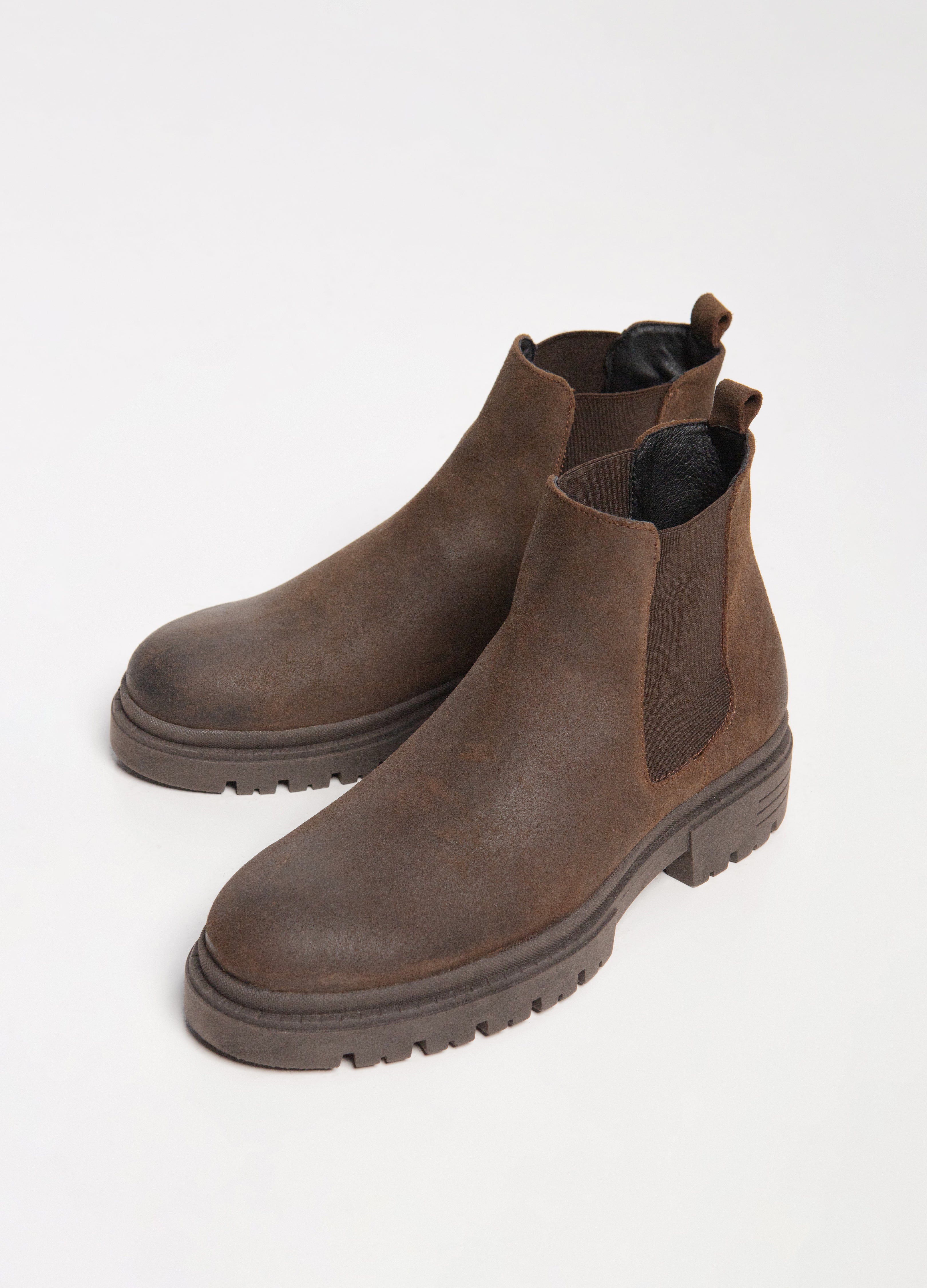 Chelsea boots made of mocha (brown) colored cowhide with a suede finish with a thick sole with elastic sides.