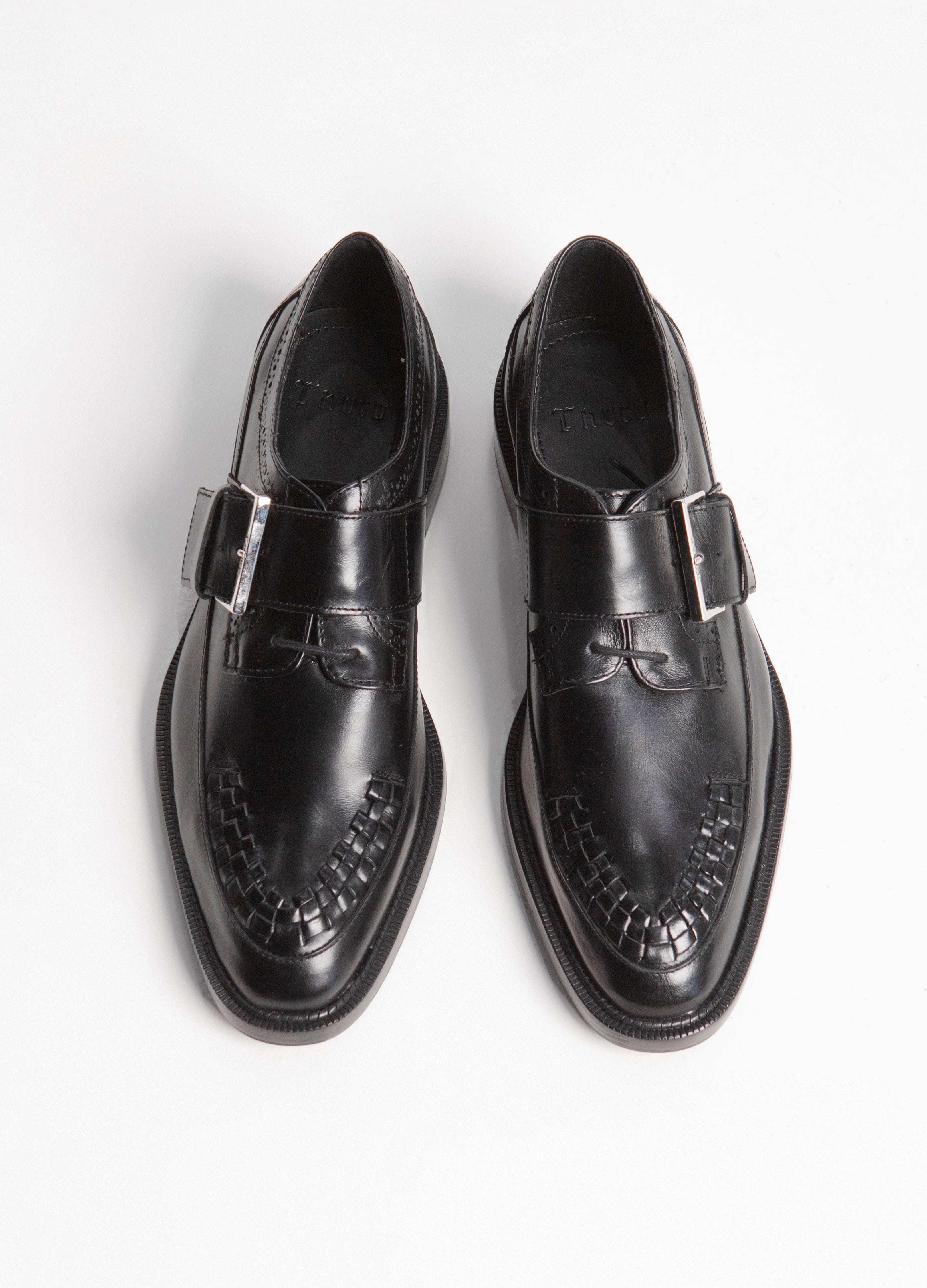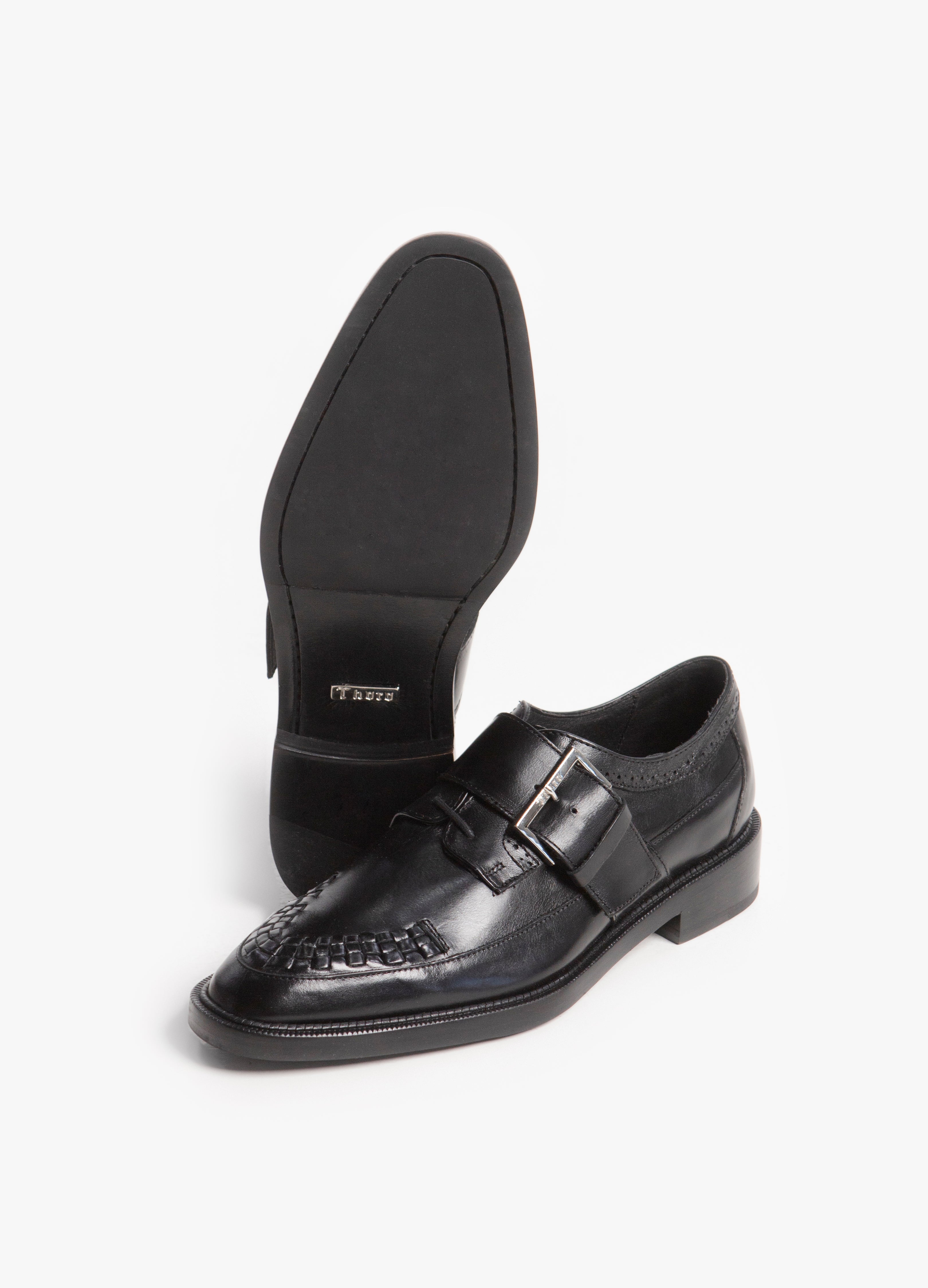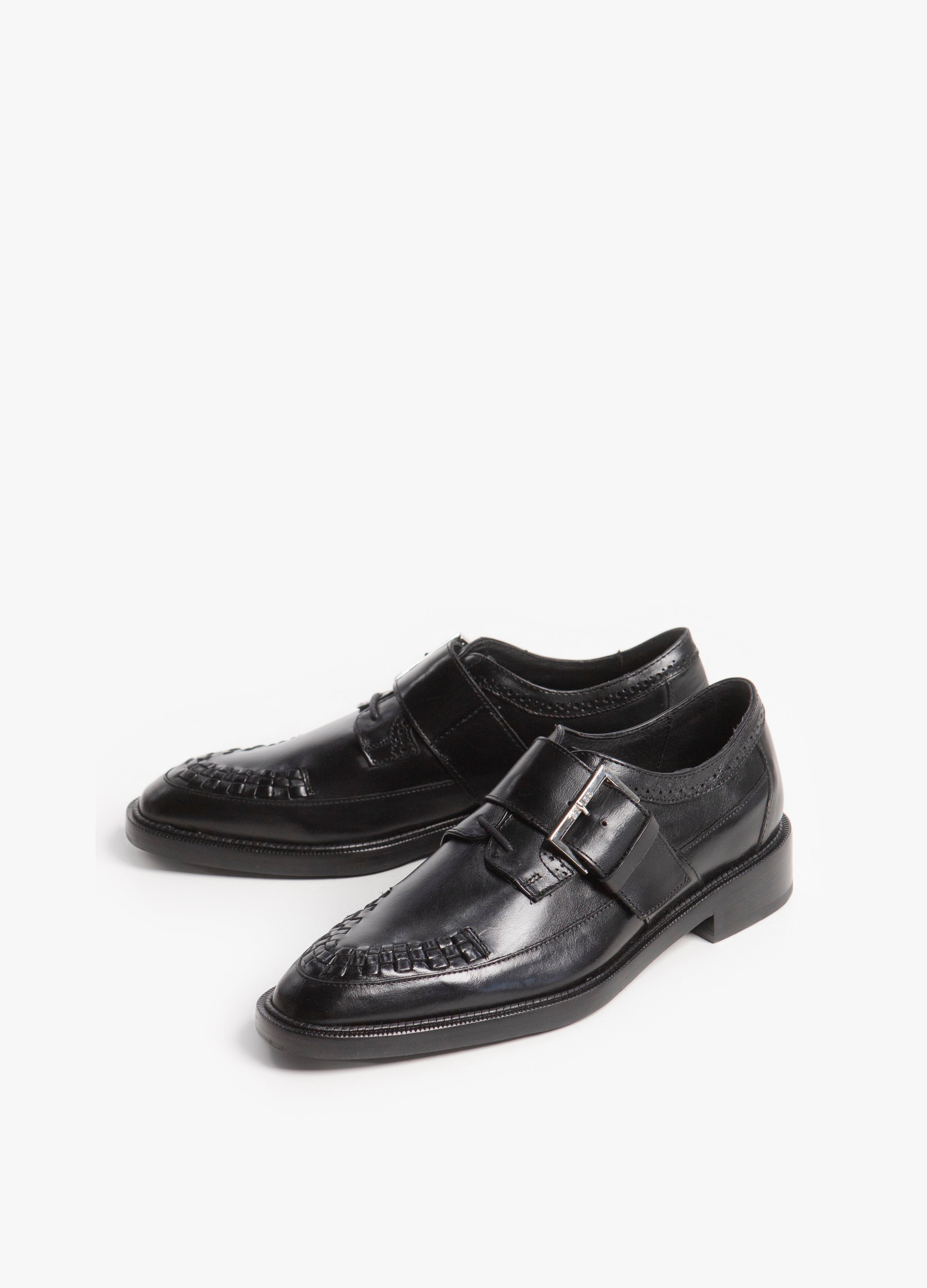 Monkstrap con tejido en el empeine fabricado en piel de res color negro.