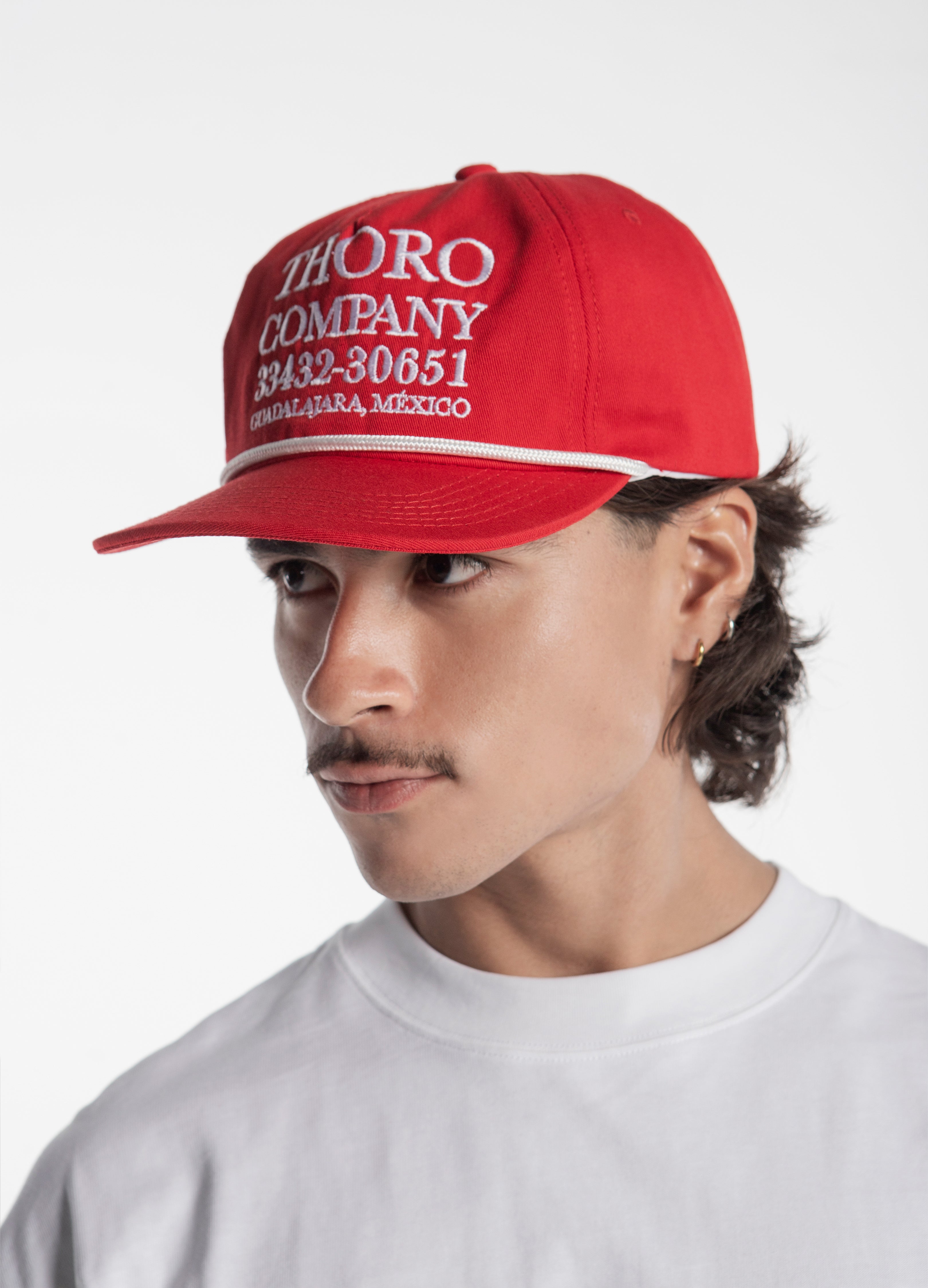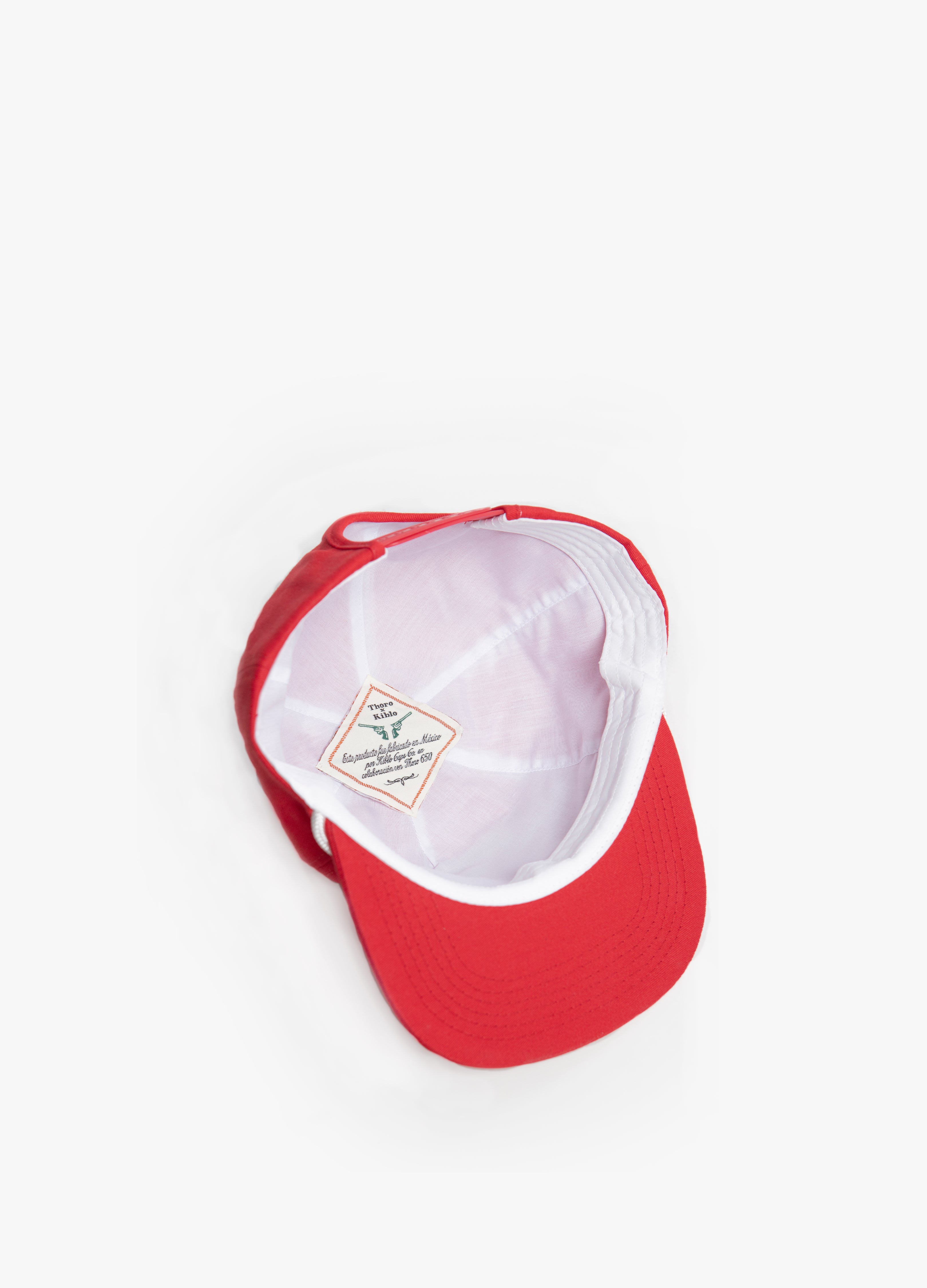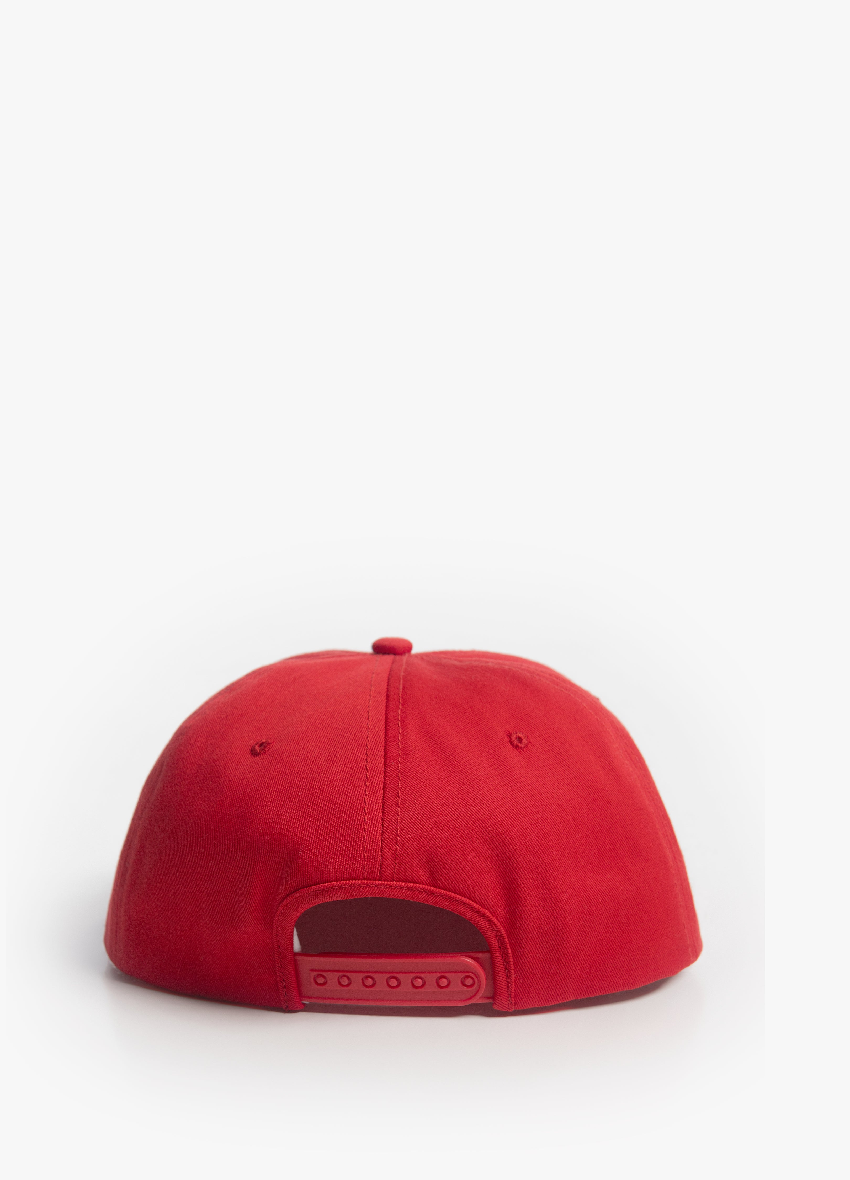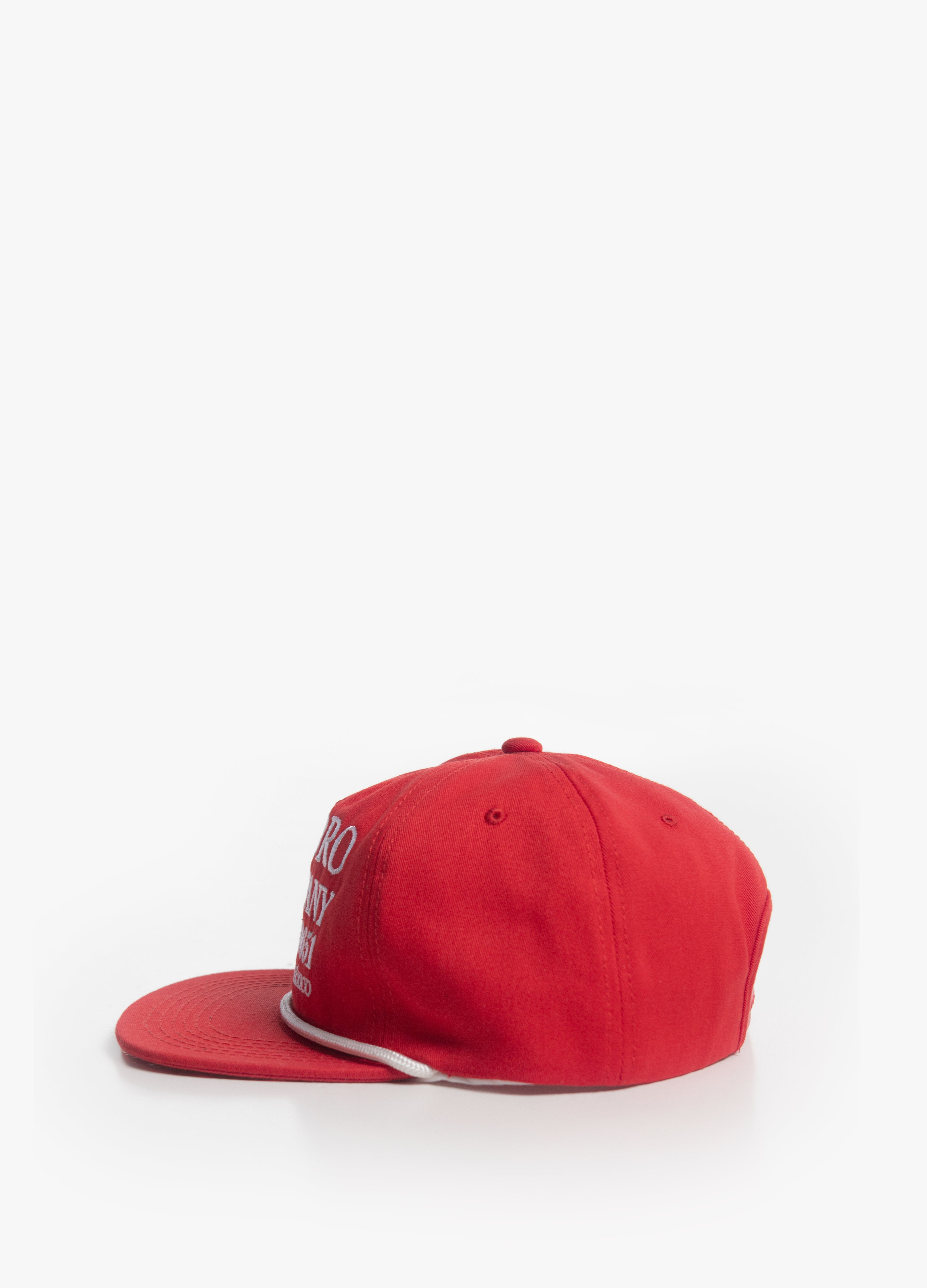 Cap without rigid structure with a flat red visor, decorative cord and white embroidered design.