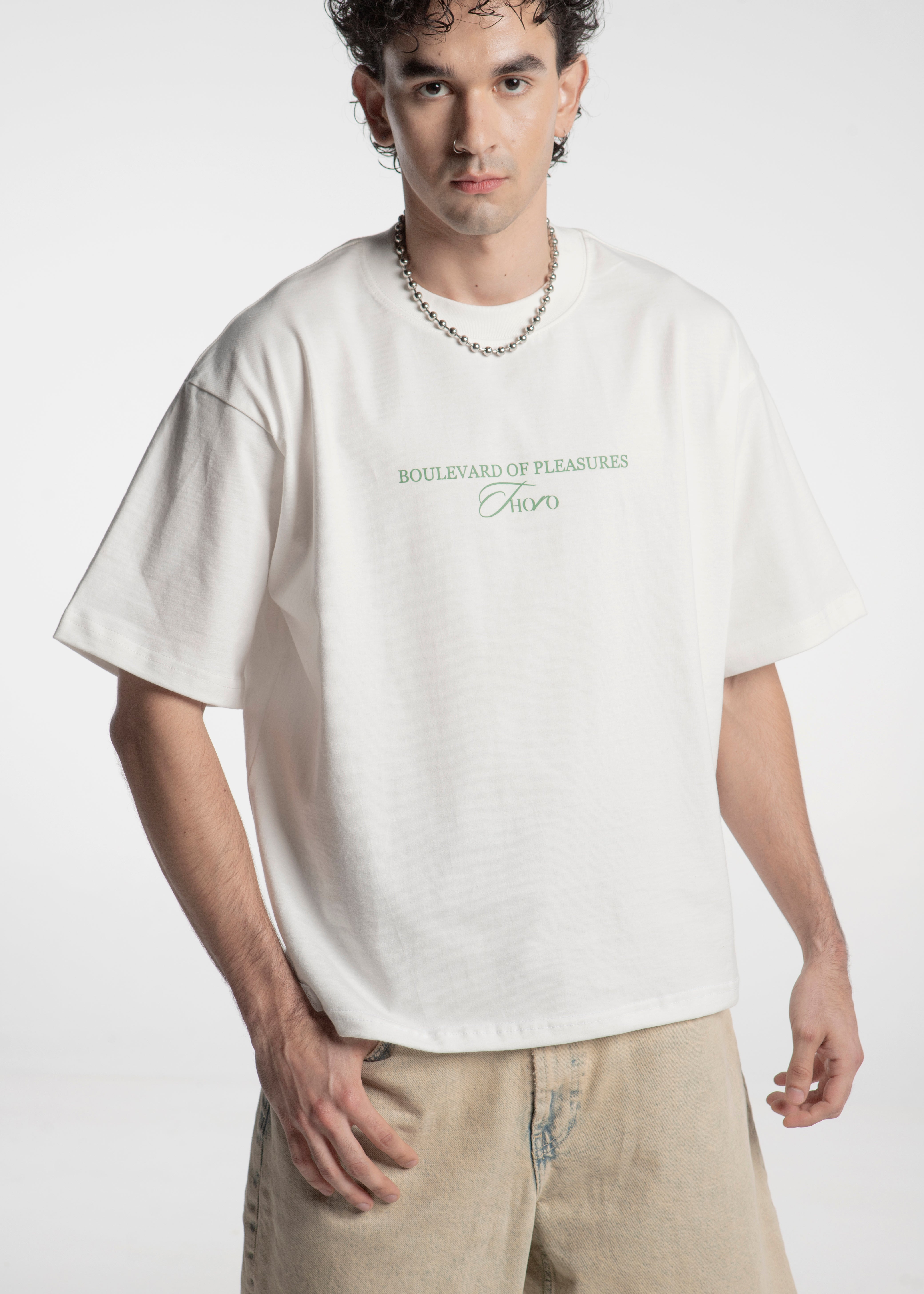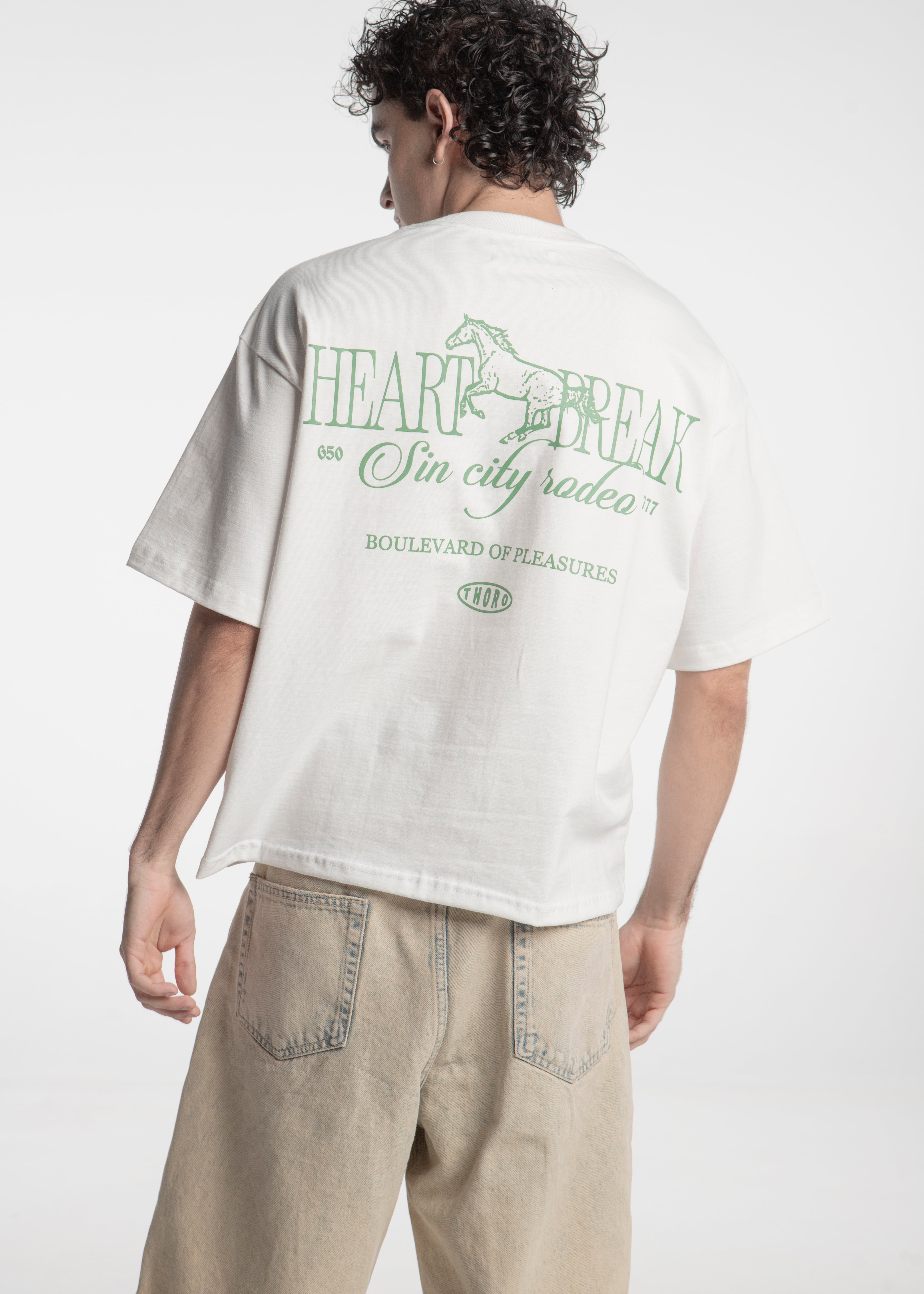 Playera blanca de corte boxy fabricada en 100% algodón con la leyenda "Boulevard of pleasures / Thoro " en el pecho  y en la espalda las frases "Heartbreak / SIN CITY Rodeo / Boulevard of pleasures" junto a la imagen de un caballo en serigrafía color verde.