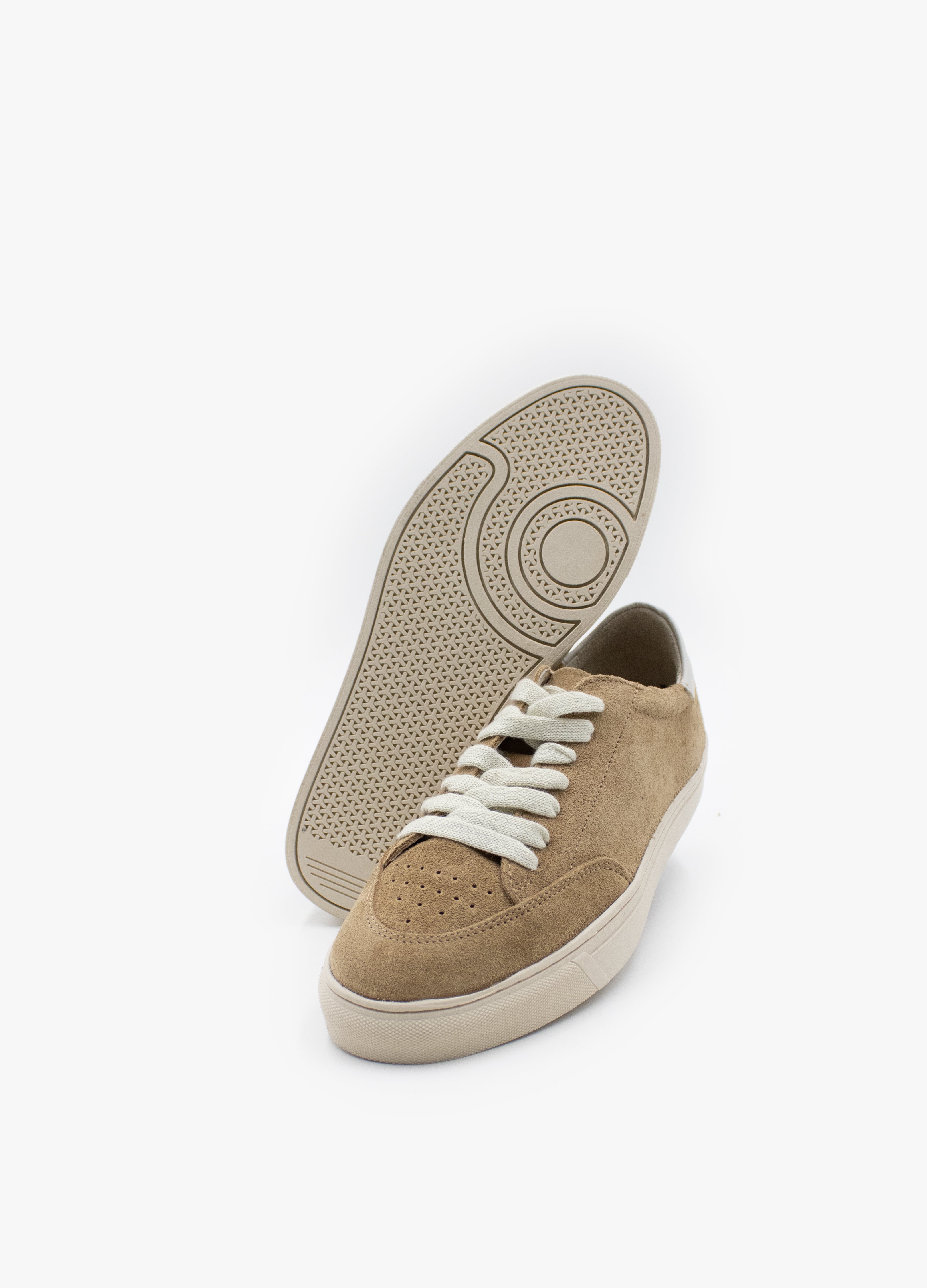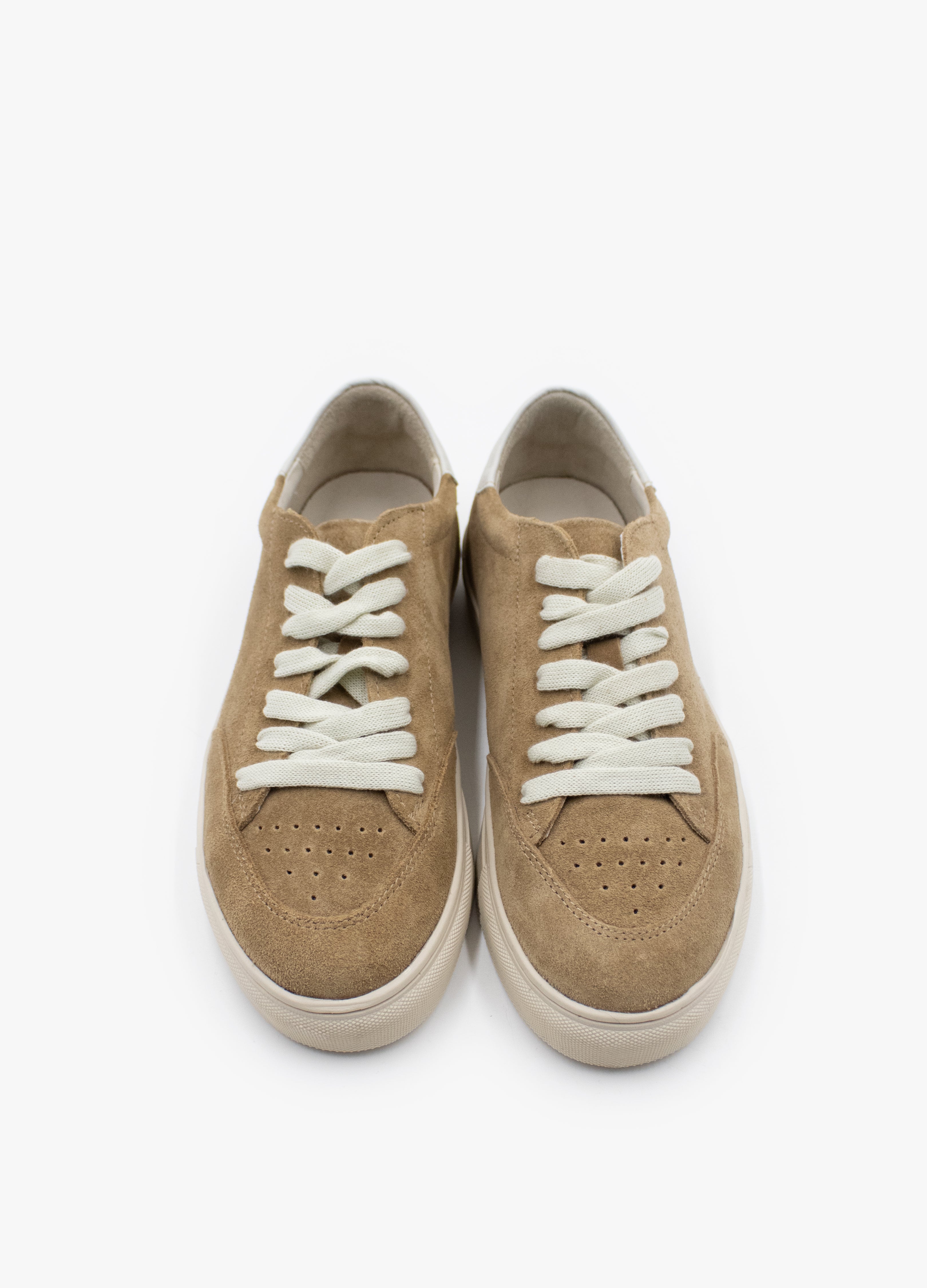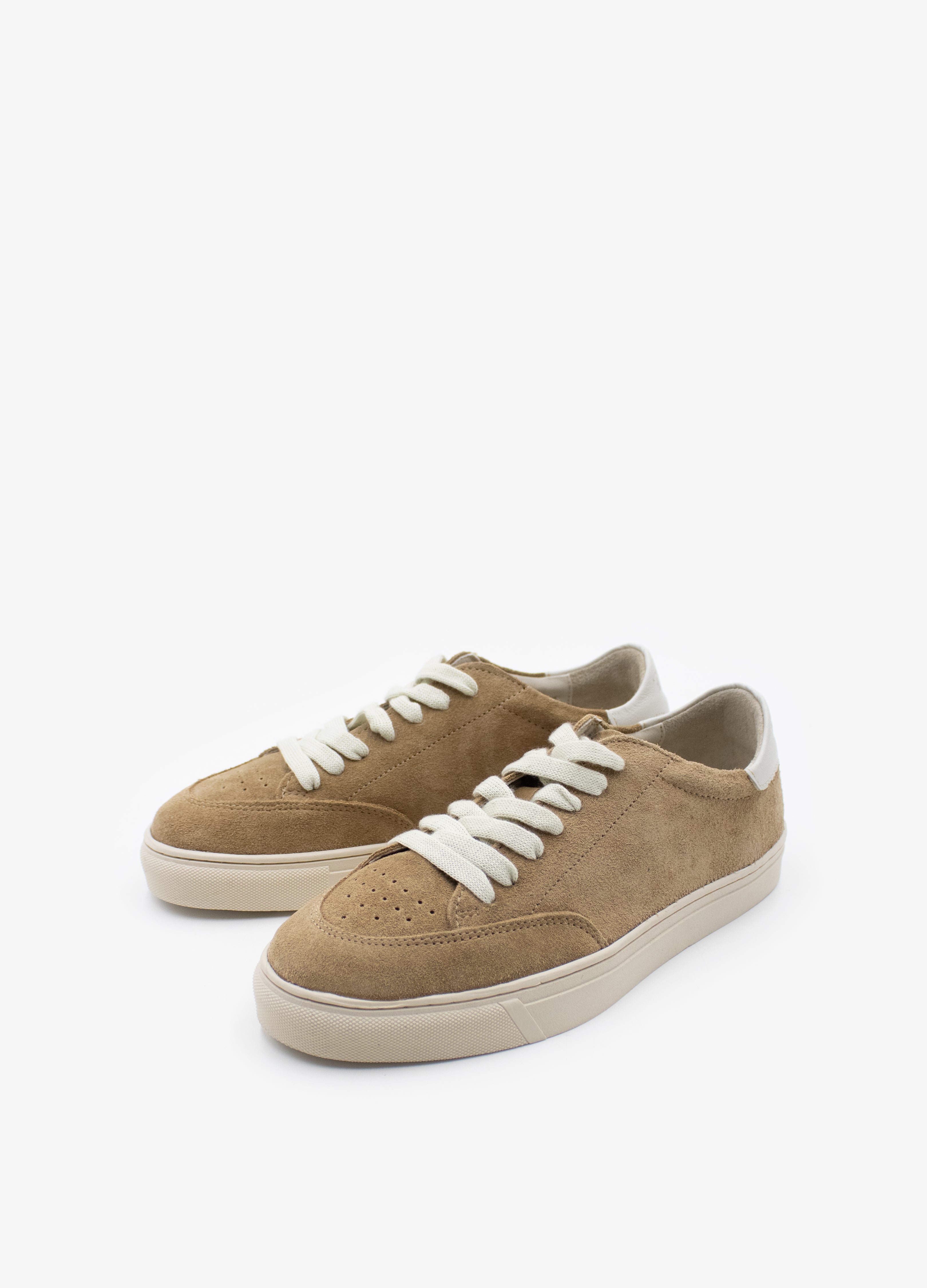 Sneakers made of camel-colored cowhide with a suede finish, bone-colored sole and off-white leather details.