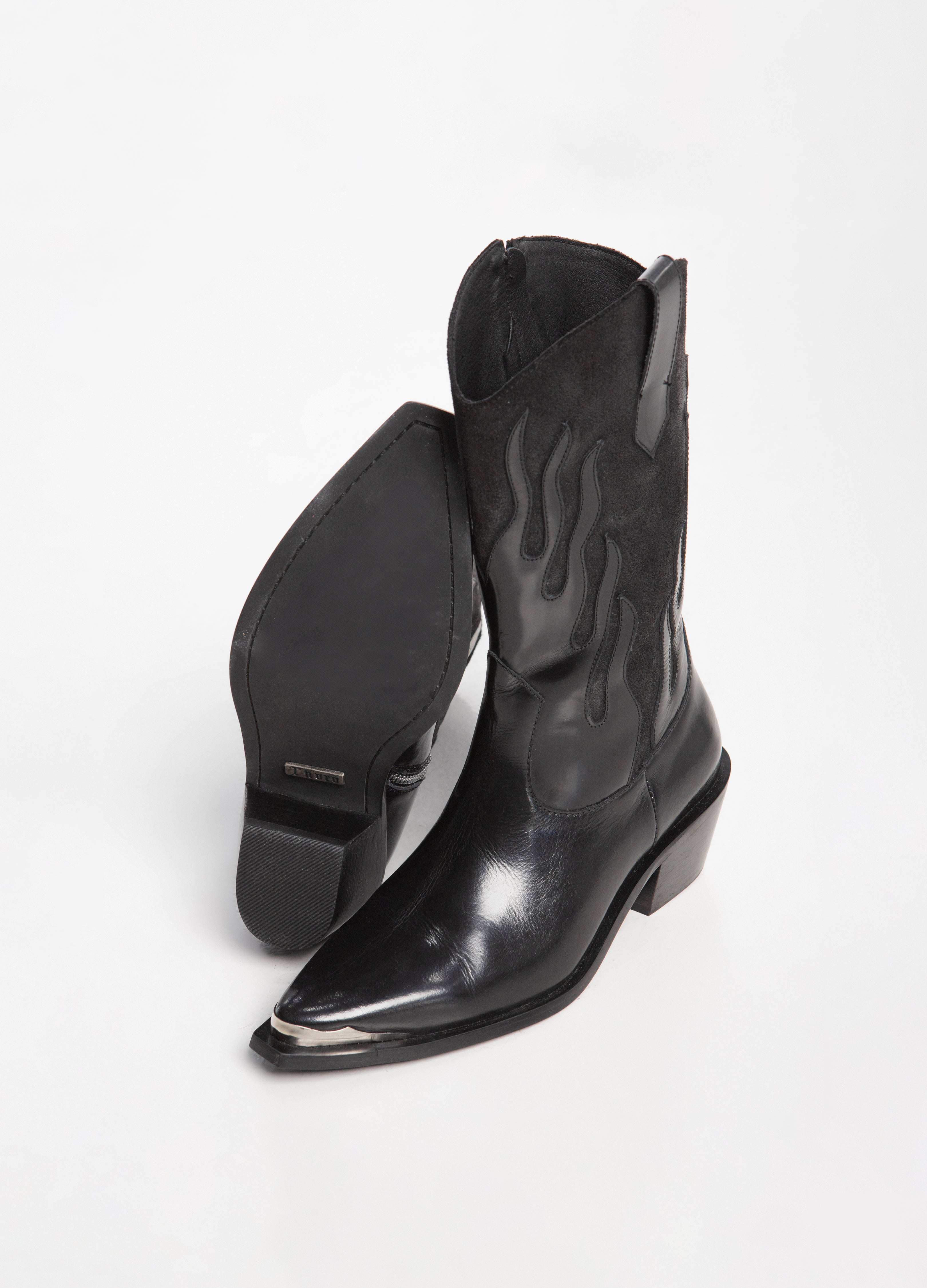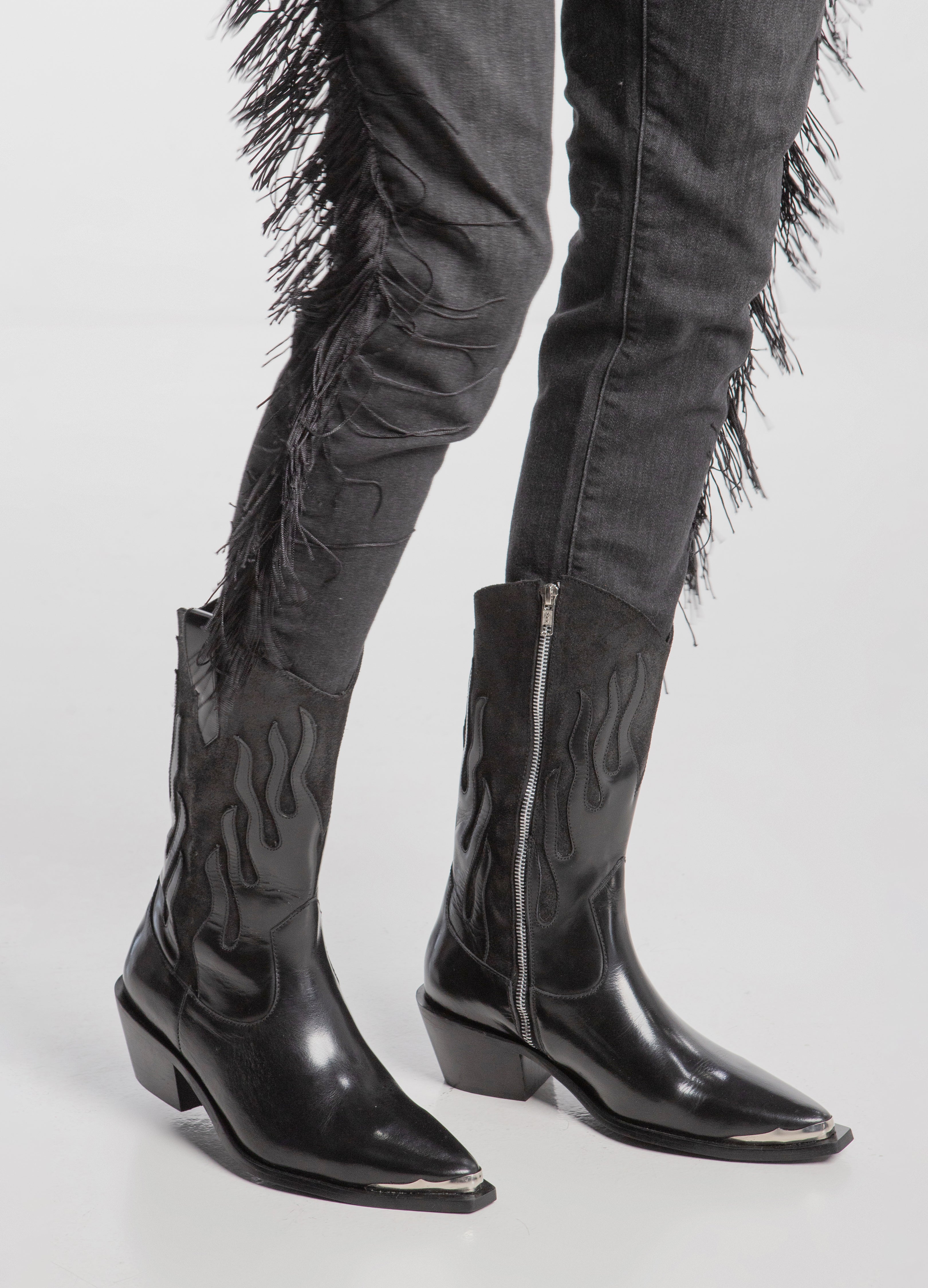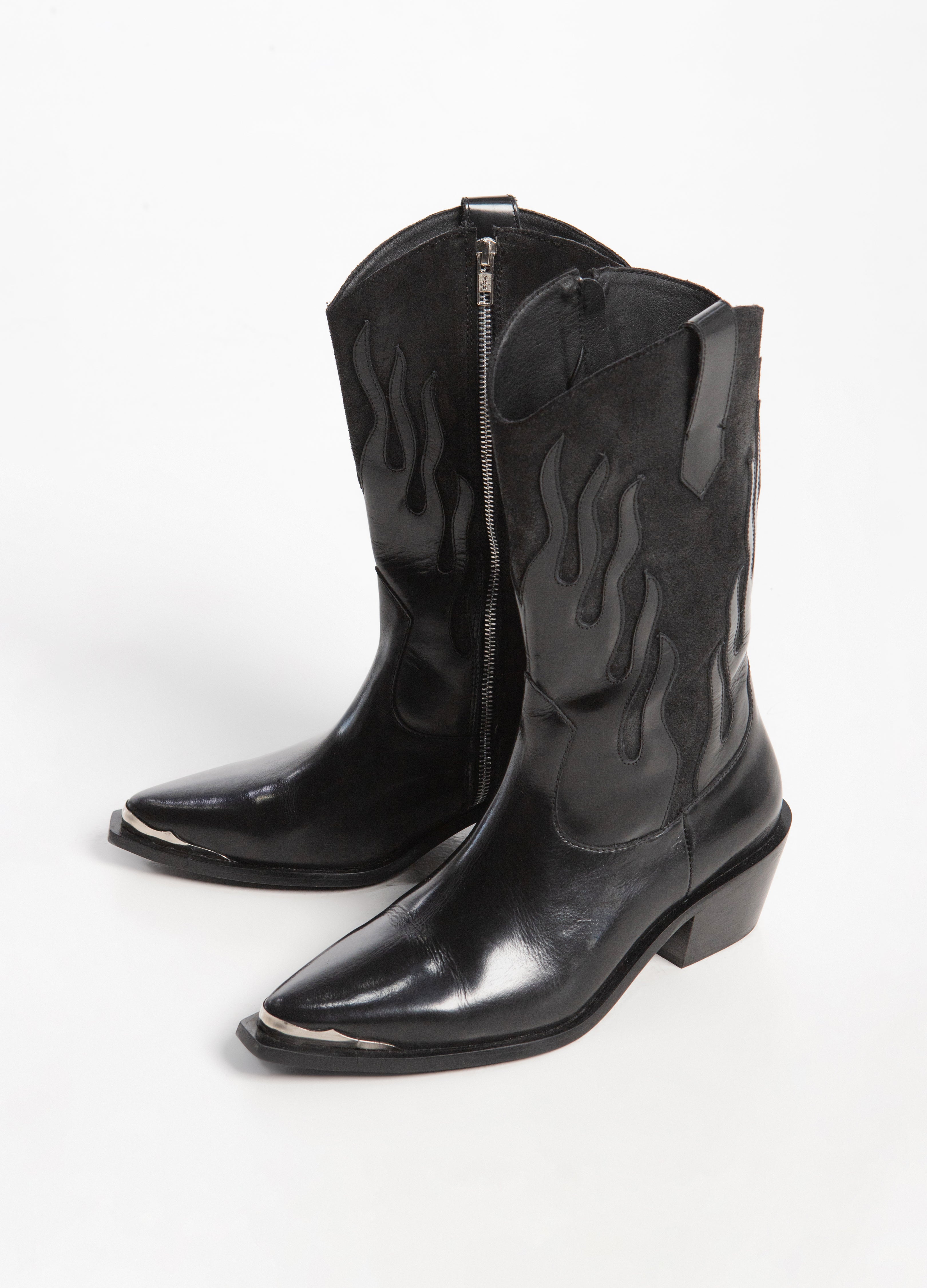Bota vaquera (de tubo alto) fabricada en piel de res color negro con diseño de llamas en acabado brillante y tubo de acabado gamuza con cierre lateral plateado, tacón cubano y punta metálica.