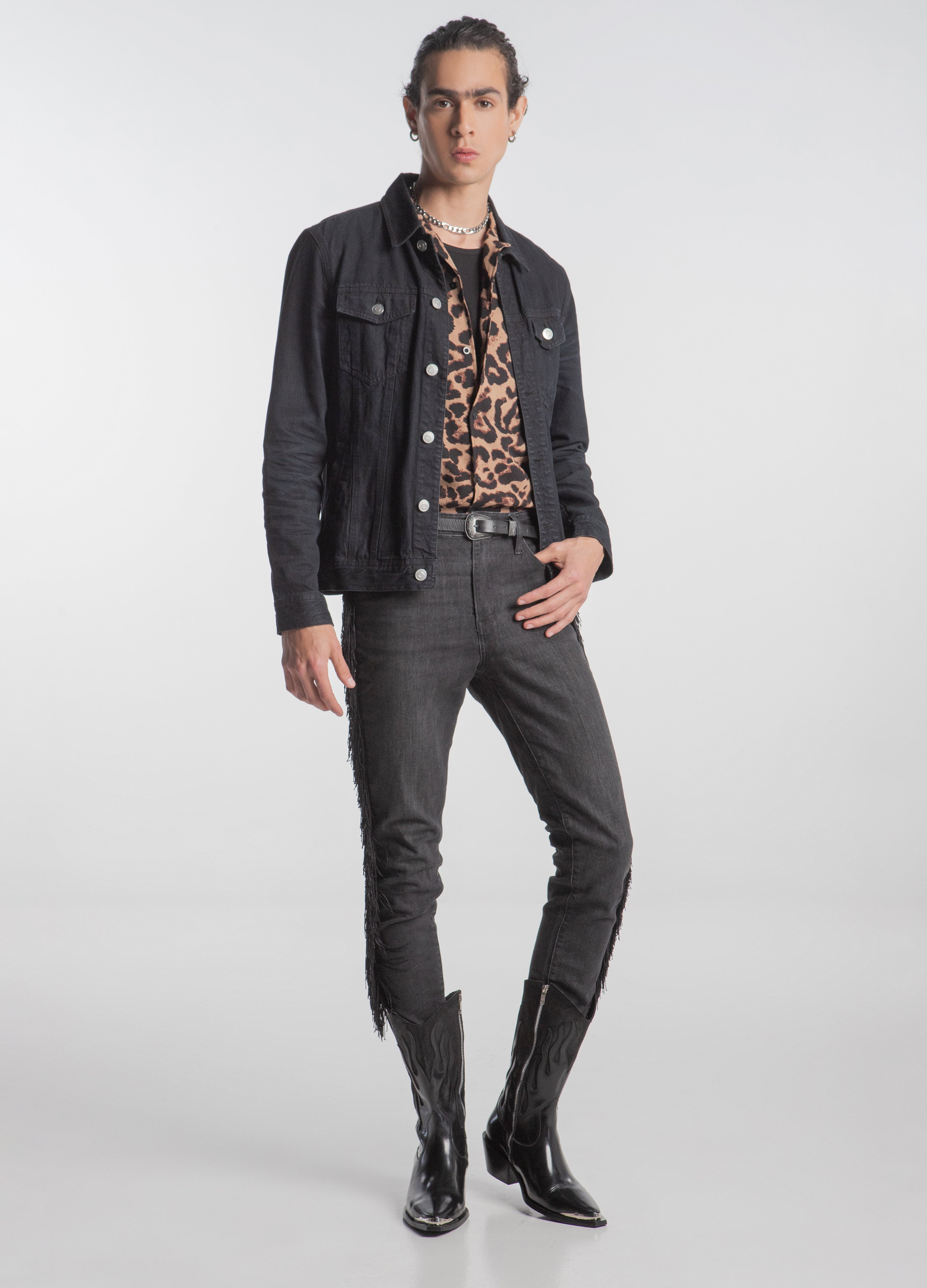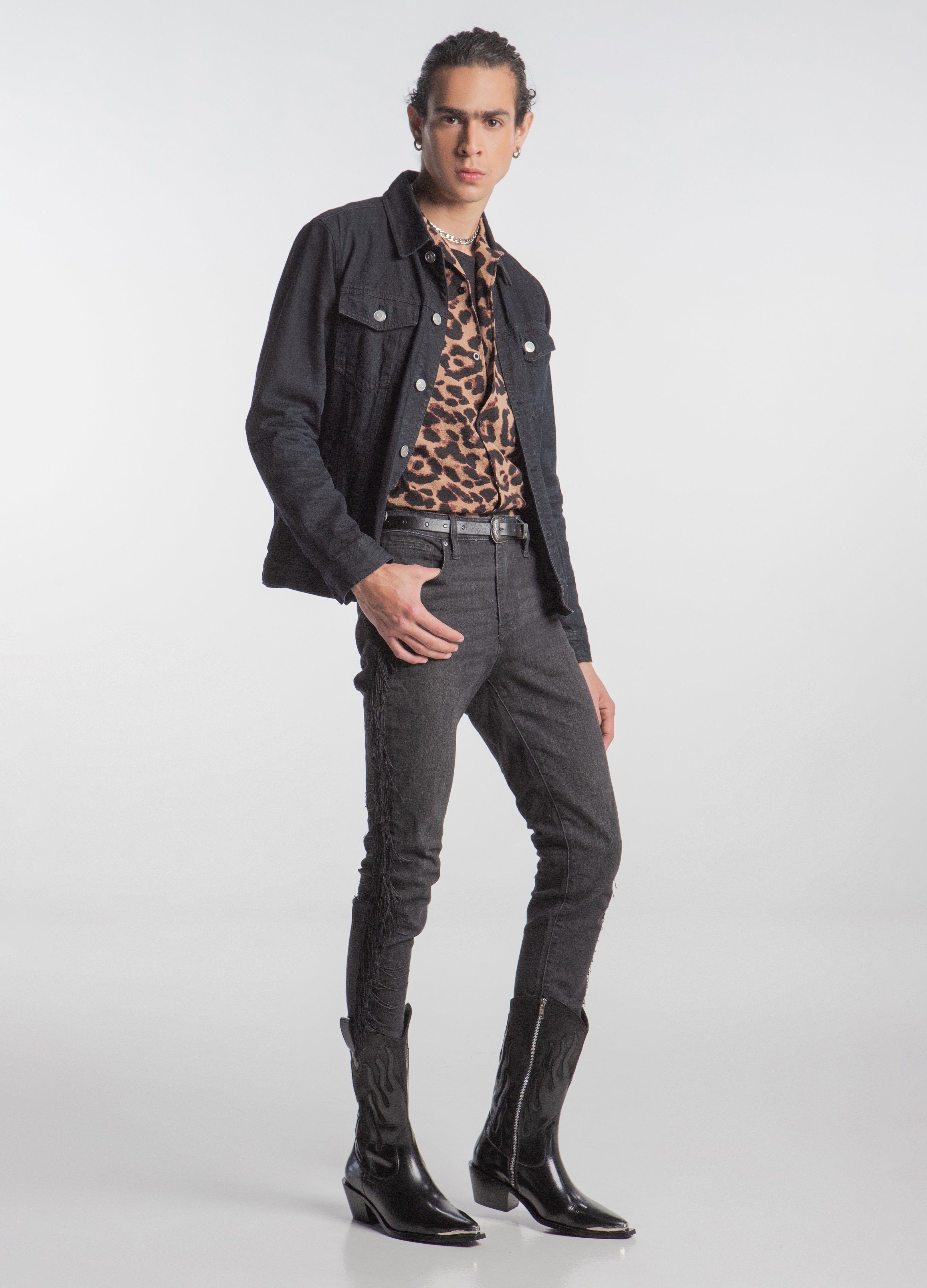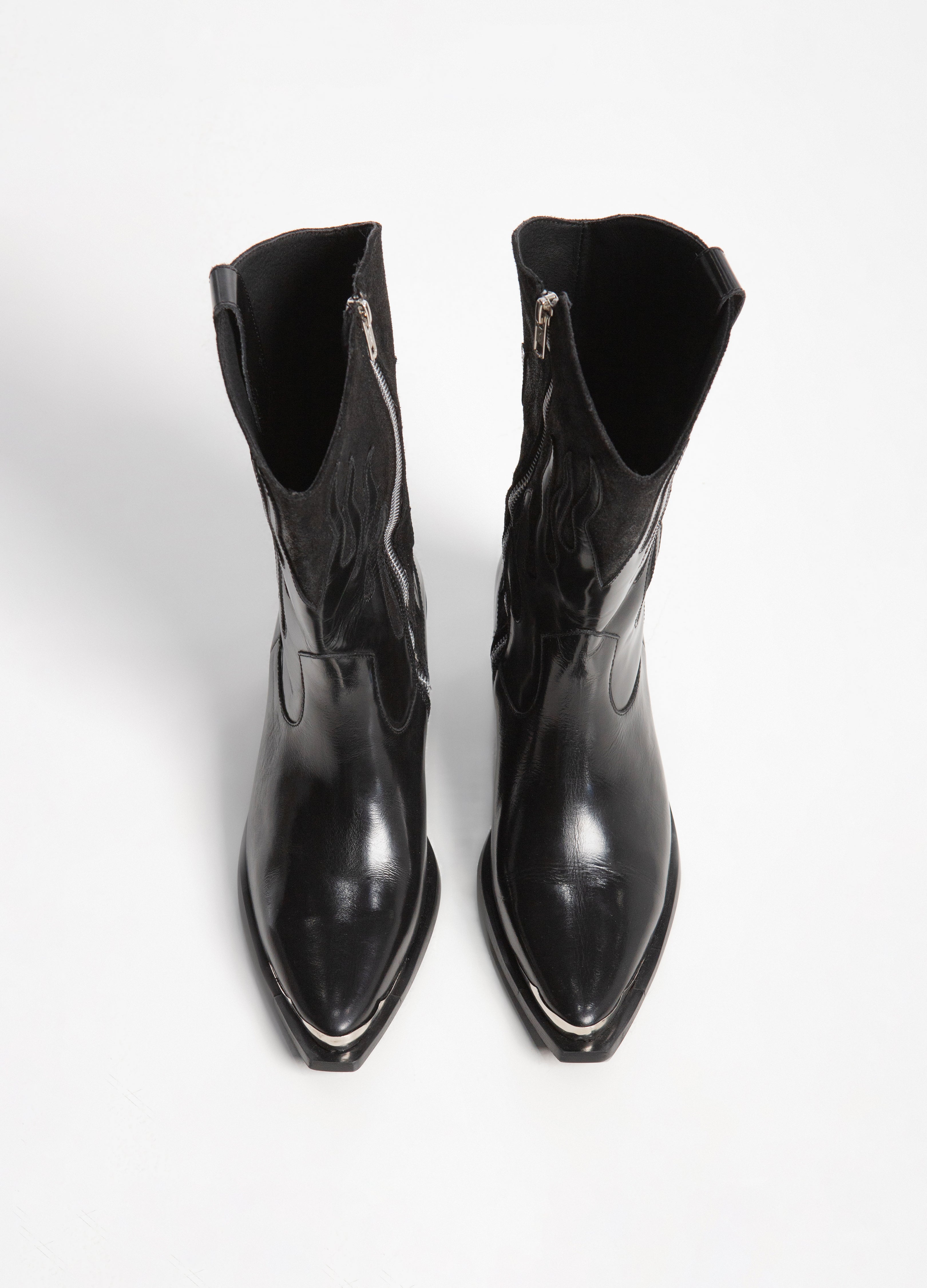 Bota vaquera (de tubo alto) fabricada en piel de res color negro con diseño de llamas en acabado brillante y tubo de acabado gamuza con cierre lateral plateado, tacón cubano y punta metálica.