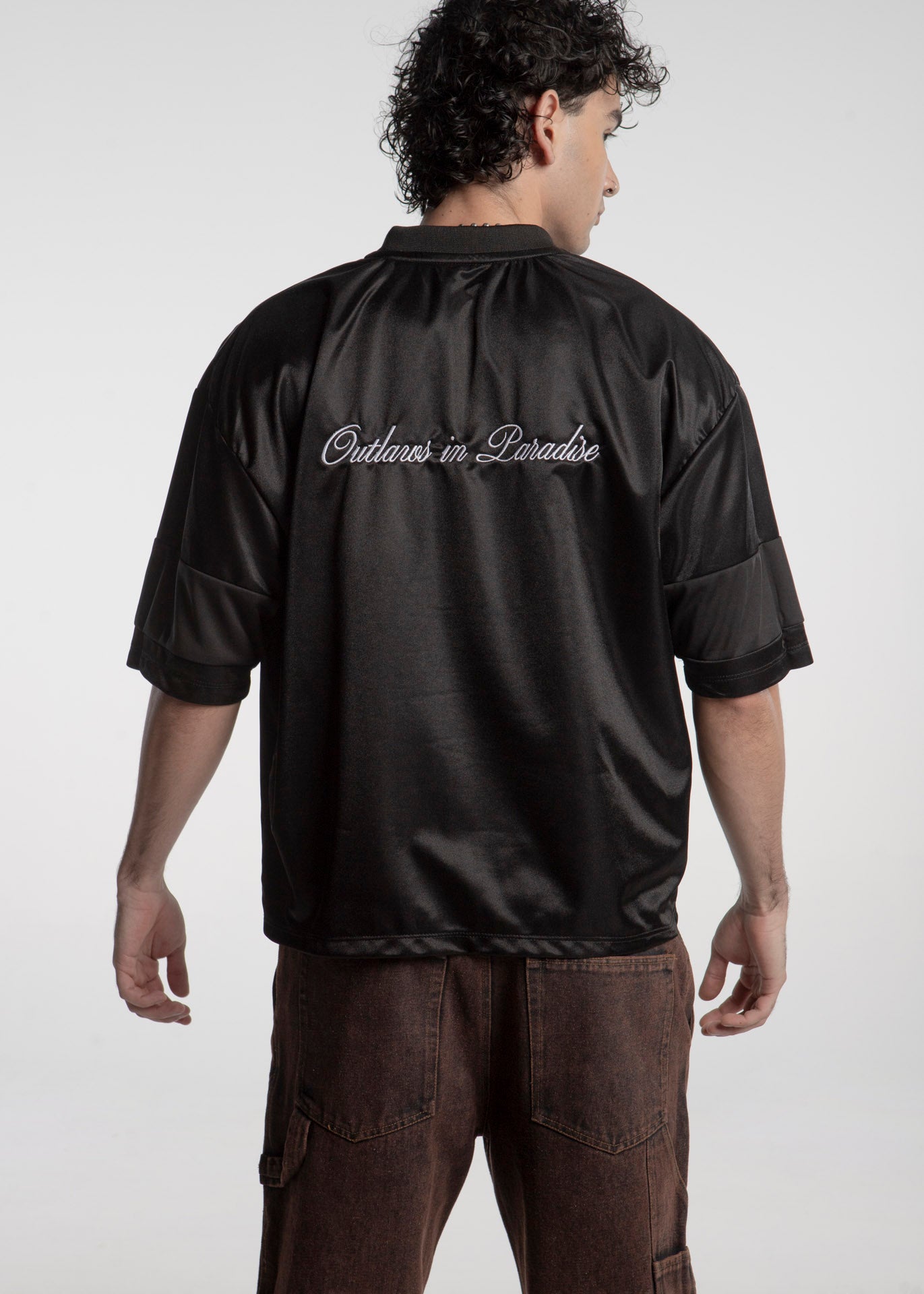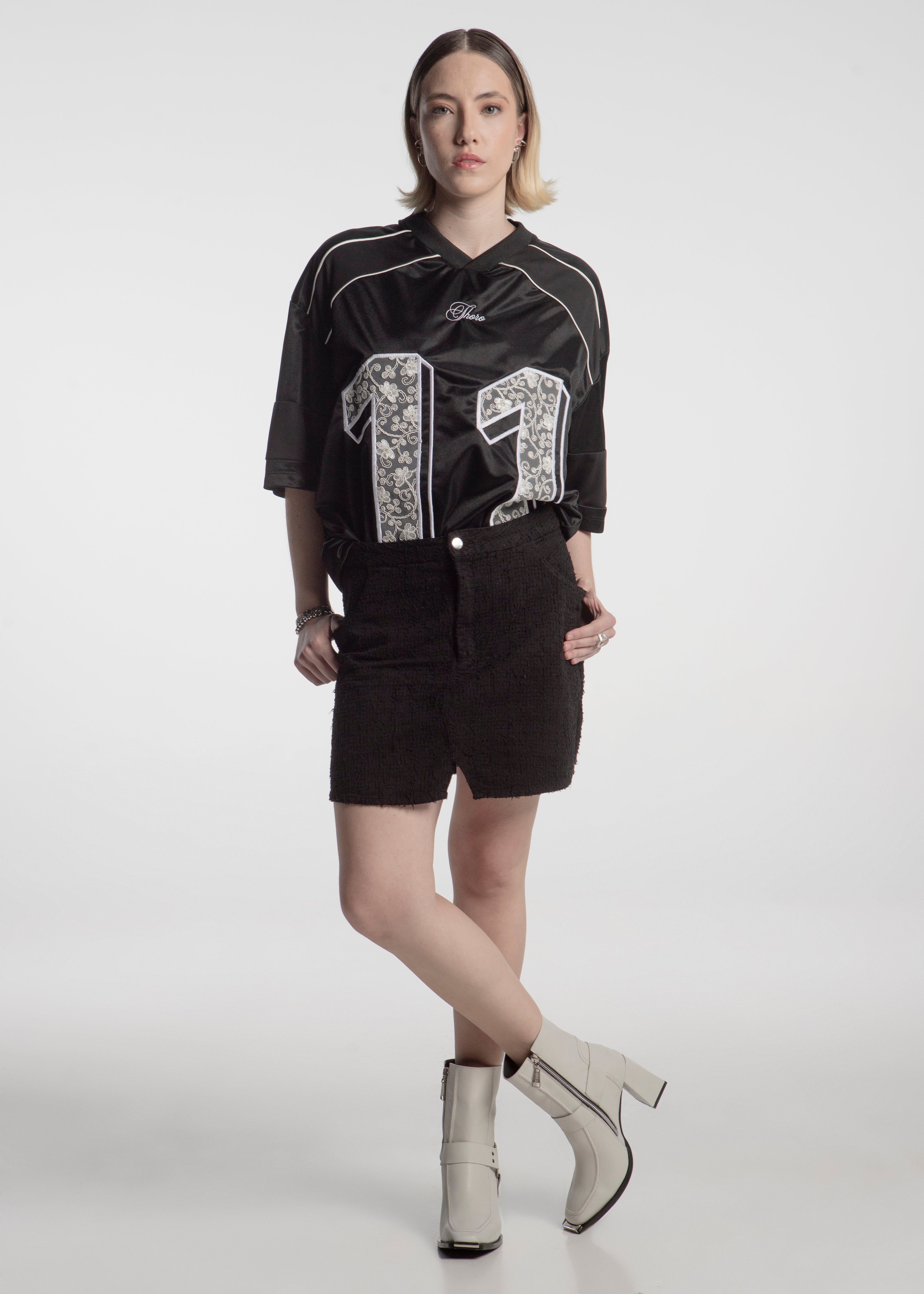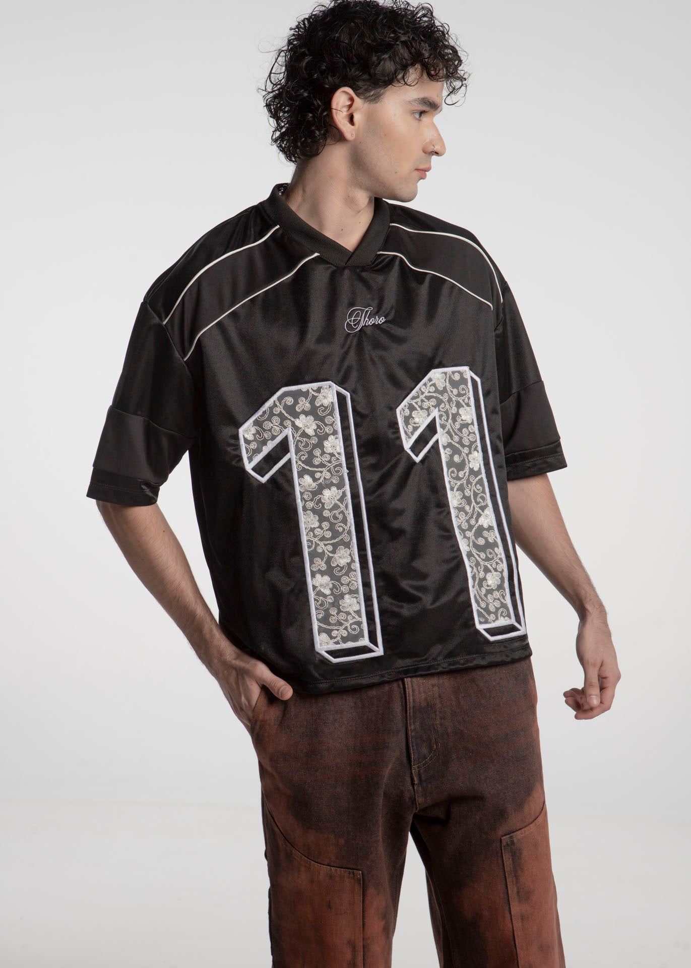Jersey negro deportivo con diseño de un 11 con encaje blanco y bordado en espalda en color blanco.