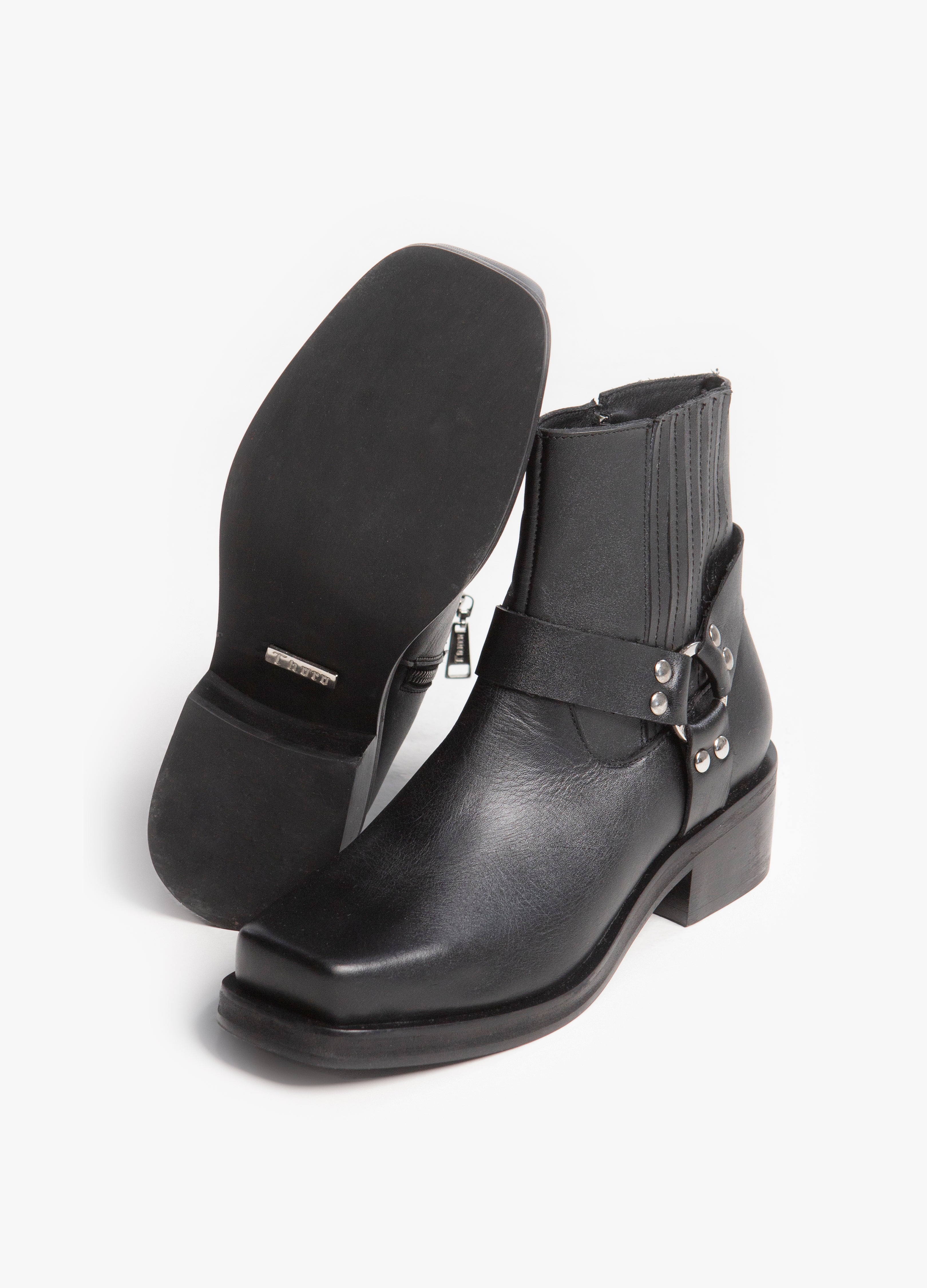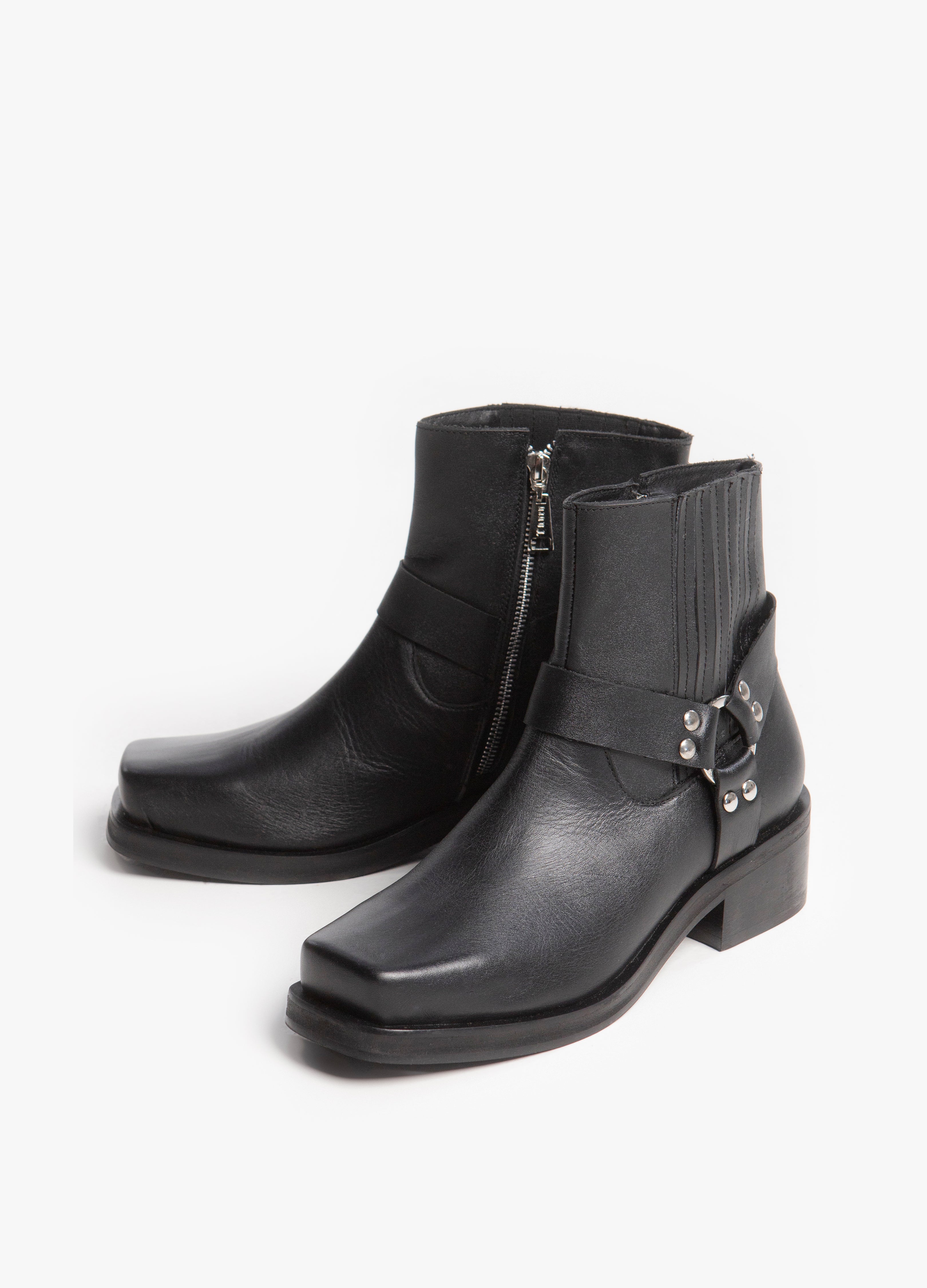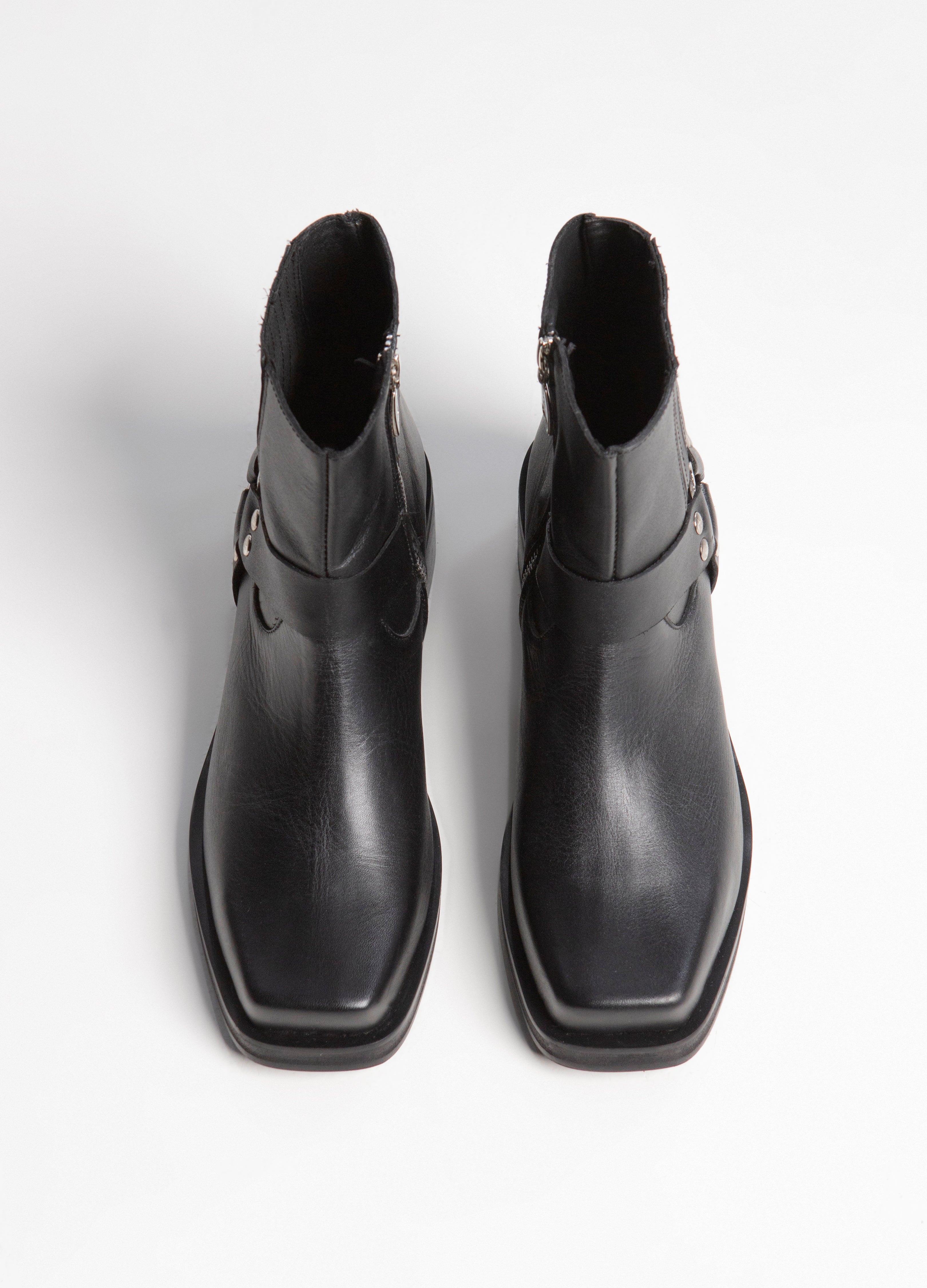 Botín de trompa de puerco fabricado en piel color negro con arnes y elástico tablilado