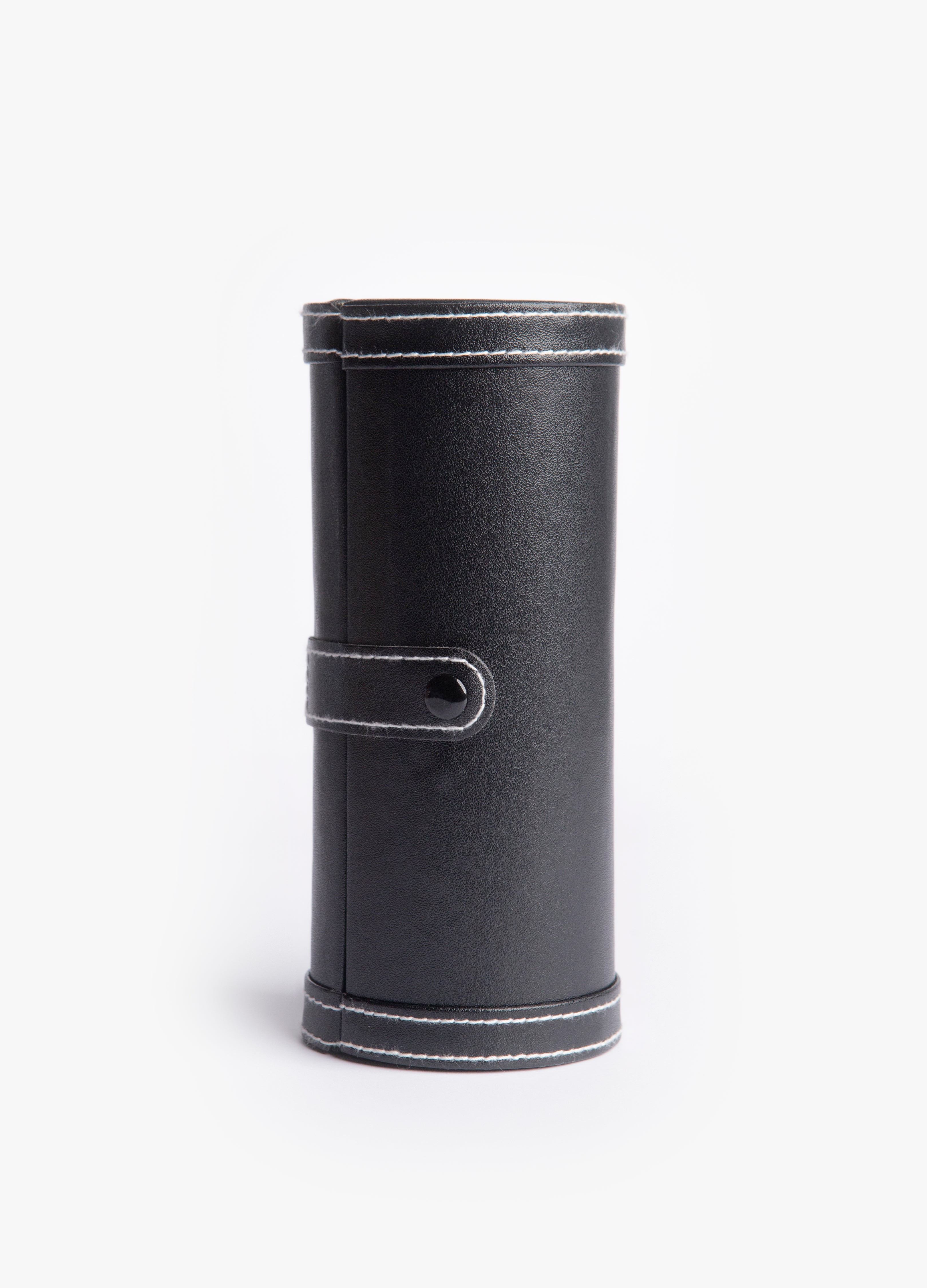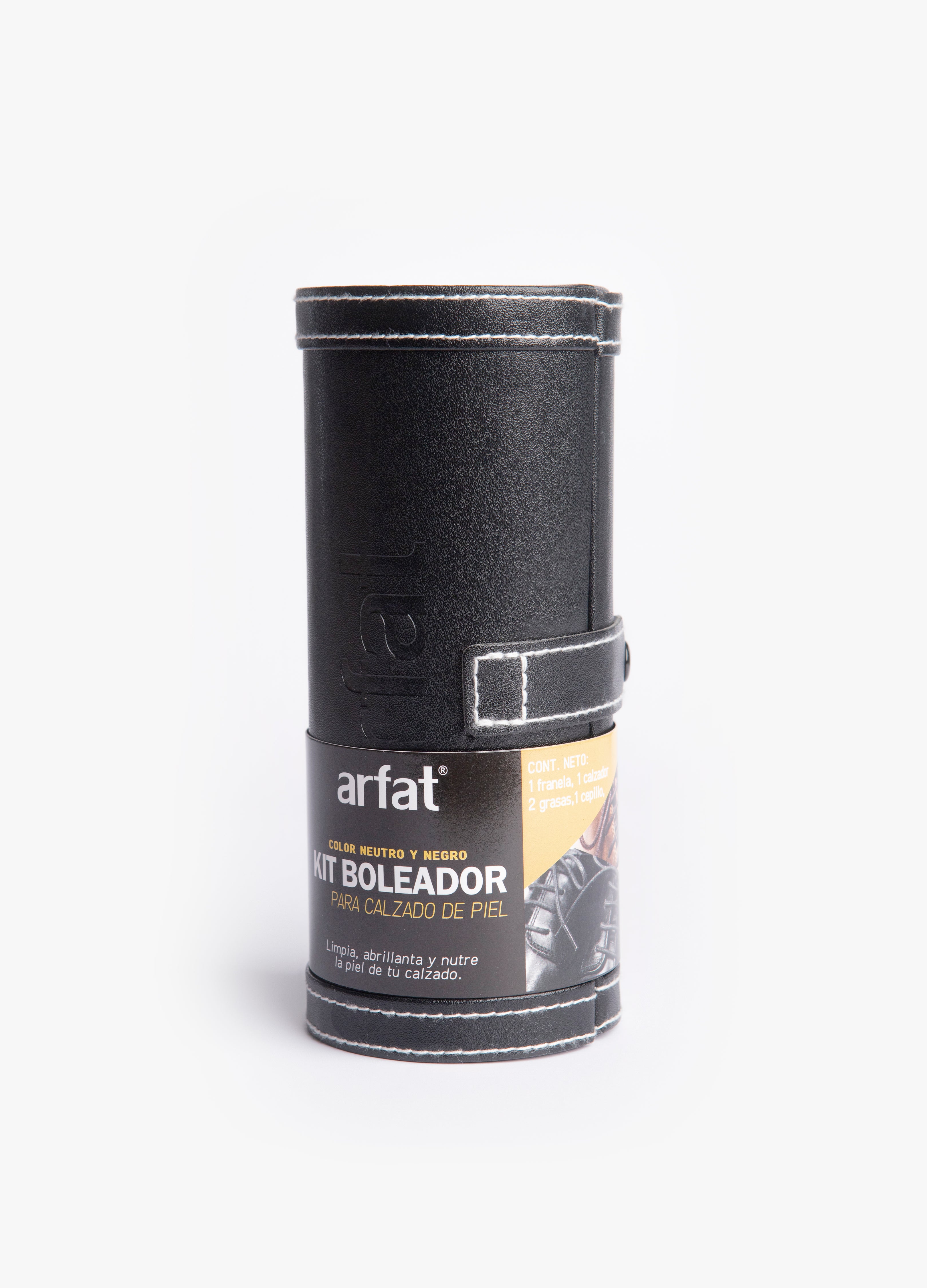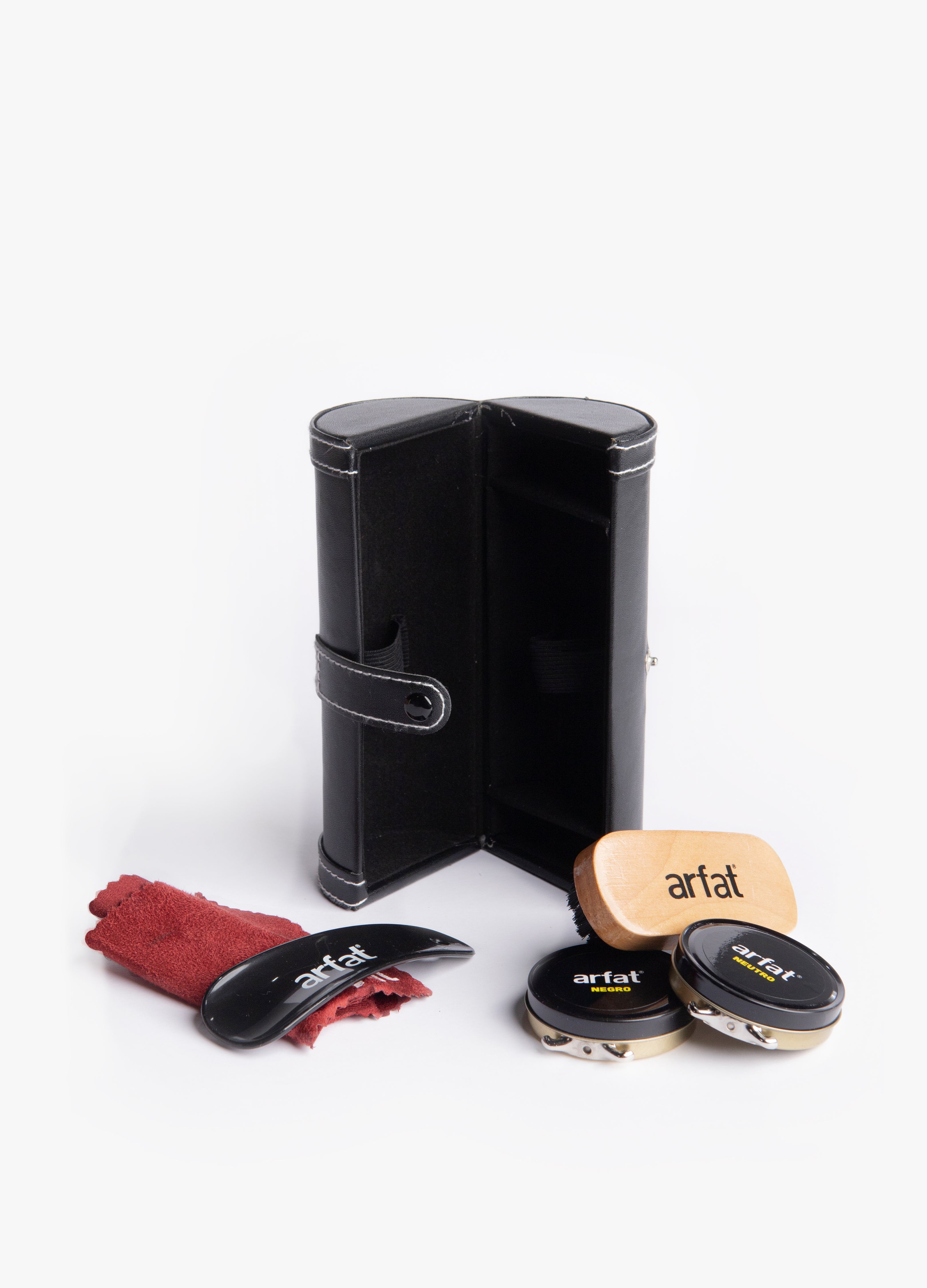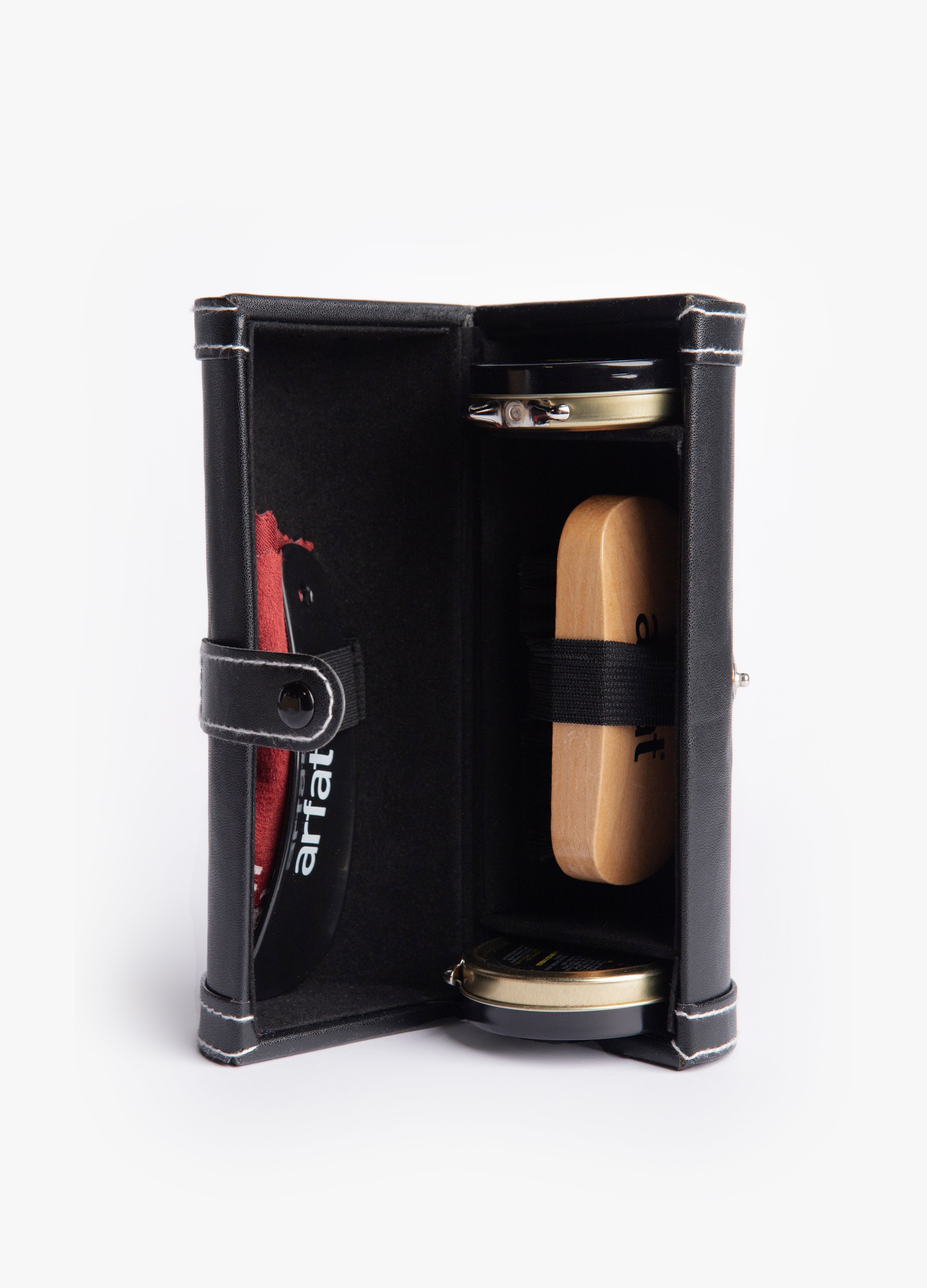 Pack made of black leather. Includes neutral color grease, black color grease, wooden applicator brush, polishing cloth and a shoehorn.