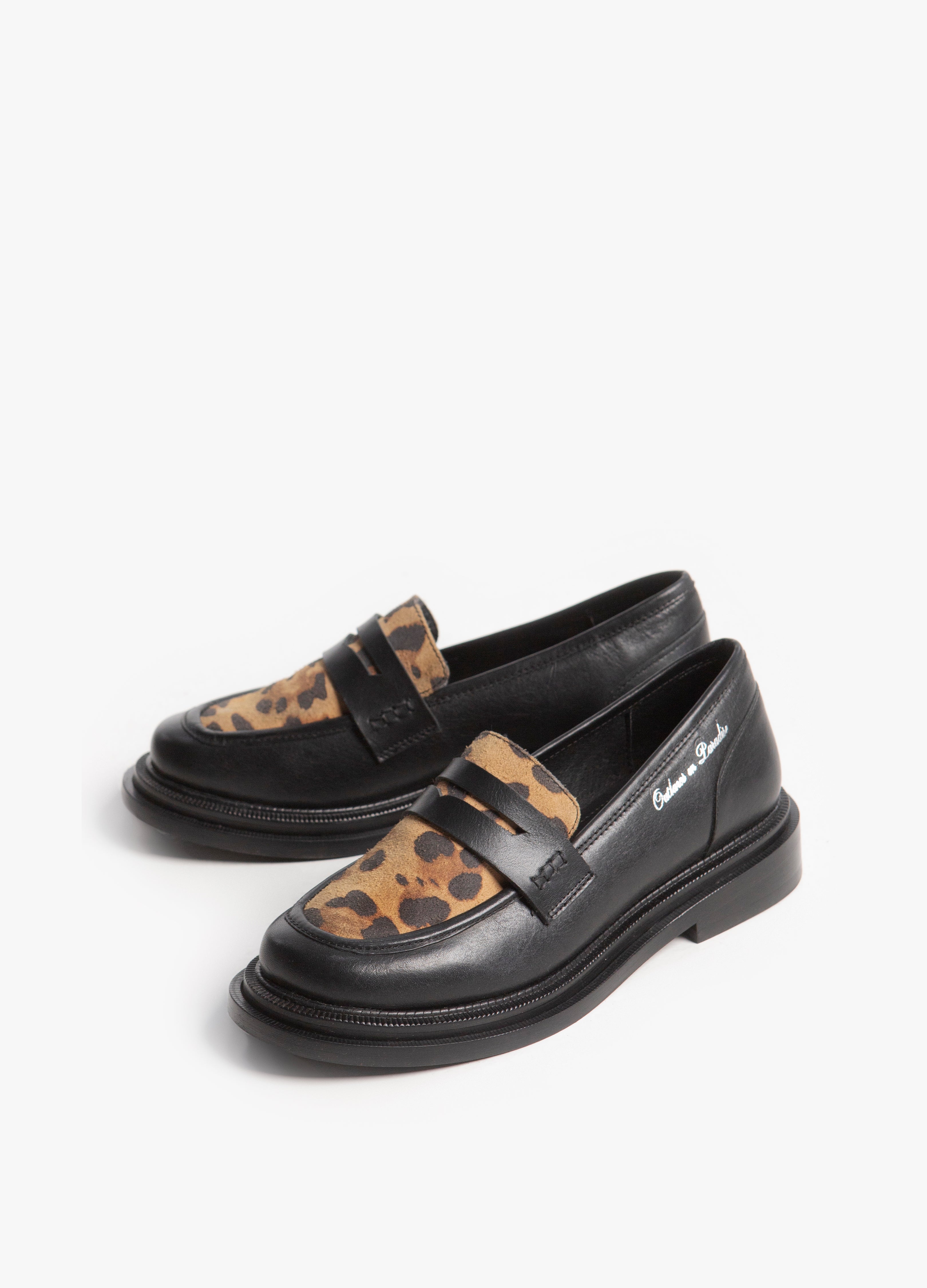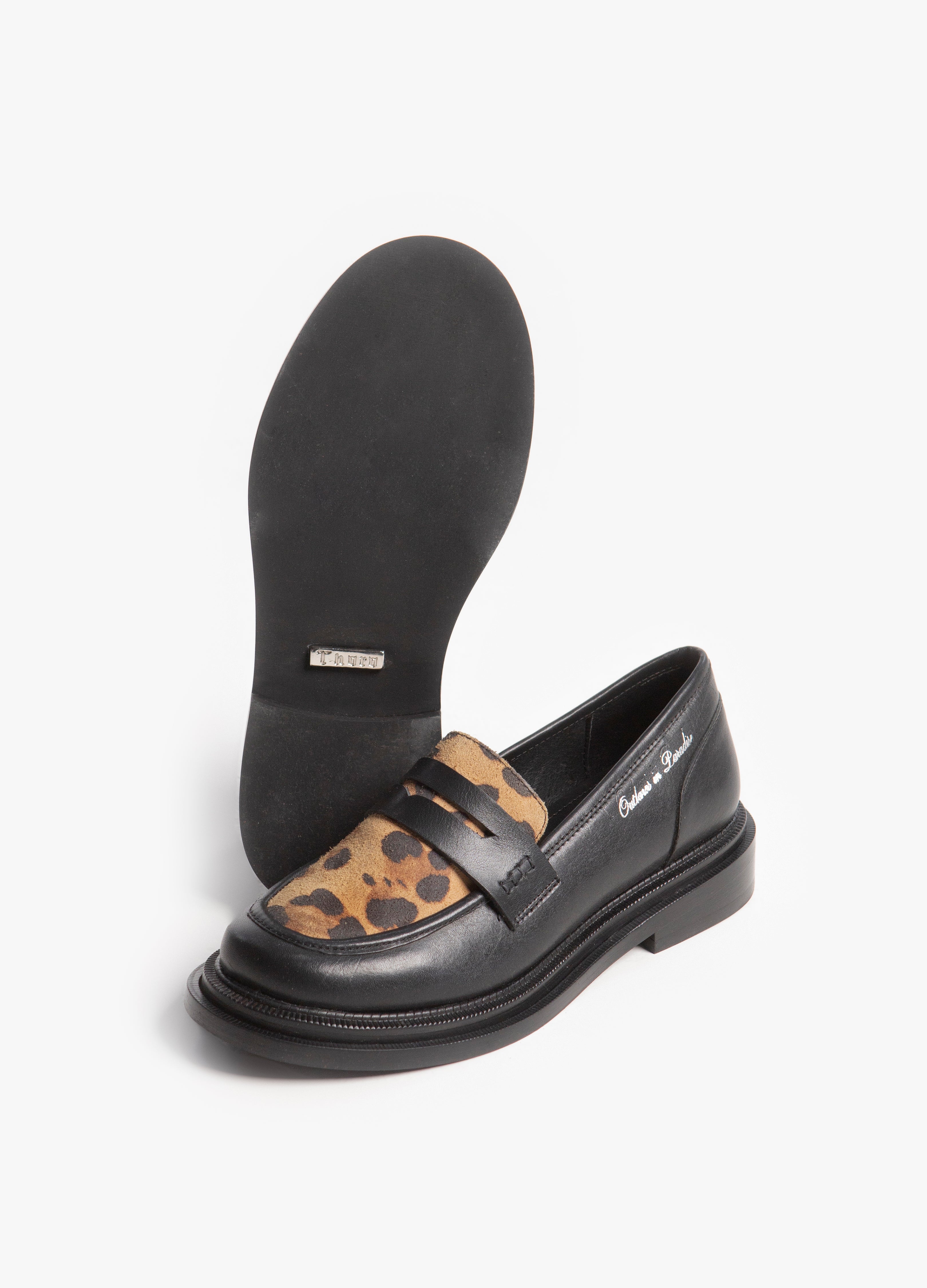 Loafers (Mocasines) fabricados en piel color negro con suela chunky, con chinela en piel gamuza con acabado de jaguar y la frase outlaws in paradise troquelada en plateado en el lateral