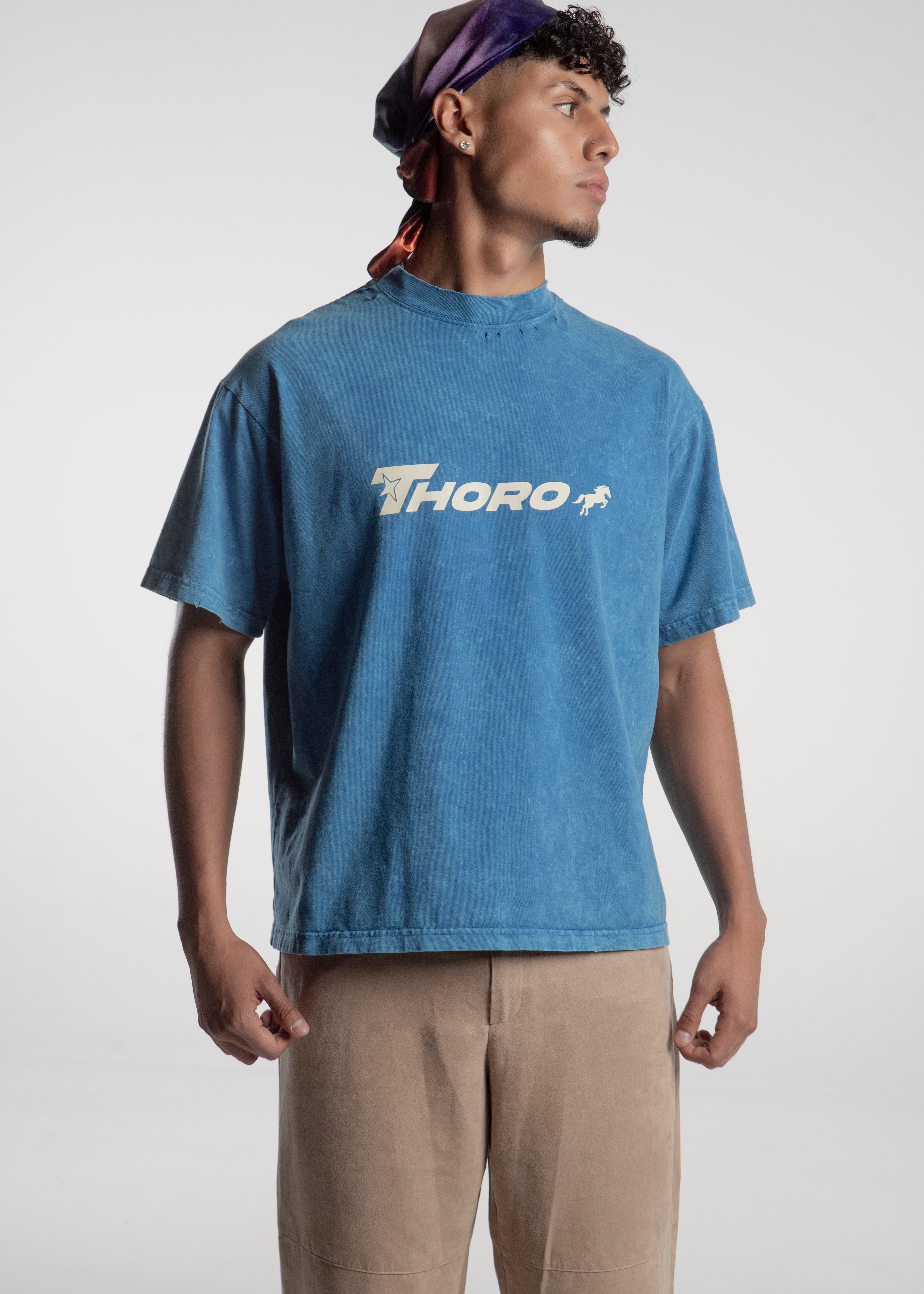 Playera azul acabado acid washed de corte boxy fabricada en 100% algodón con la marca de Thoro acompañada de un caballo en el pecho y en la espalda la t junto al caballo con el subtítulo "Your Lucky Number is 650" impresa en serigrafía color blanco.