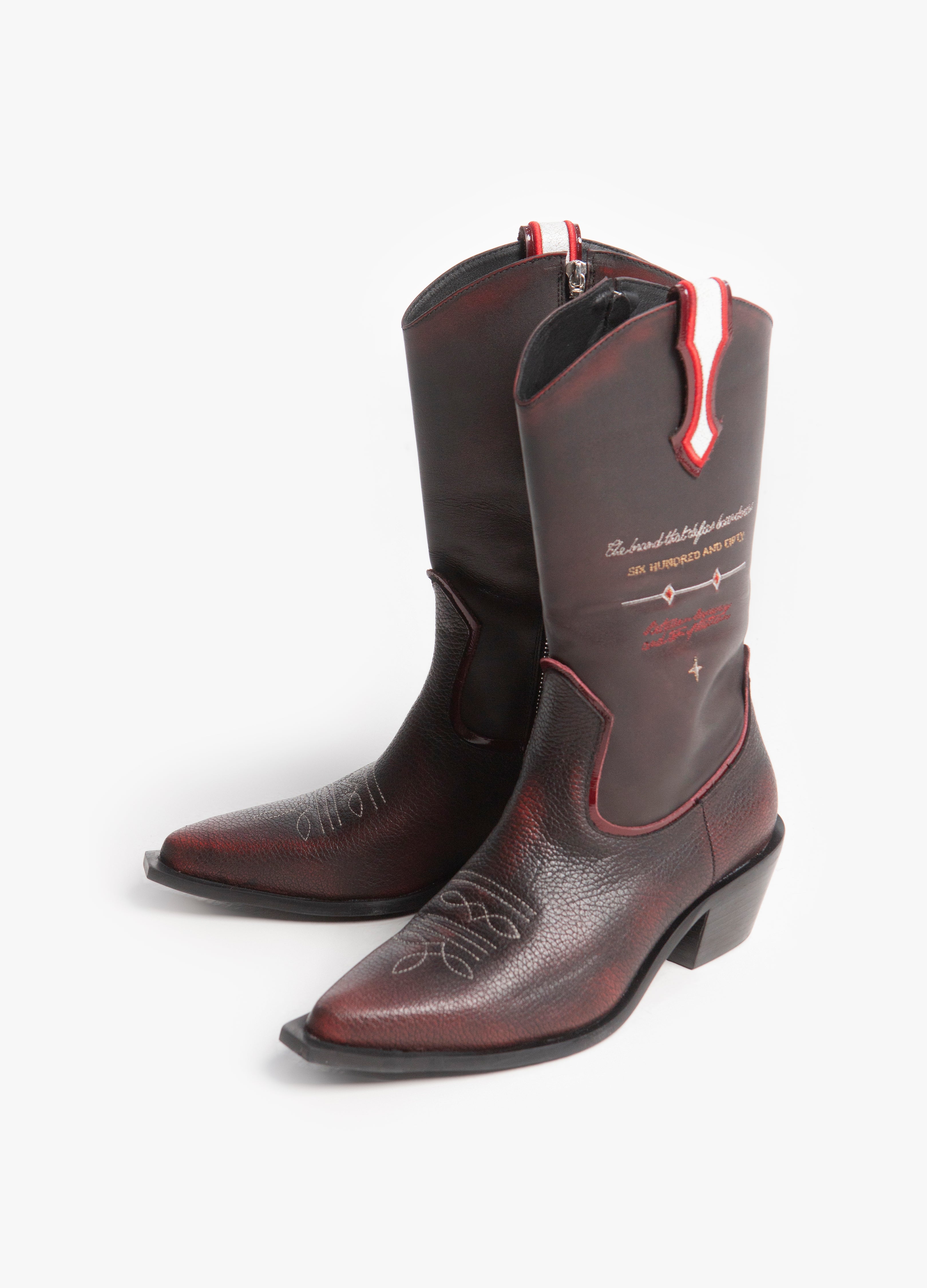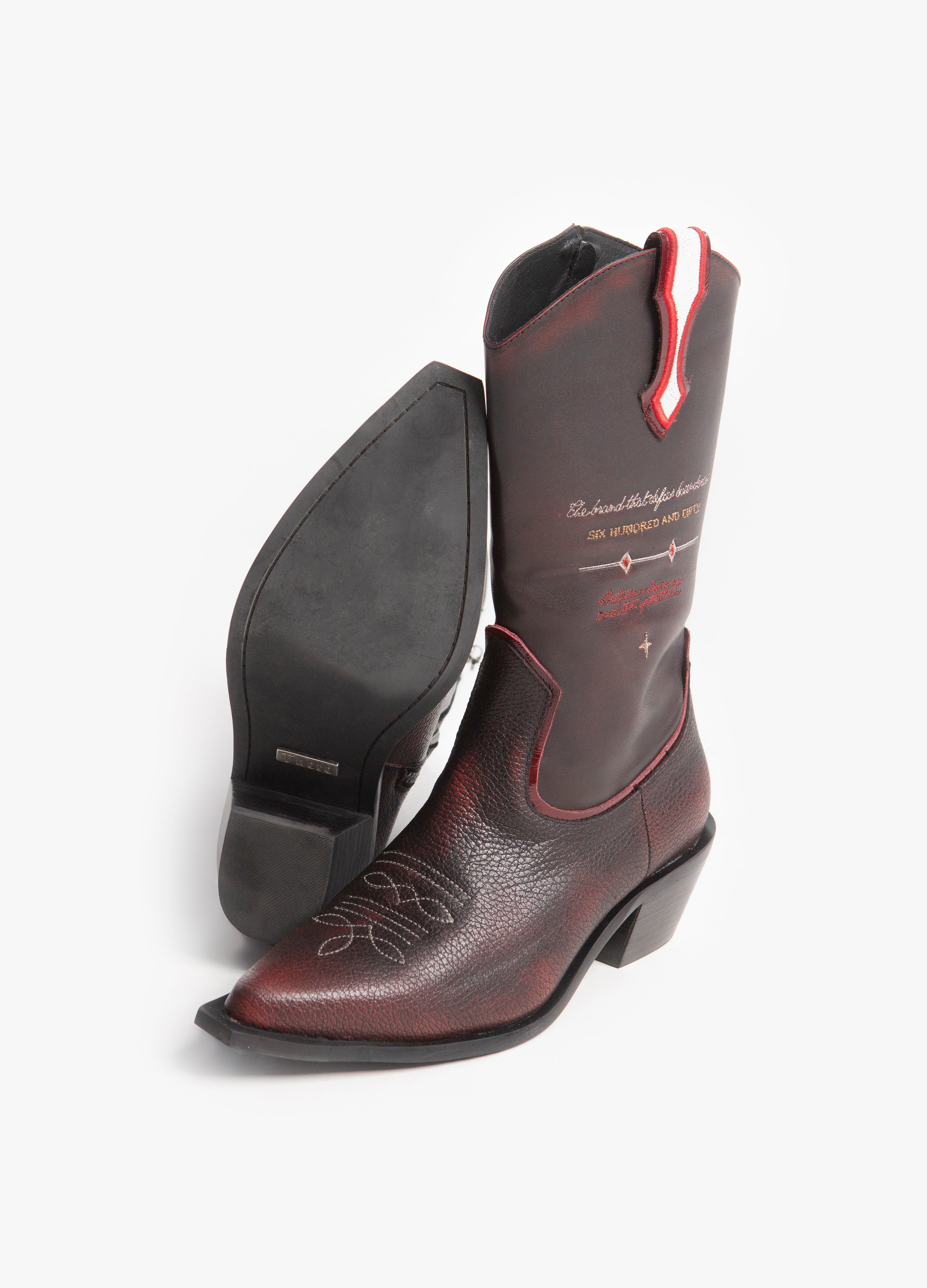 Bota vaquera fabricada en piel de res de alta calidad en una combinación de color negro y vino con bordados en el tubo.