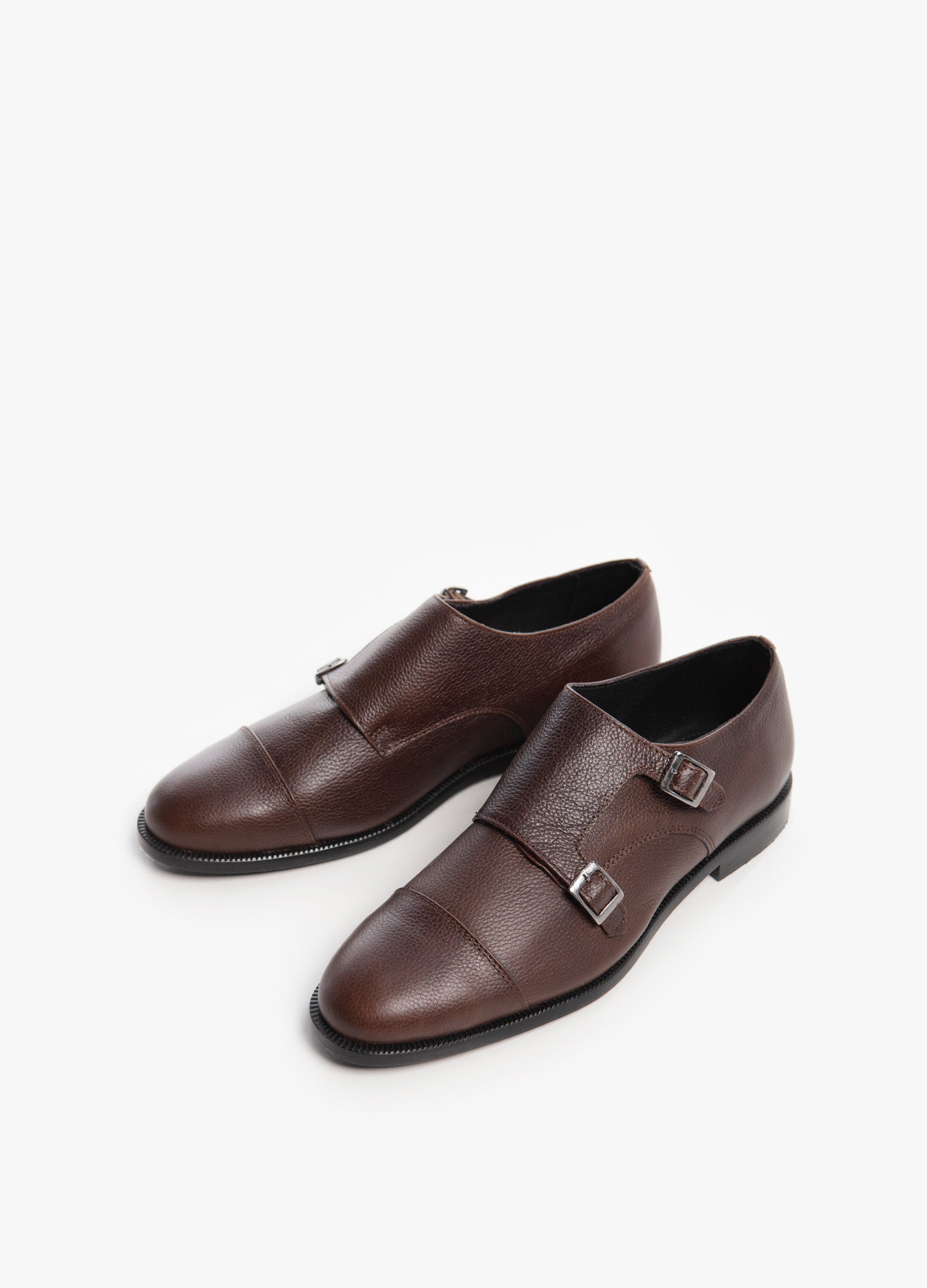 Buckle shoe made of brown cowhide.