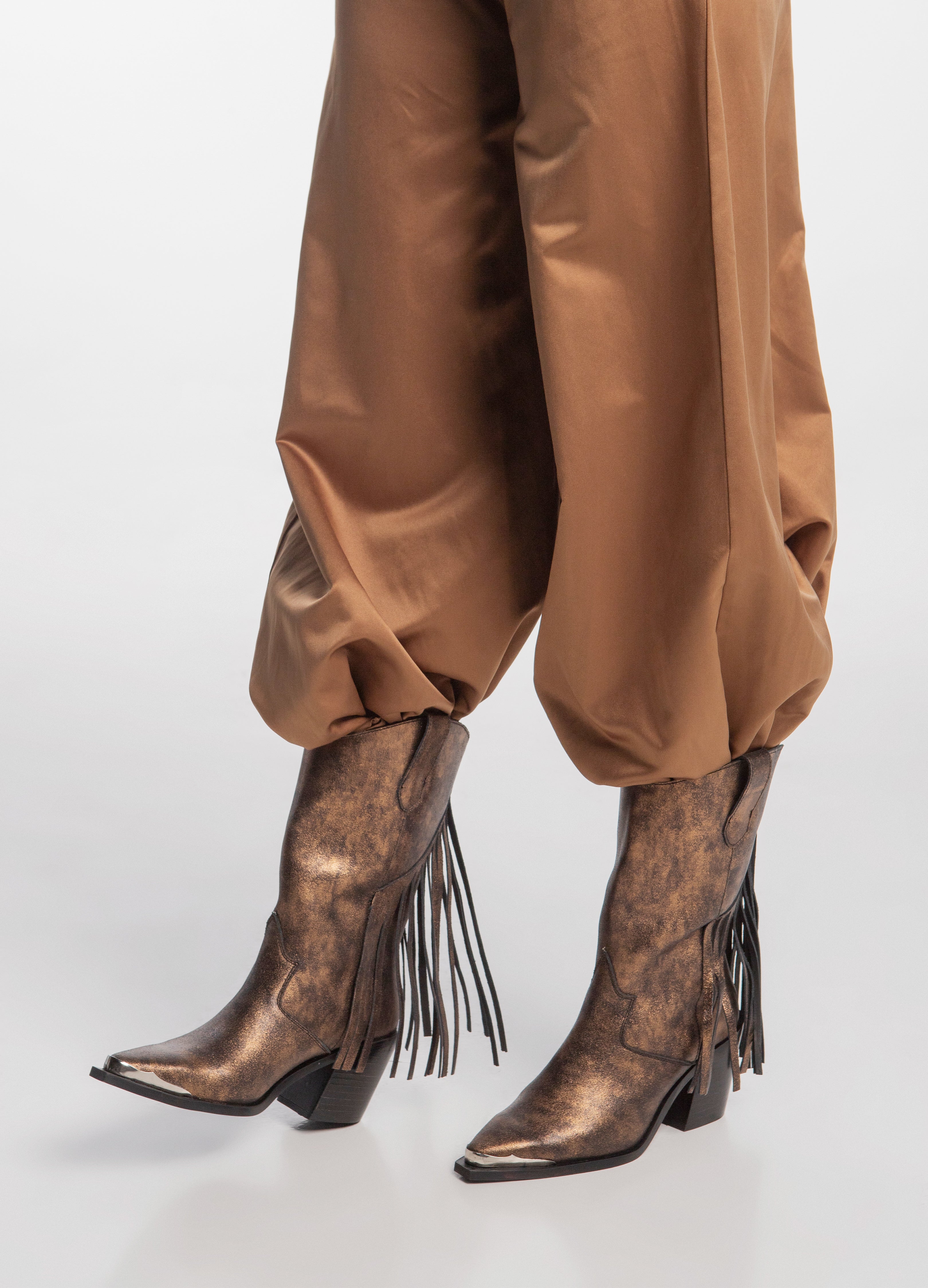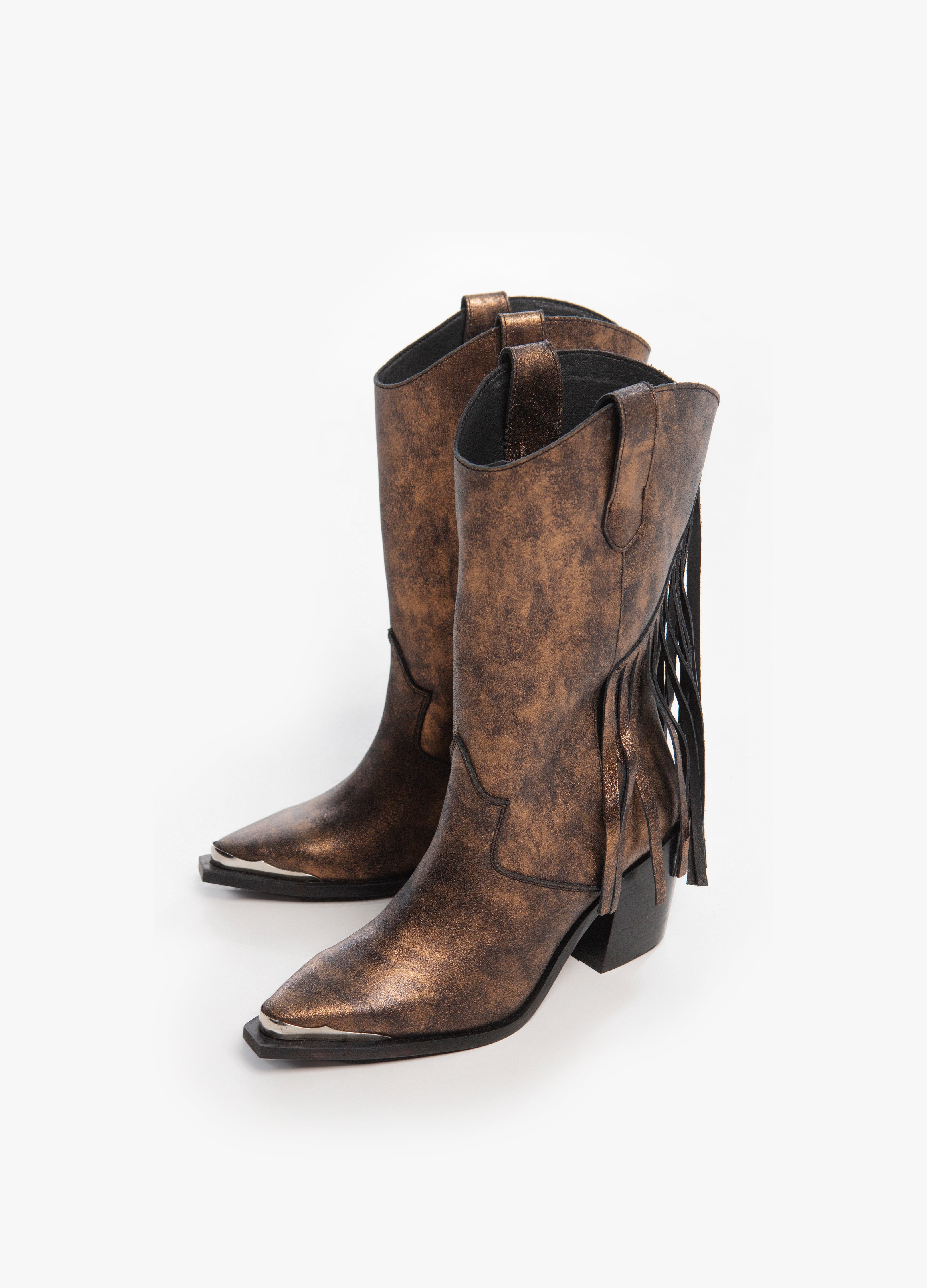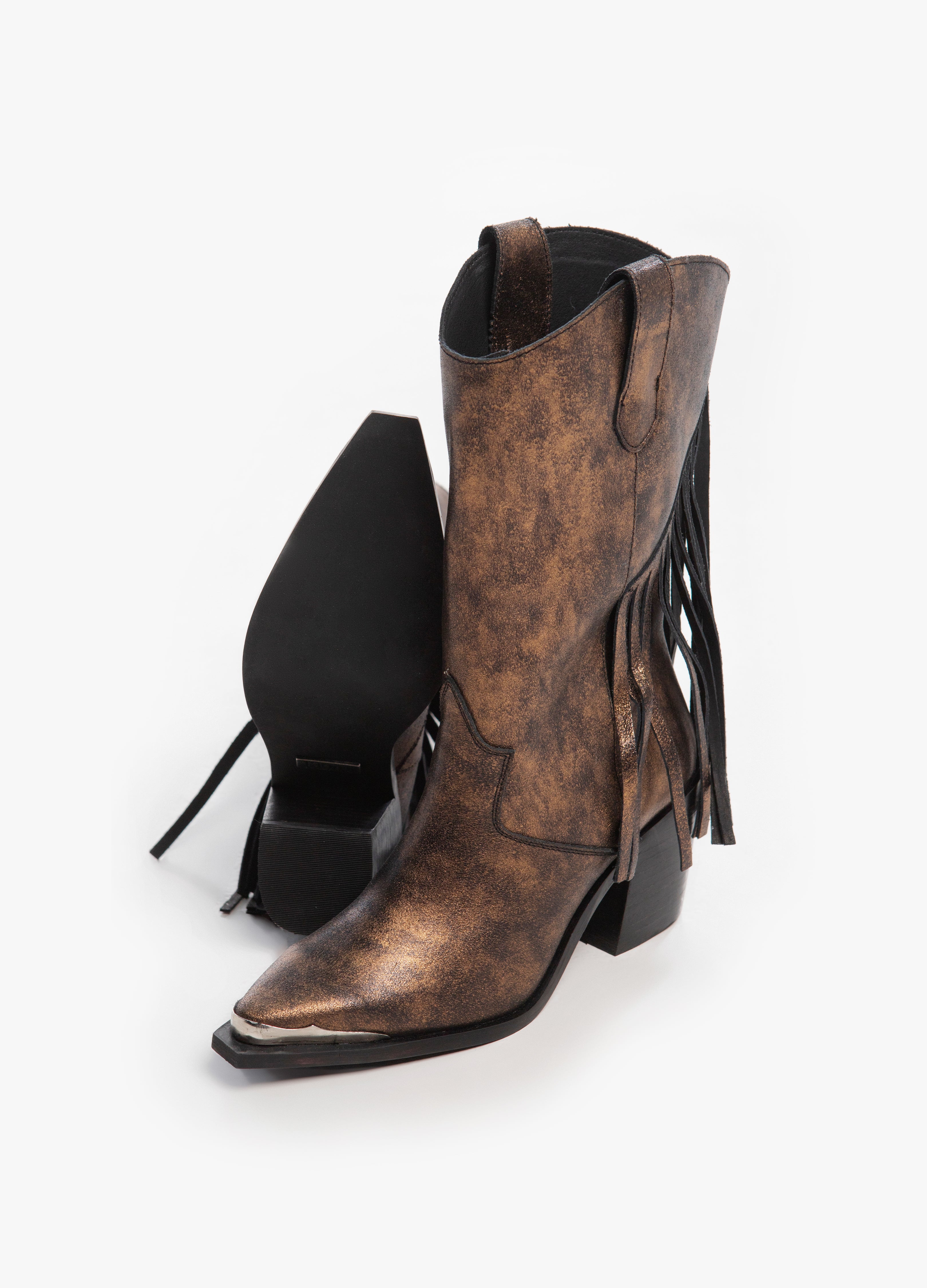 Cowboy boot (high tube) made of cowhide with a metallic bronze finish, Cuban heel, metallic toe and characteristic barbs on the back.