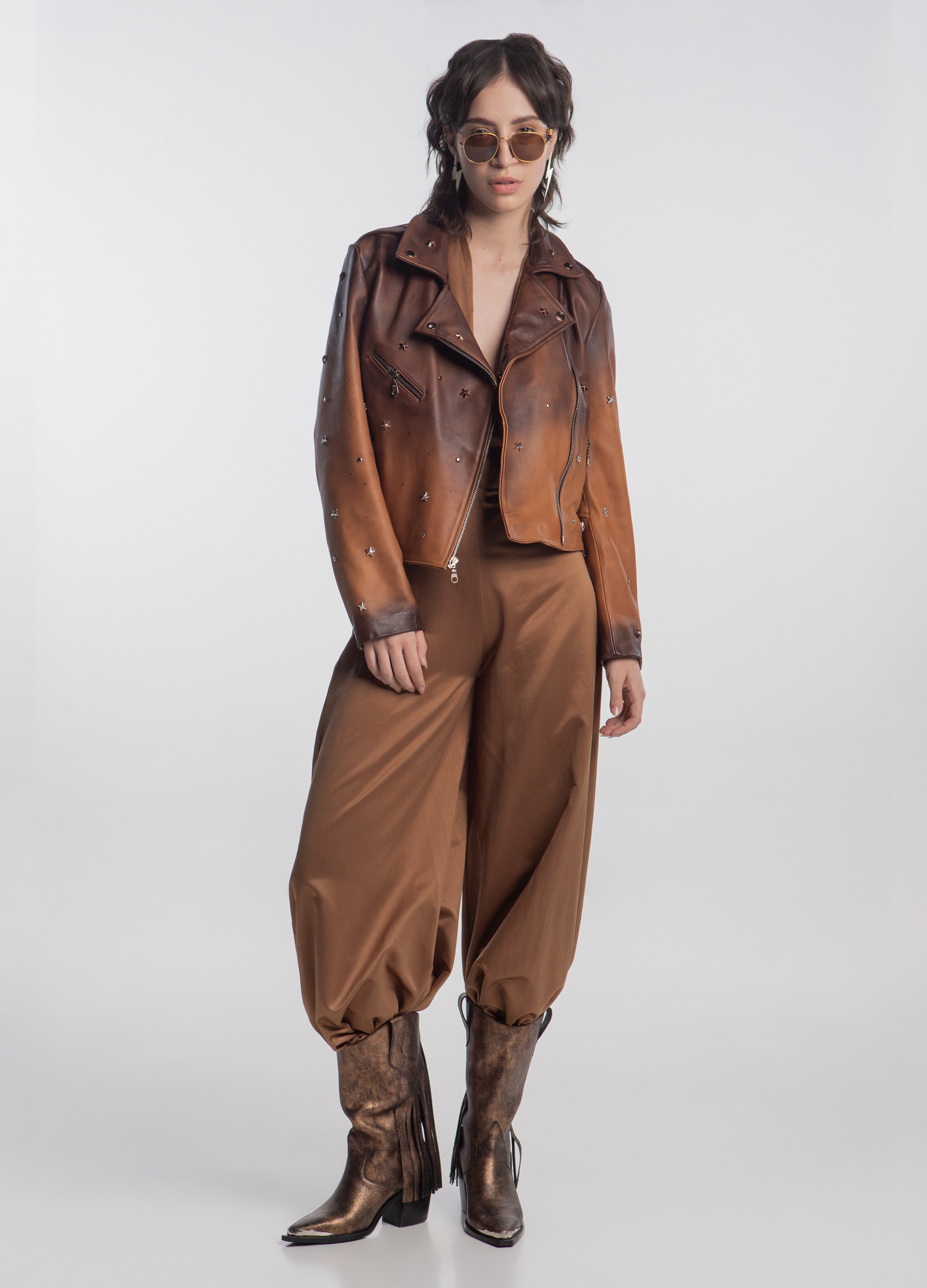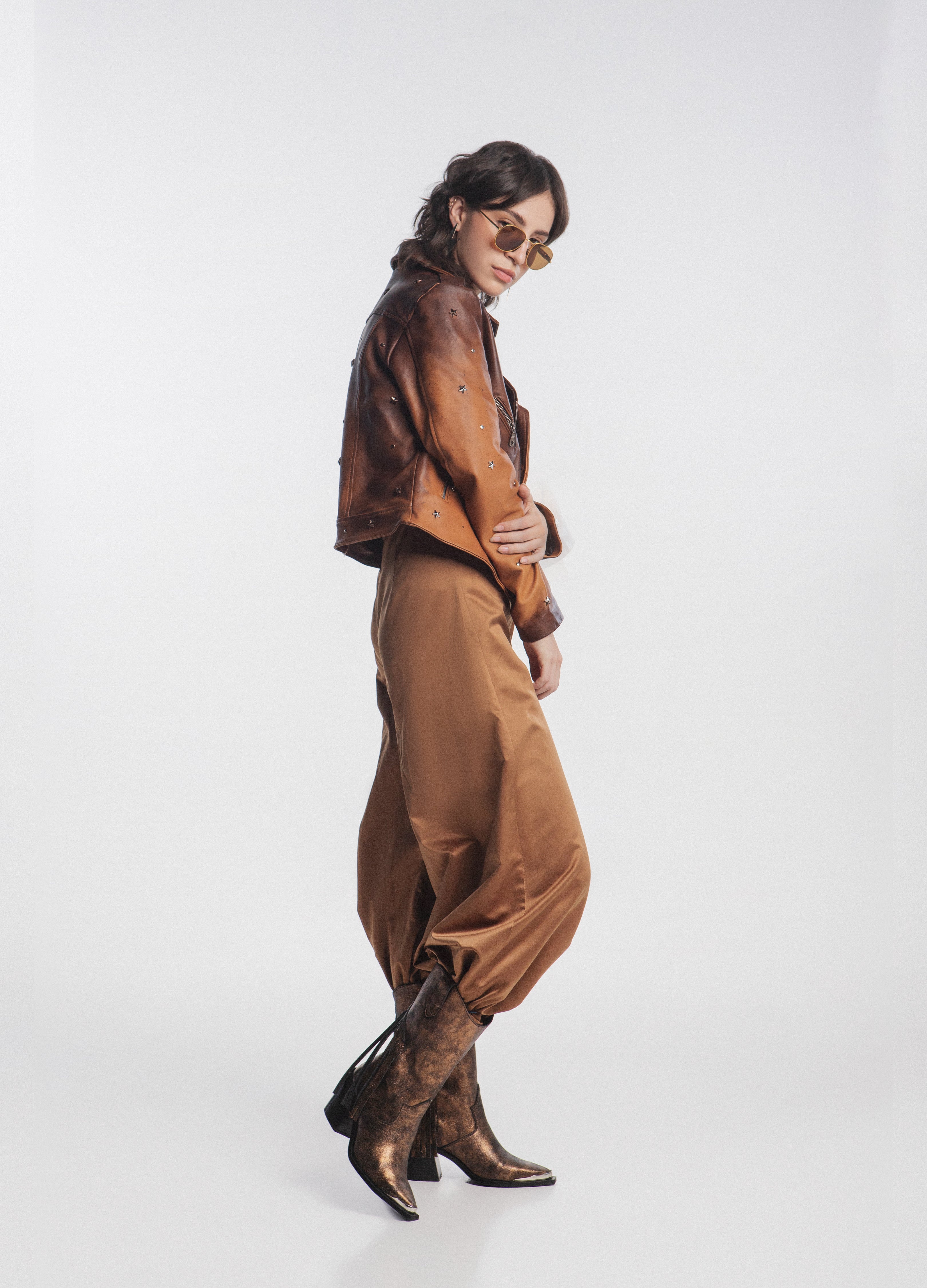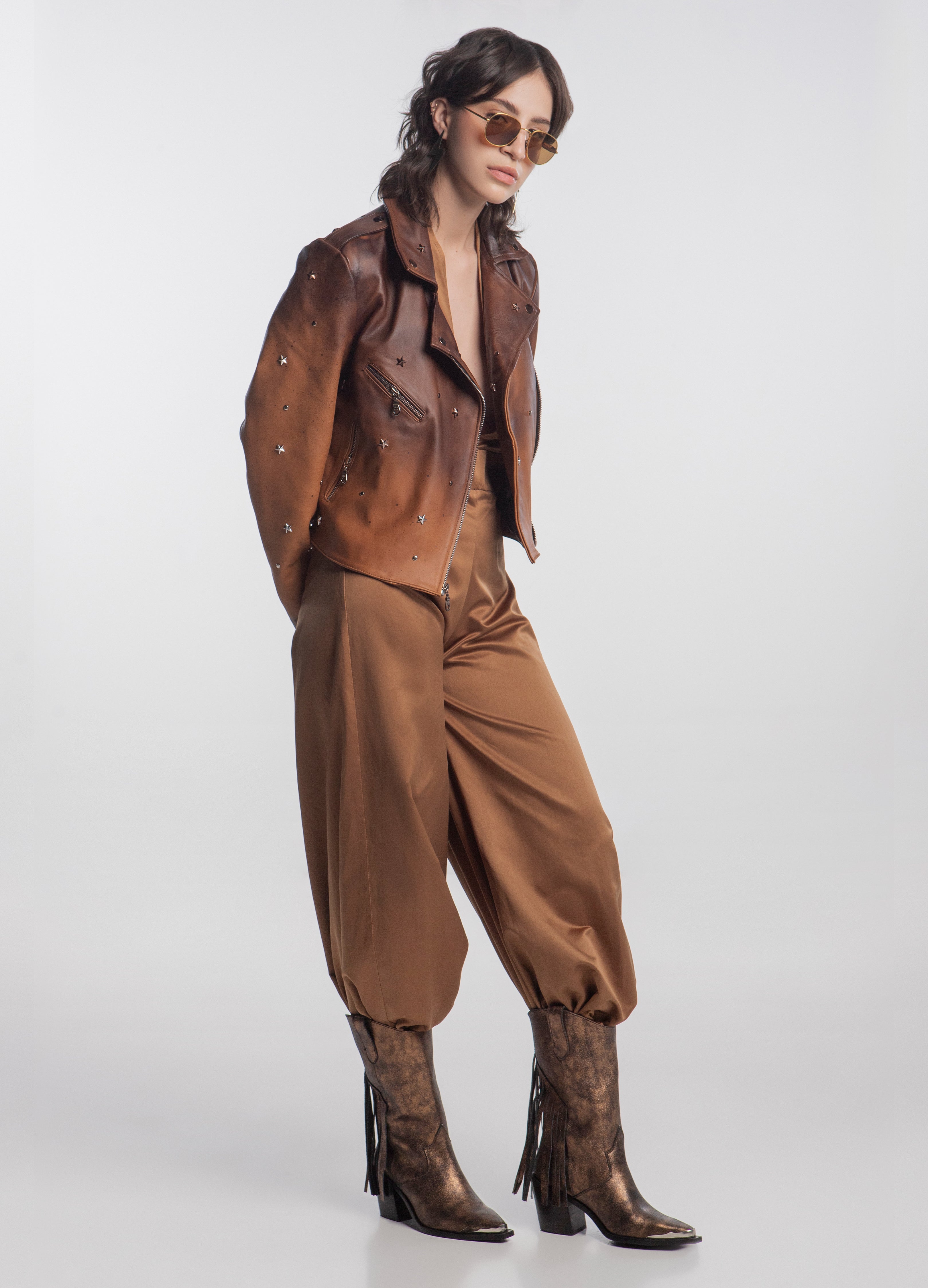 Cowboy boot (high tube) made of cowhide with a metallic bronze finish, Cuban heel, metallic toe and characteristic barbs on the back.